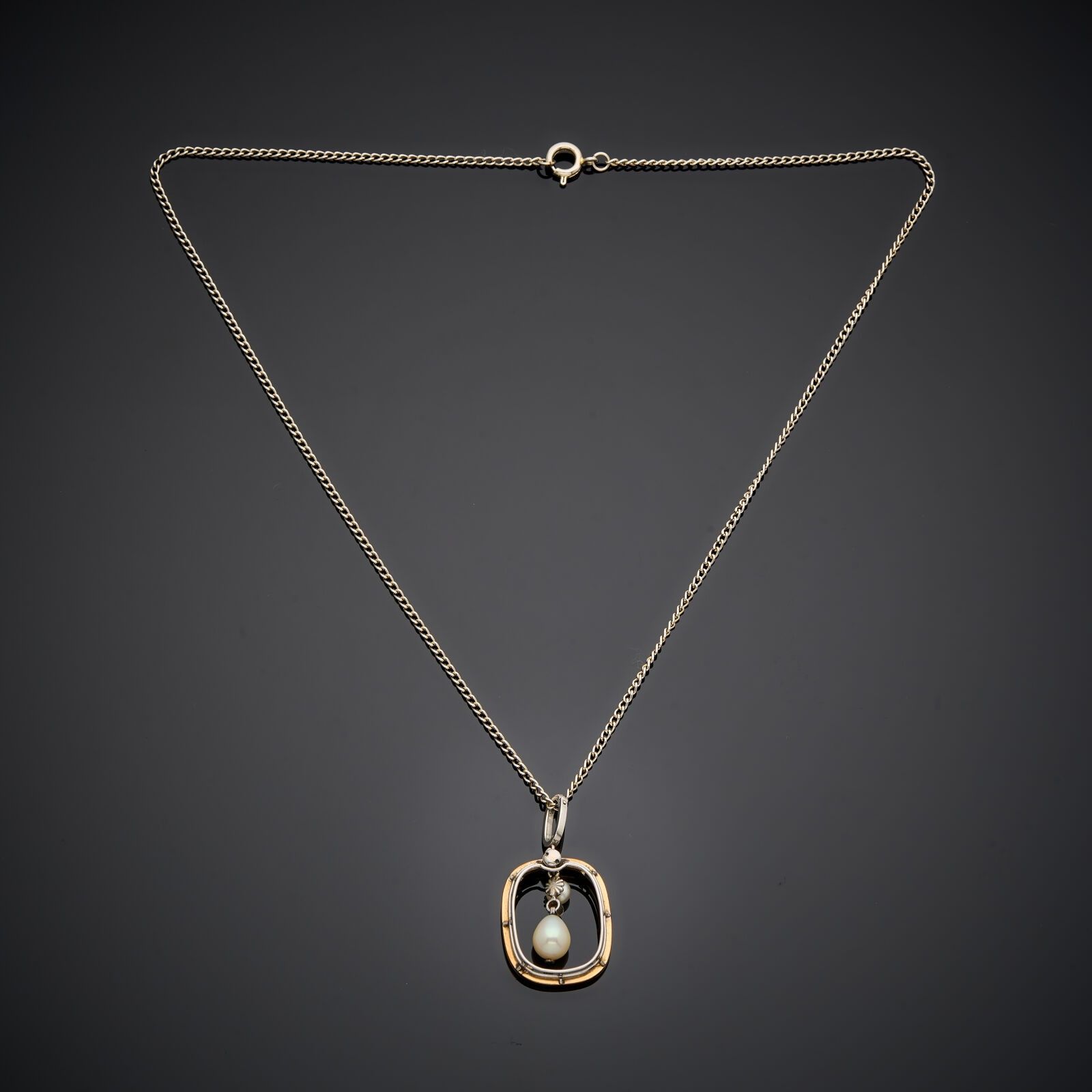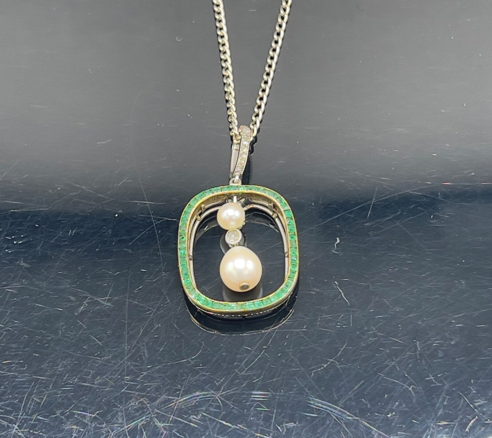 18 k (750 thousandths) white gold chain and 18 k (750 thousandths) yellow gold and platinum pendant set with calibrated emeralds, rose-cut diamonds and pearls.