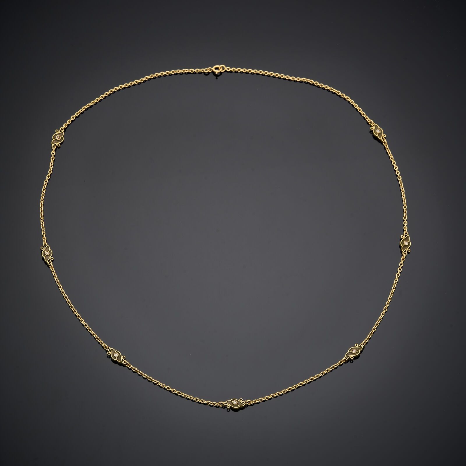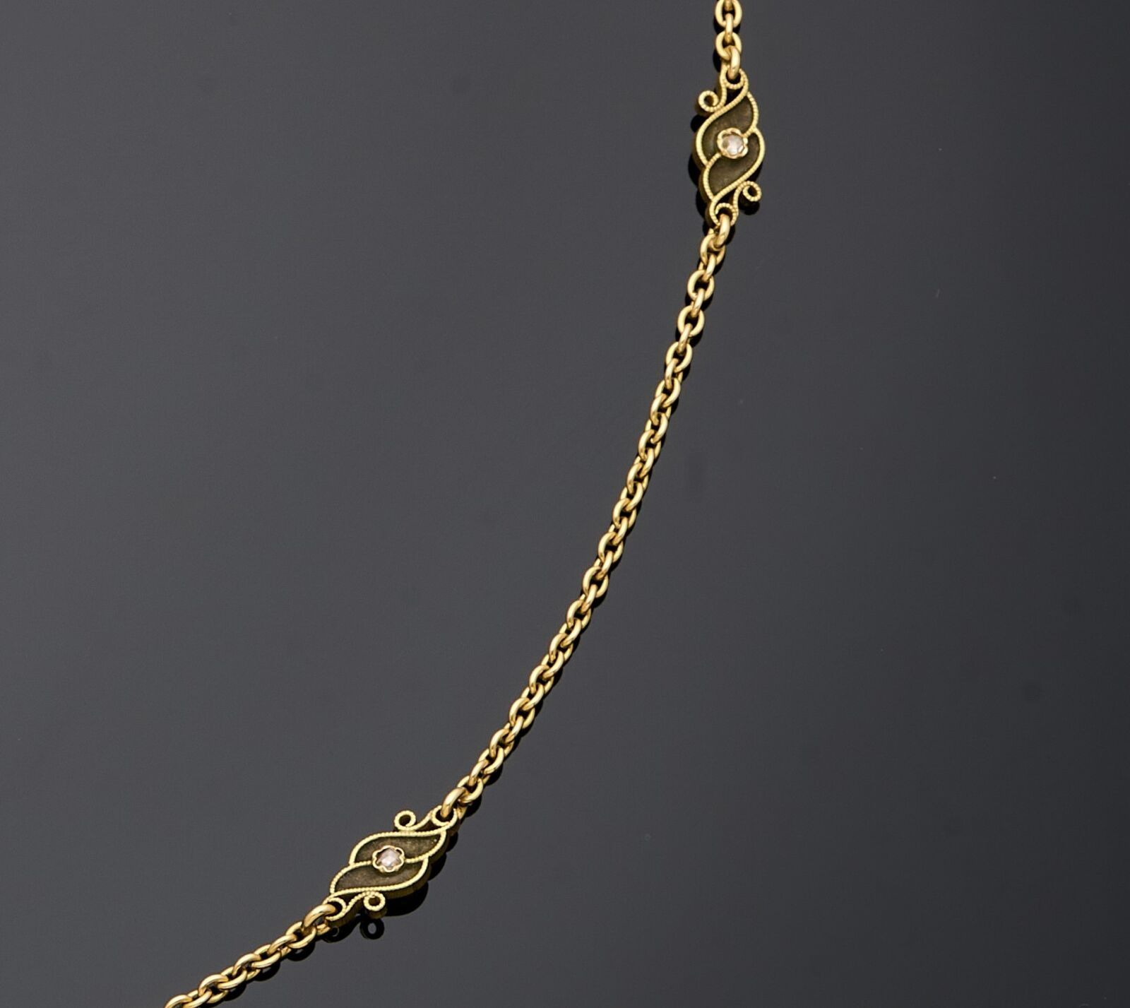 18 k (750 thousandths) yellow gold chain necklace with green enamelled motifs adorned with rose-cut diamonds.
