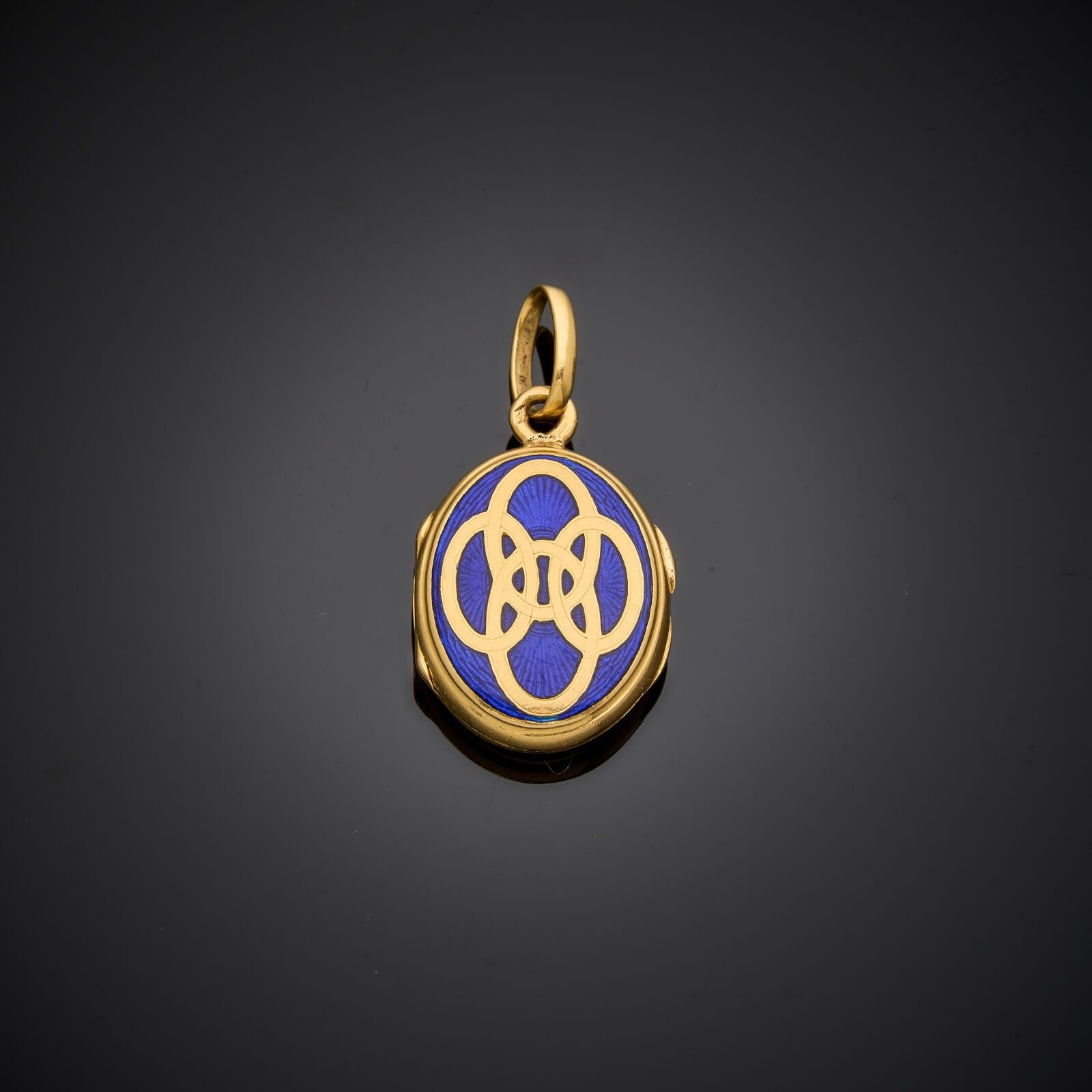 Reliquary pendant in 18 k (750 thousandths) yellow gold with blue enamel decoration of four intertwined circles. (glass inside)