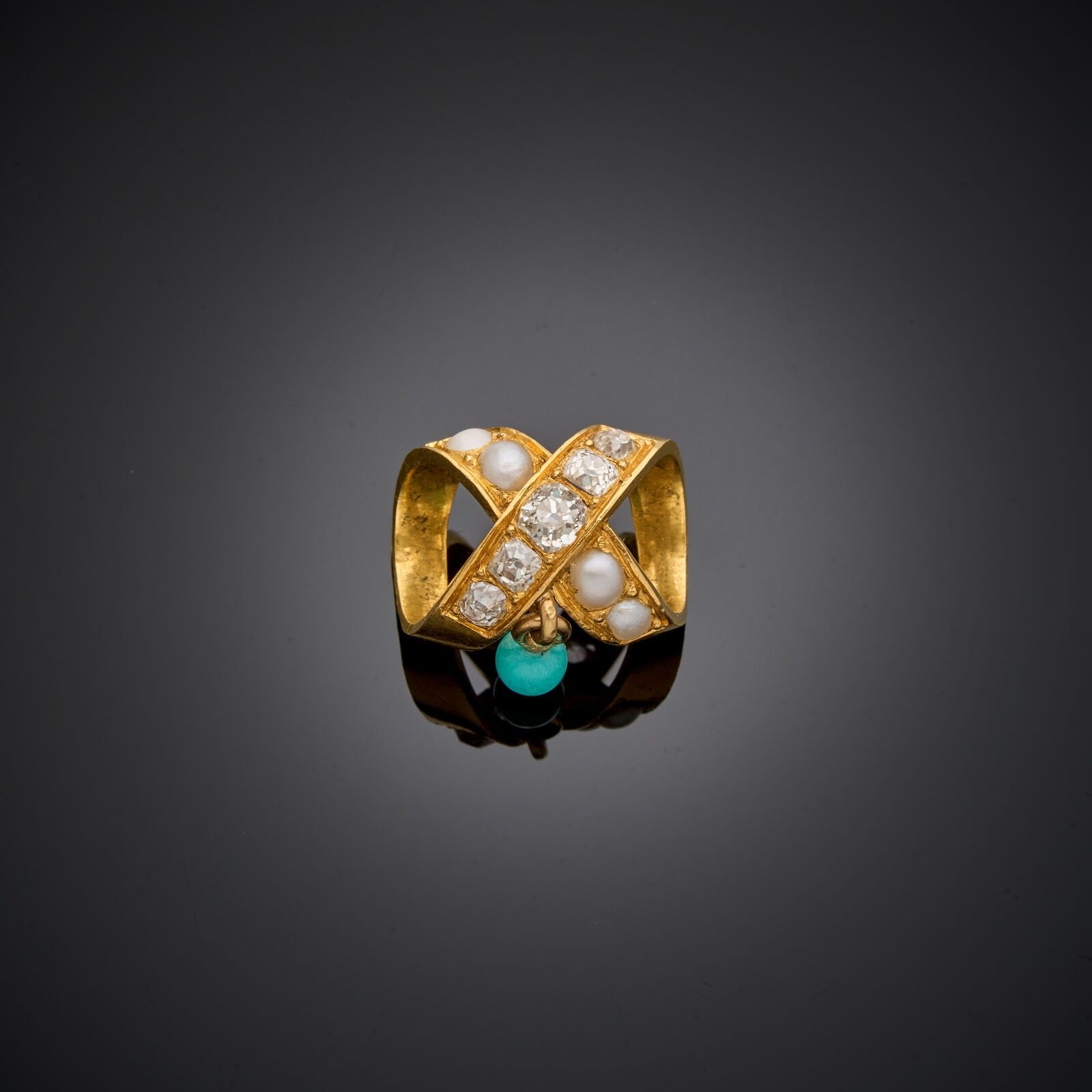 Scarf knot in 18 k (750 thousandths) yellow gold set with old-cut diamonds and pearls.