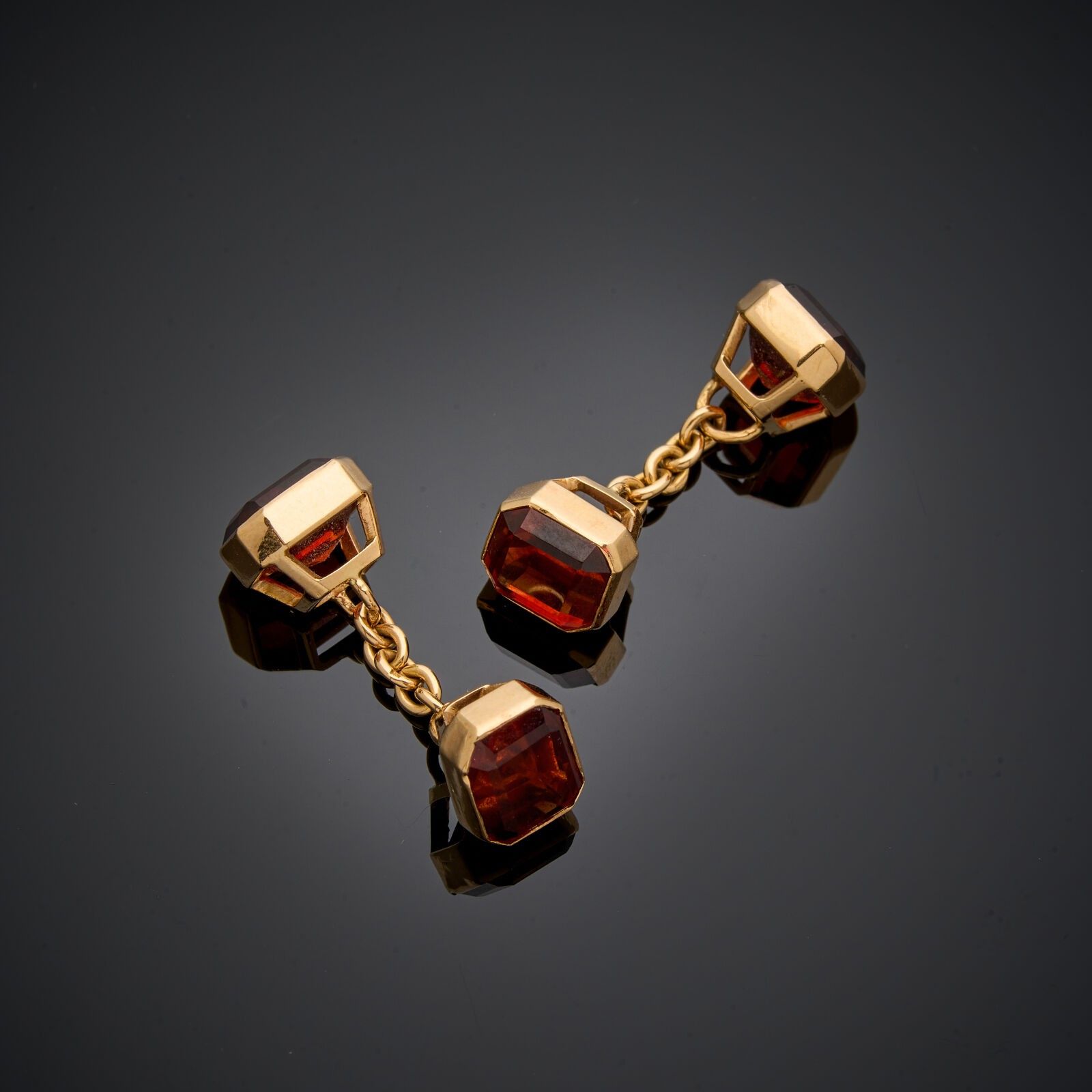 Pair of 18k (750 thousandths) yellow gold chain cufflinks, each with a hard orange stone.