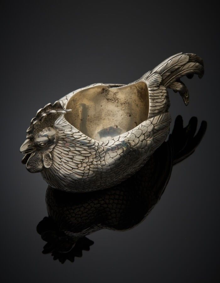 Silver egg cup, 800 thousandths, in the shape of a rooster au naturel, the feathers finely chased