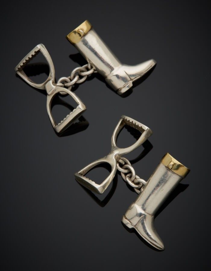 LINKS OF LONDON - Pair of silver and vermeil cufflinks, decorated with a riding boot and facing stirrups.