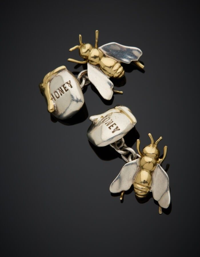 LINKS OF LONDON - Pair of silver and vermeil 800 thousandths cufflinks, decorated with a bee on one side and a honeypot on the other, inscribed Honey.