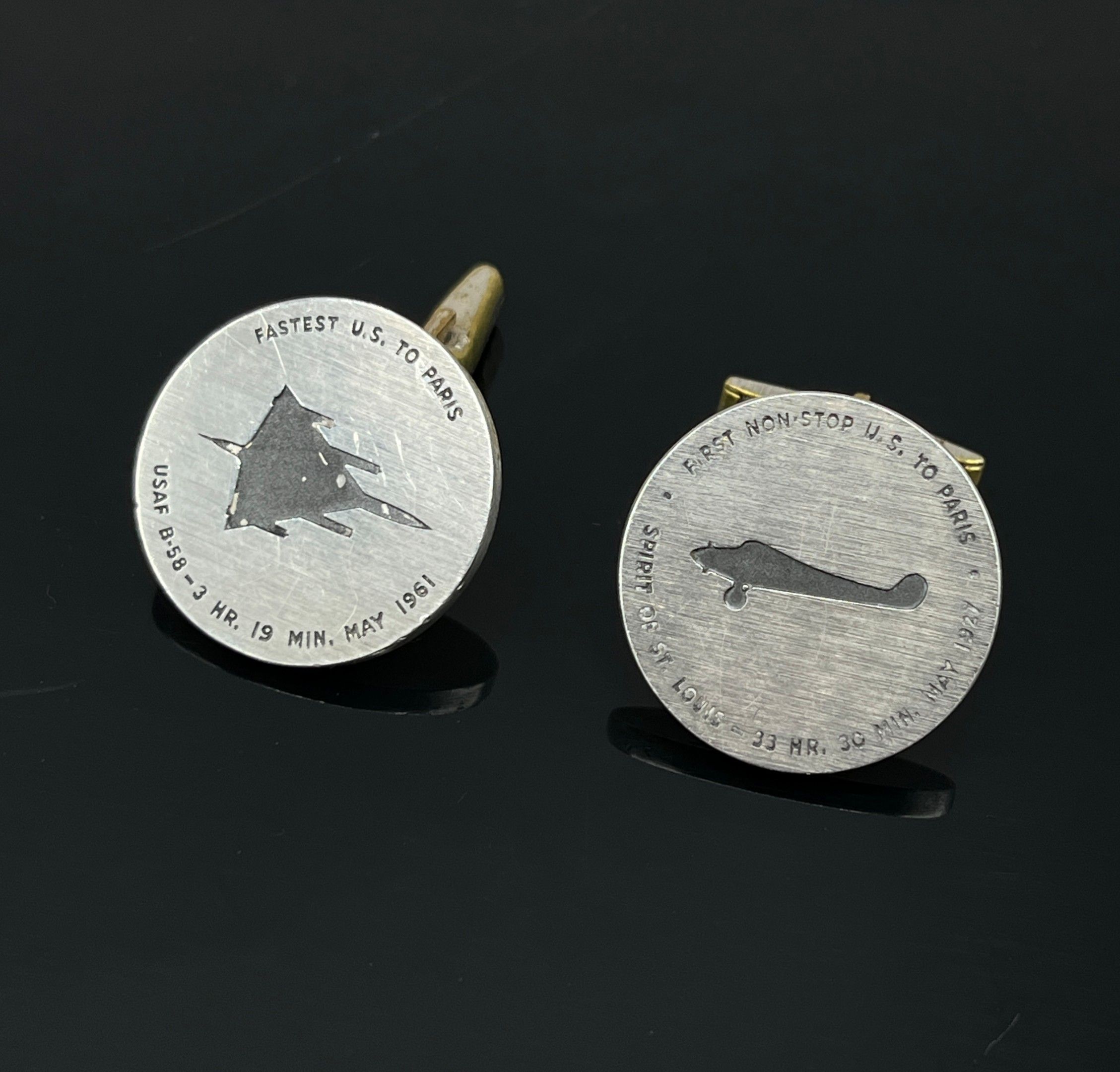 Pair of cufflinks commemorating Paris/United States flights, in 800 thousandths silver and metal, decorated with Spirit of Saint Louis aircraft and a B58.