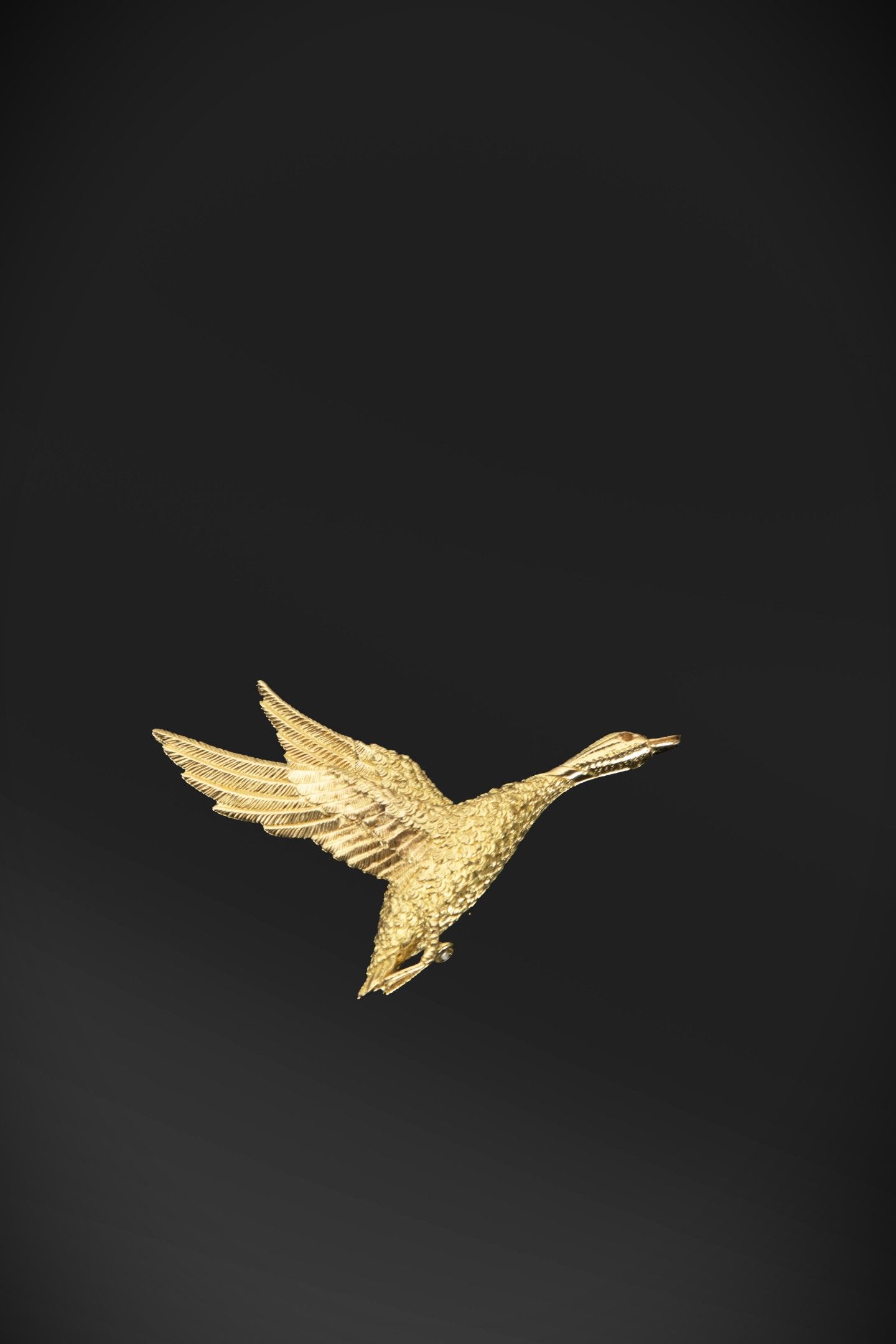 HERMES Paris - Duck brooch "en vol" in 18k yellow gold (750 thousandths) with natural chased decoration.