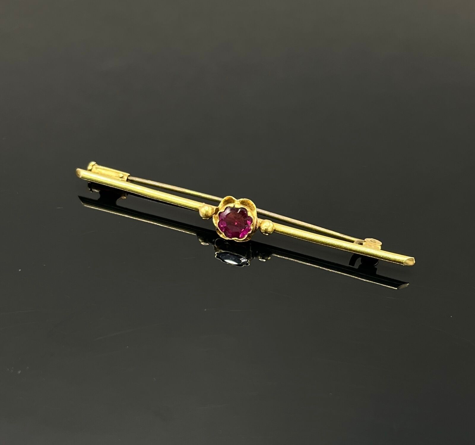 Barette brooch in 18k (750 thousandths) yellow gold set with a small red stone, metal needle.