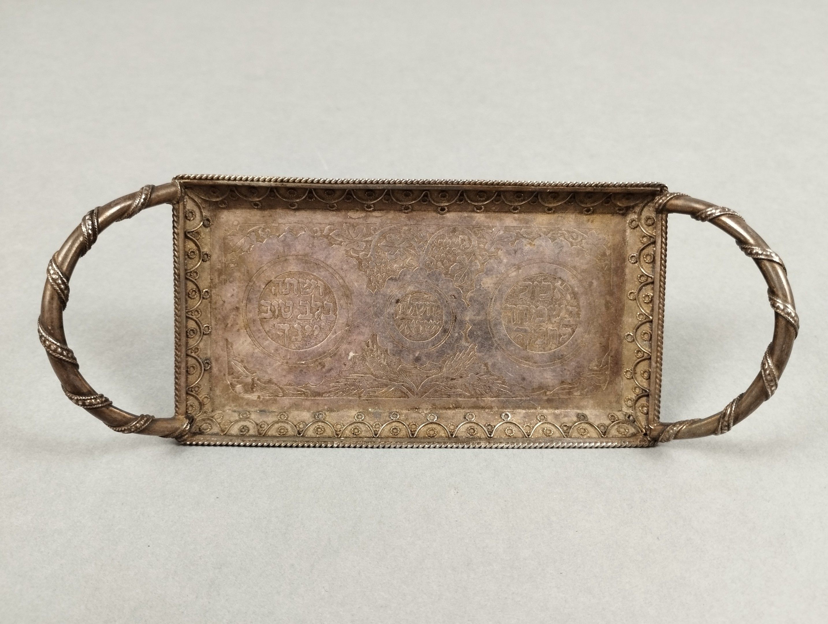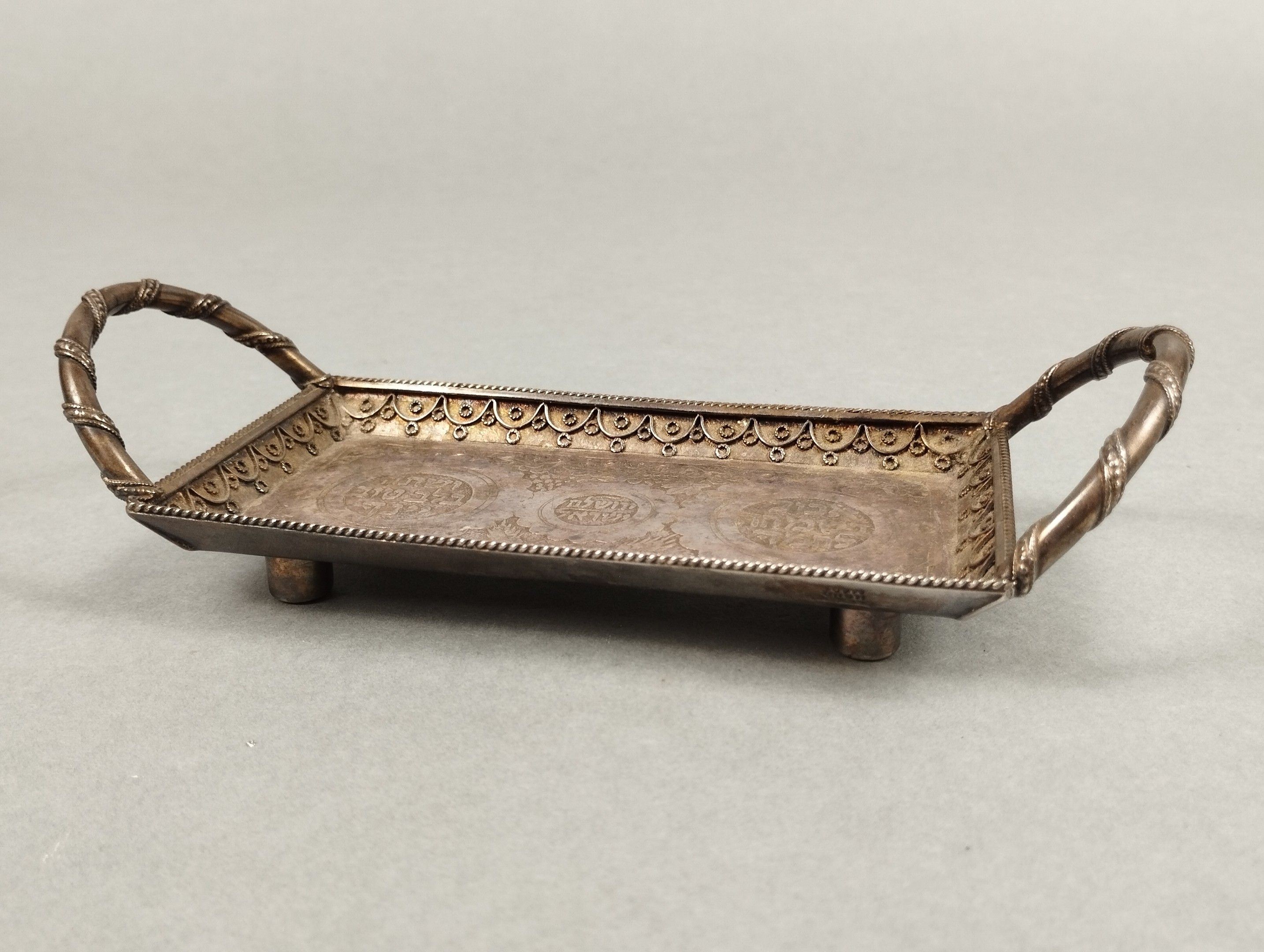 [JUDAICA]. BEZALEL, Jerusalem. Silver bowl (925/00) used to hold the kiddush glass on Shabbat. The inscriptions read "drink heartily", "Israel" and "eat joyfully". 16.2 x 6.5 cm. Weight: 74 g.