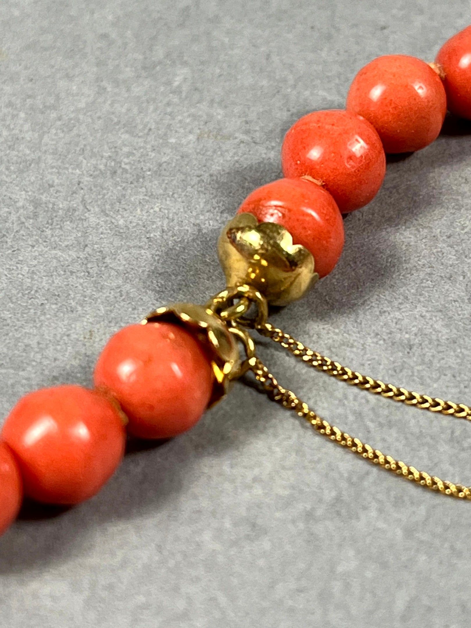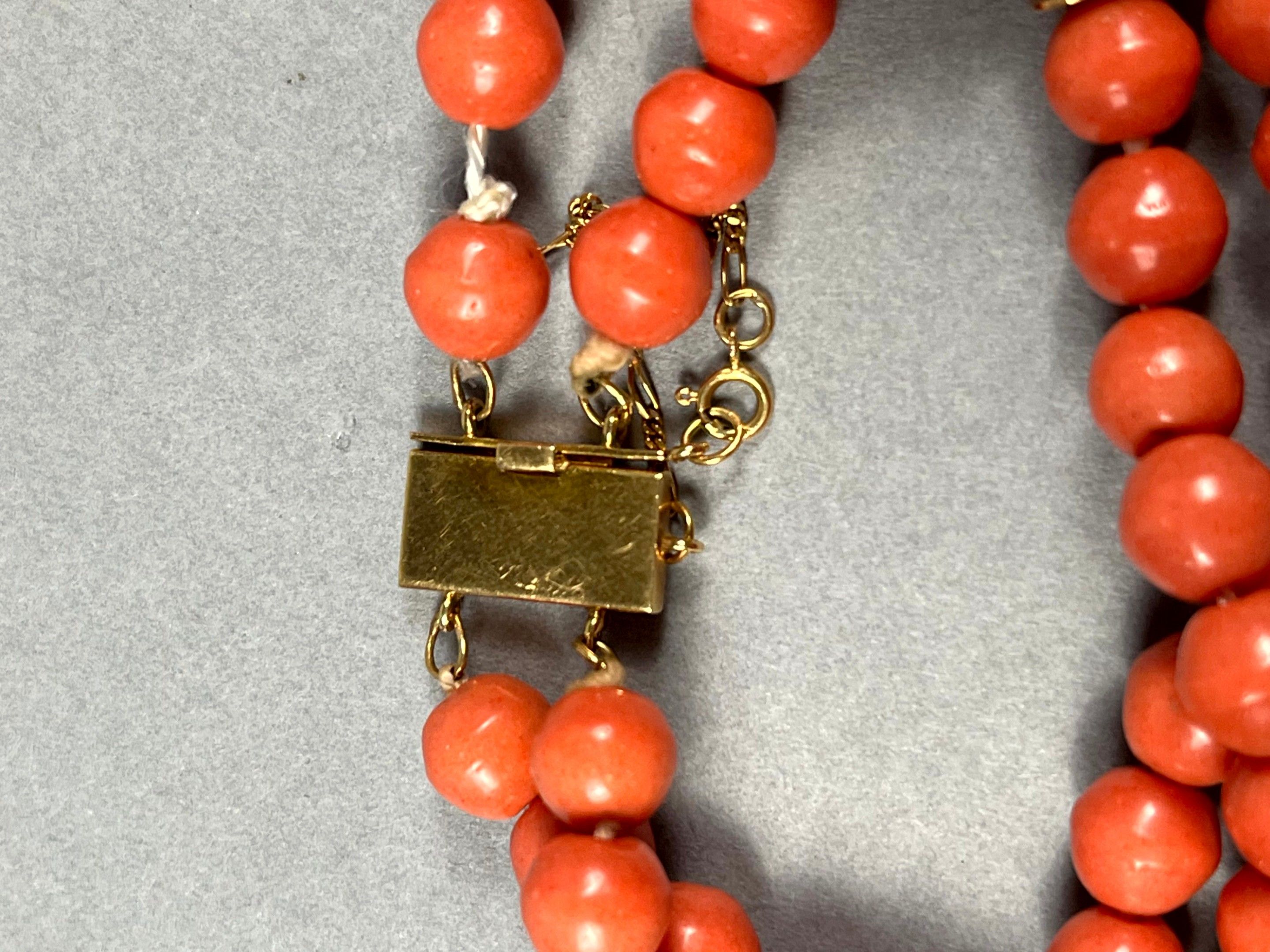 Set consisting of a necklace and a double-row bracelet with facetted glass beads imitating coral, mounted in yellow gold (750/00). Total gross weight: 92.6 g.