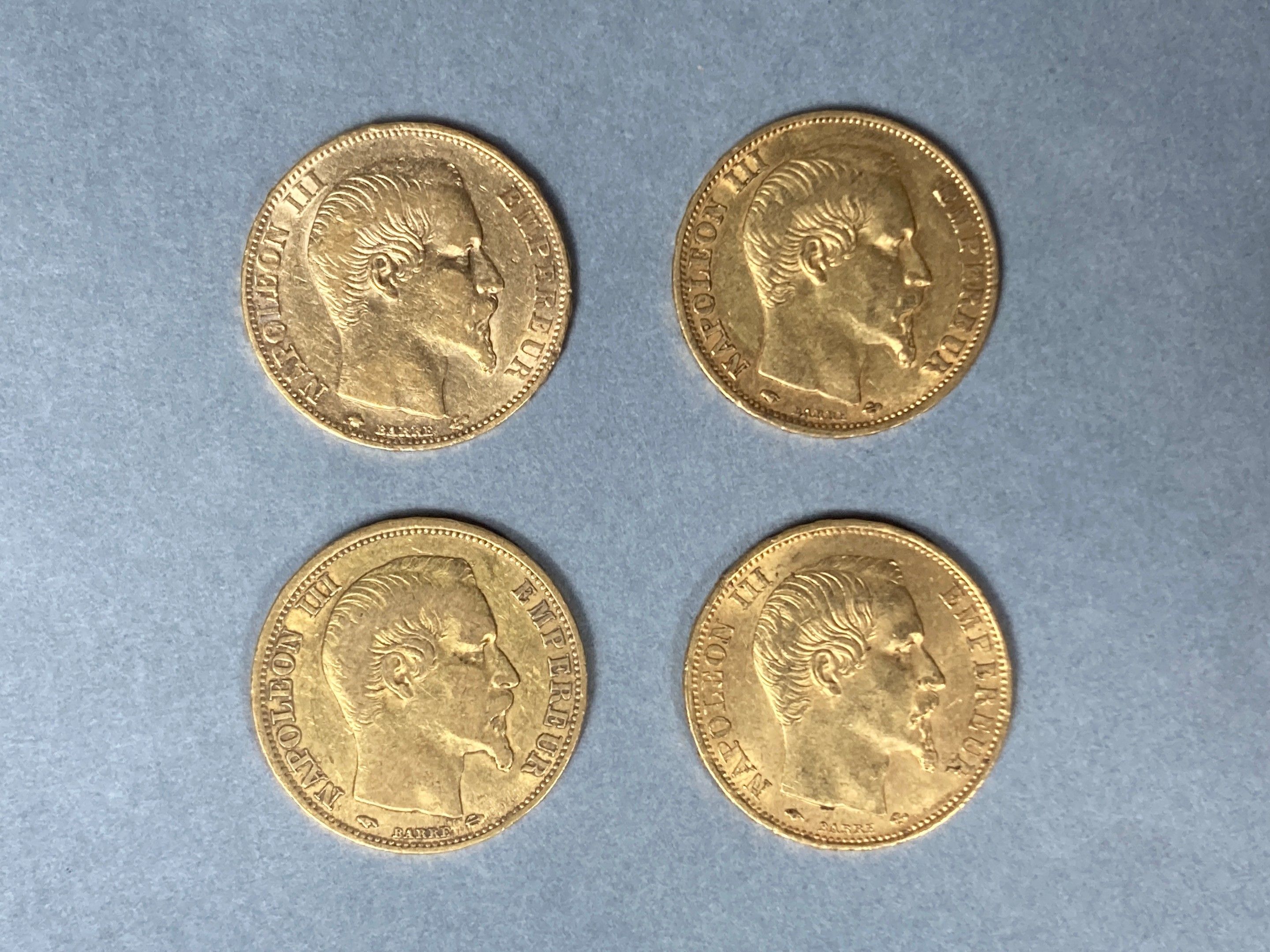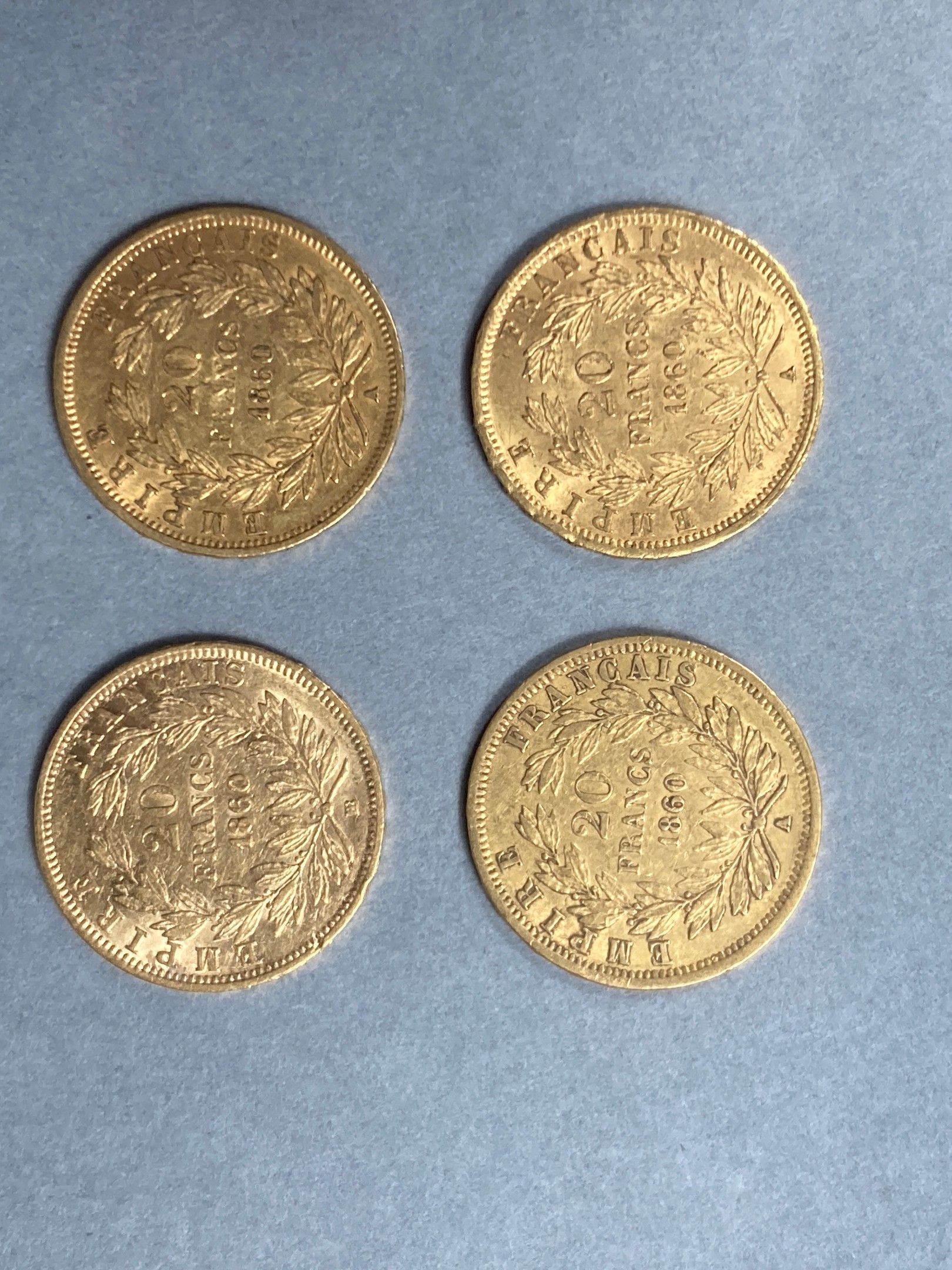 Reunion of 4 (four) 20 francs France, Napoléon III, gold coins, circa 1860. Sold by designation. Kept in a bank safe. Delivery by appointment.