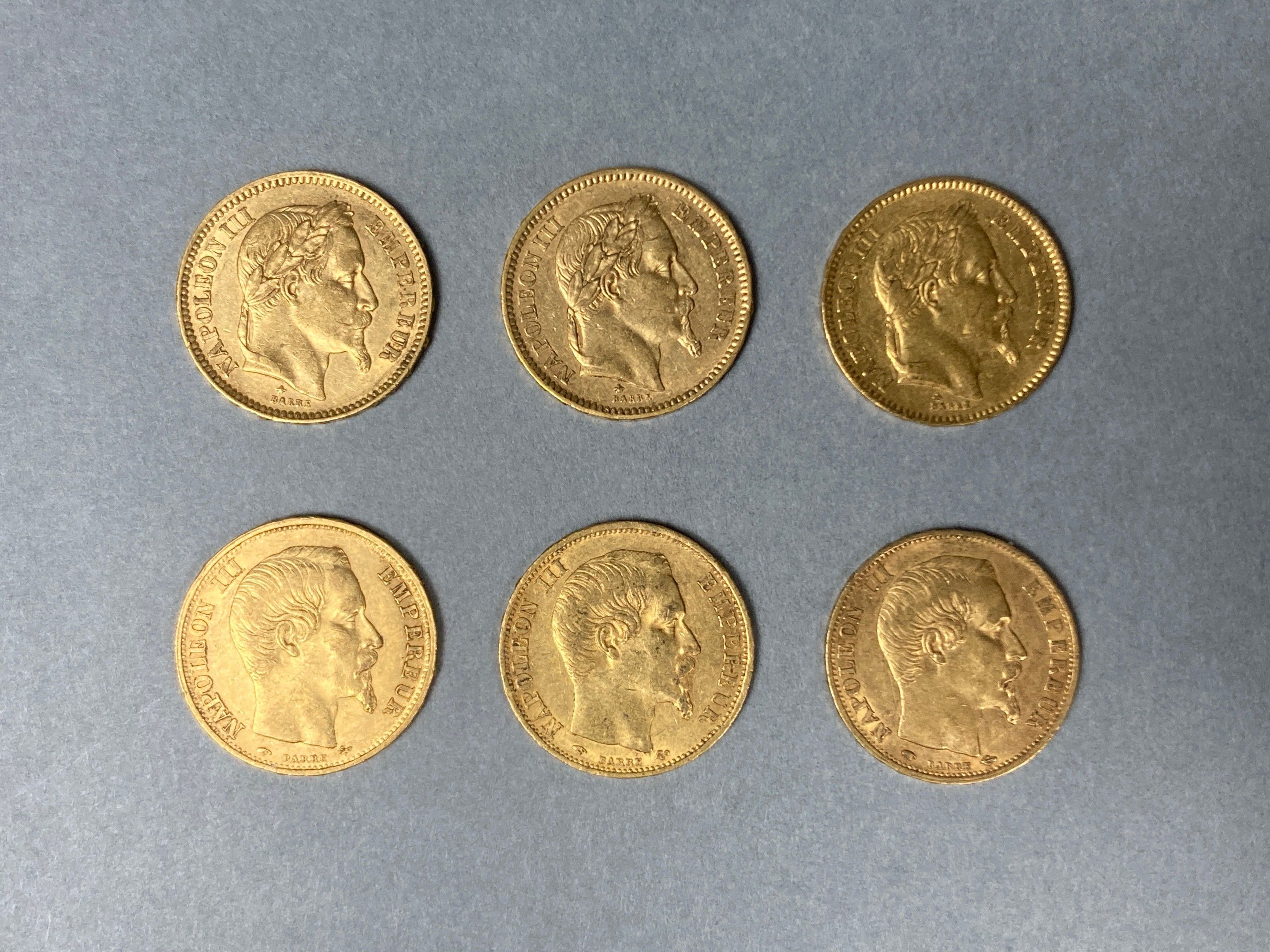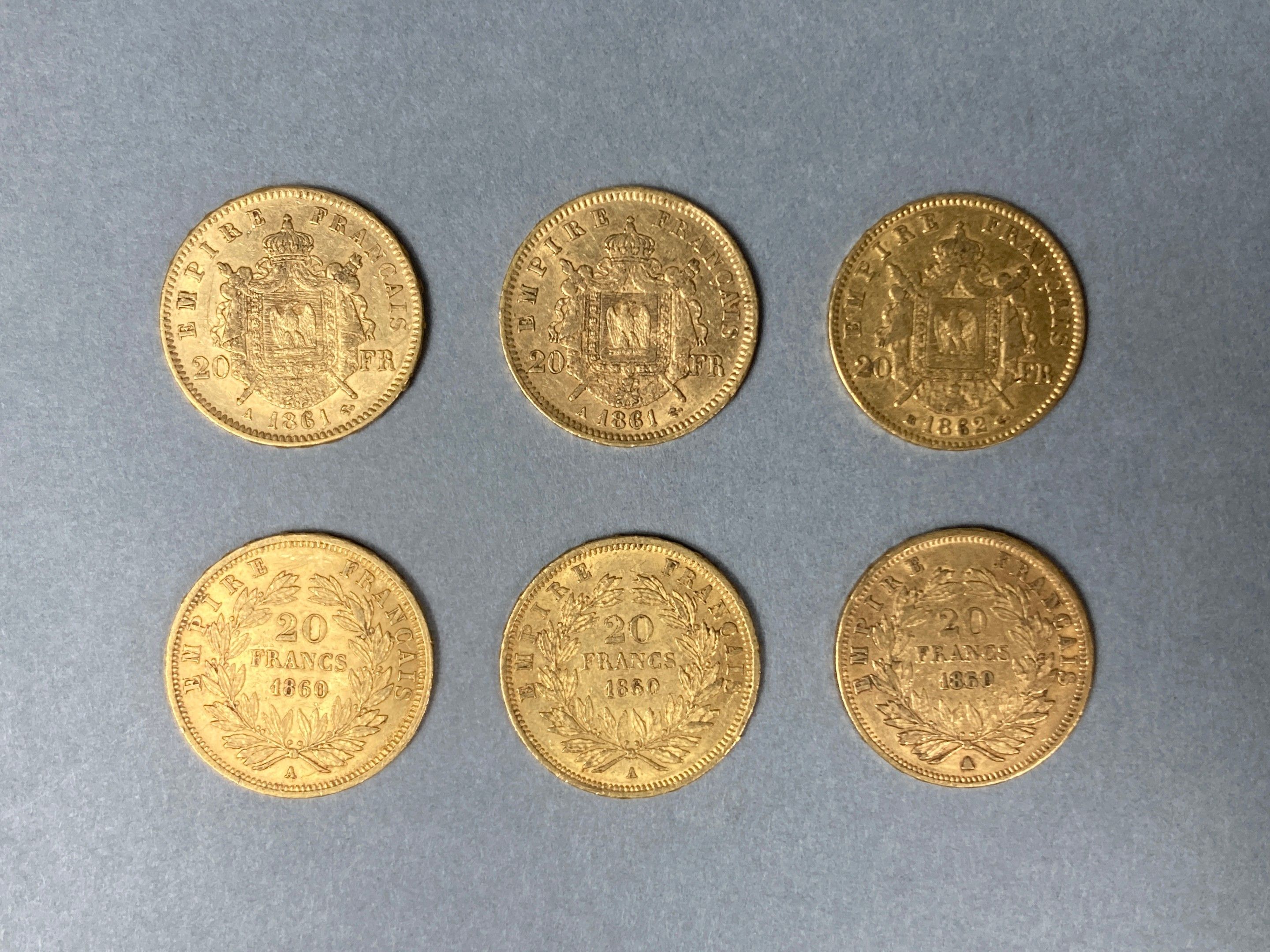 Reunion of 6 (six) 20 franc coins France, Napoléon III and Napoléon III tête laurée, in gold, from 1860 (x3), 1861 (x2) and 1862. Sold by designation. Kept in a bank safe. Delivery by appointment.