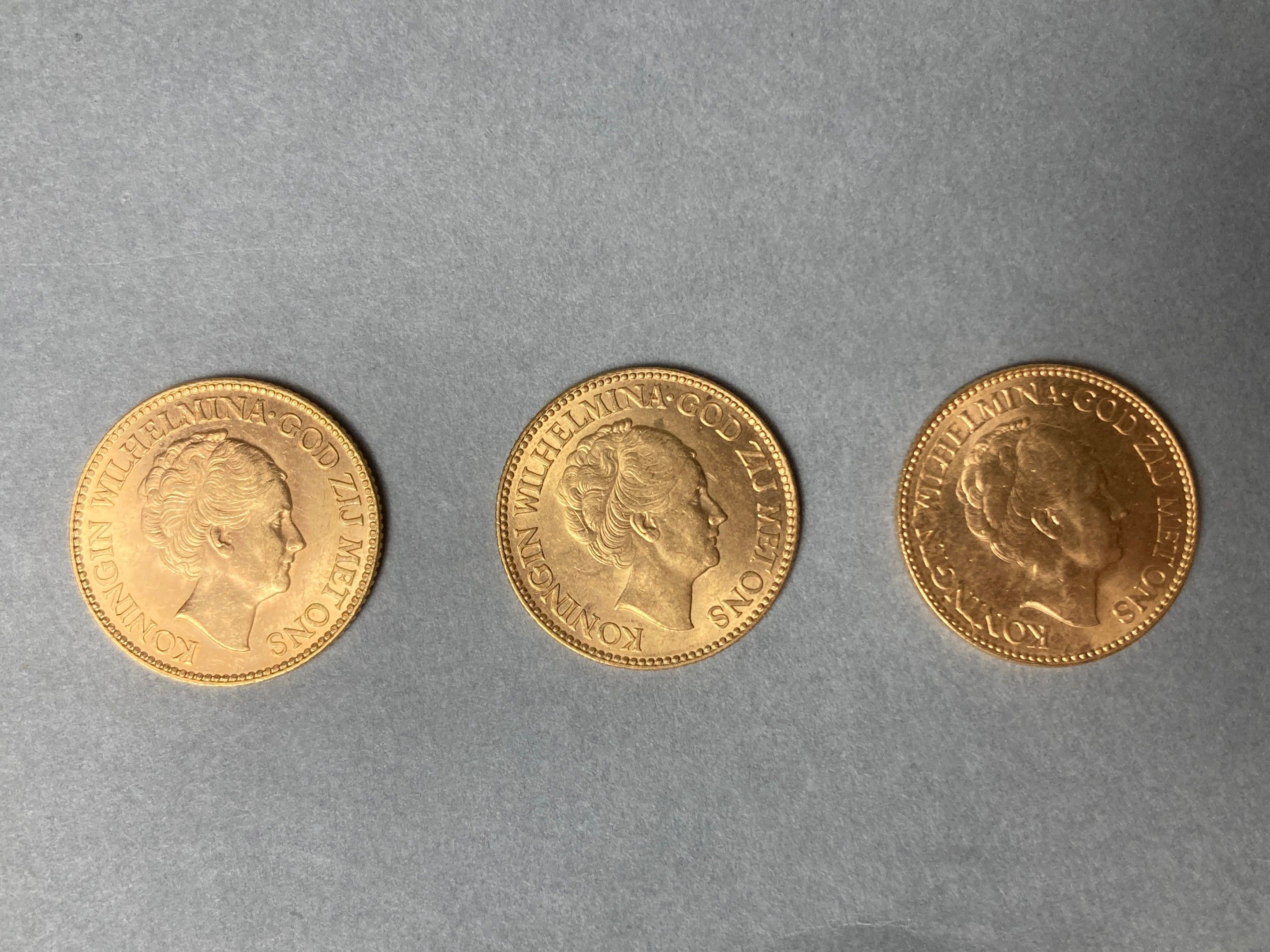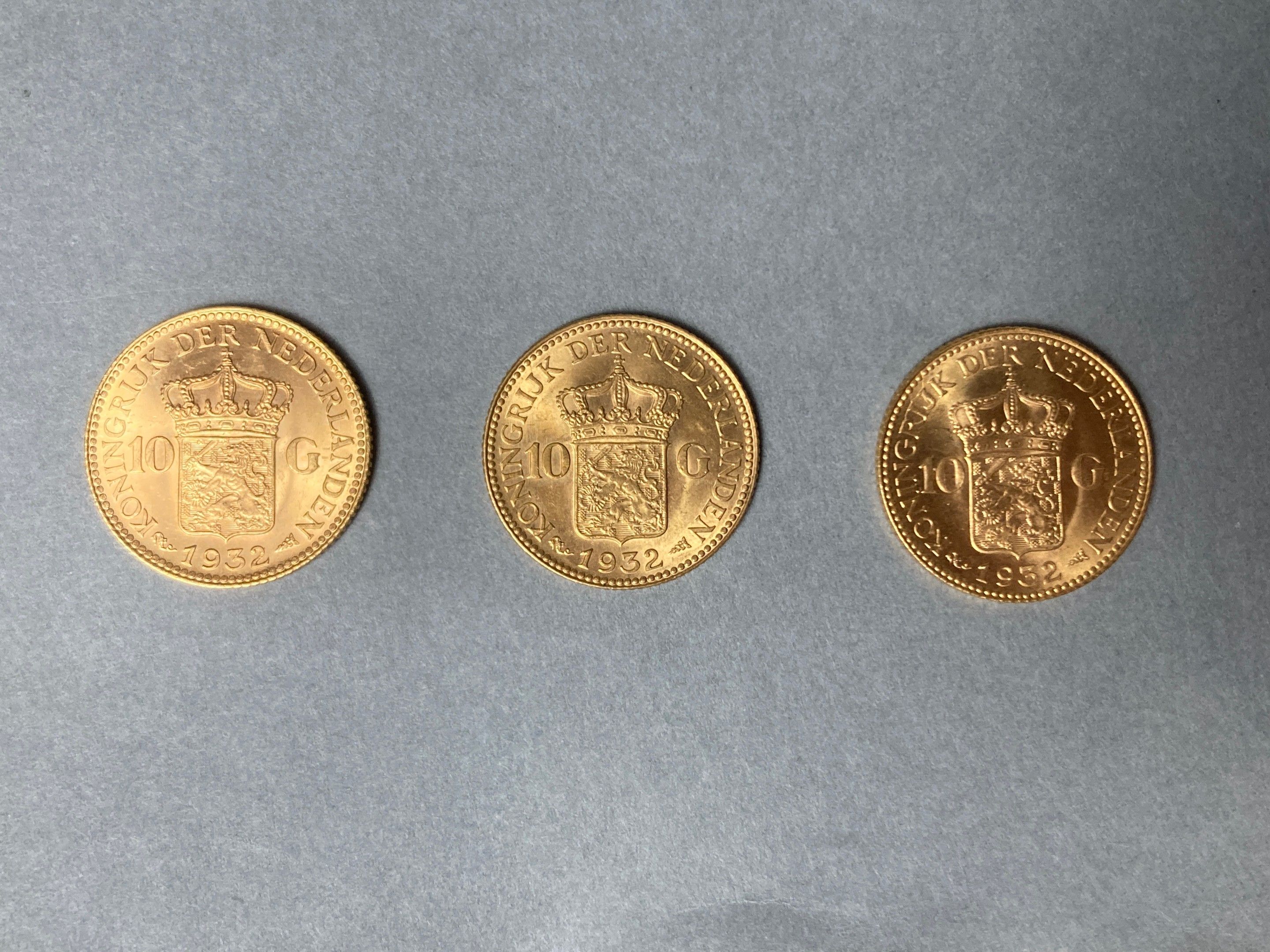 Reunion of 3 (three) pieces of 10 gulden / Nederlands guilders in gold, Wilhelmina, from 1932. Sold by designation. Kept in a bank safe. Delivery by appointment.