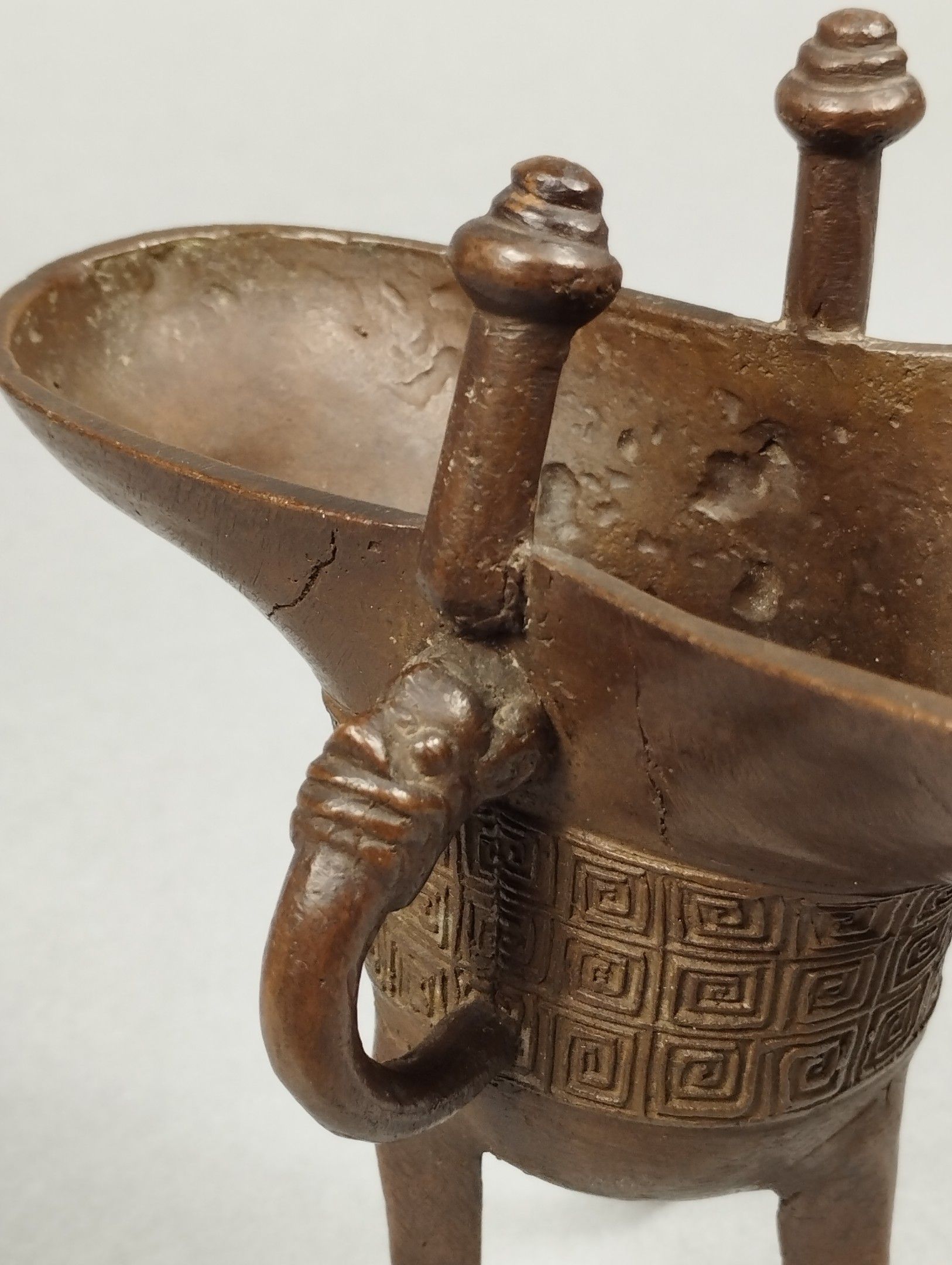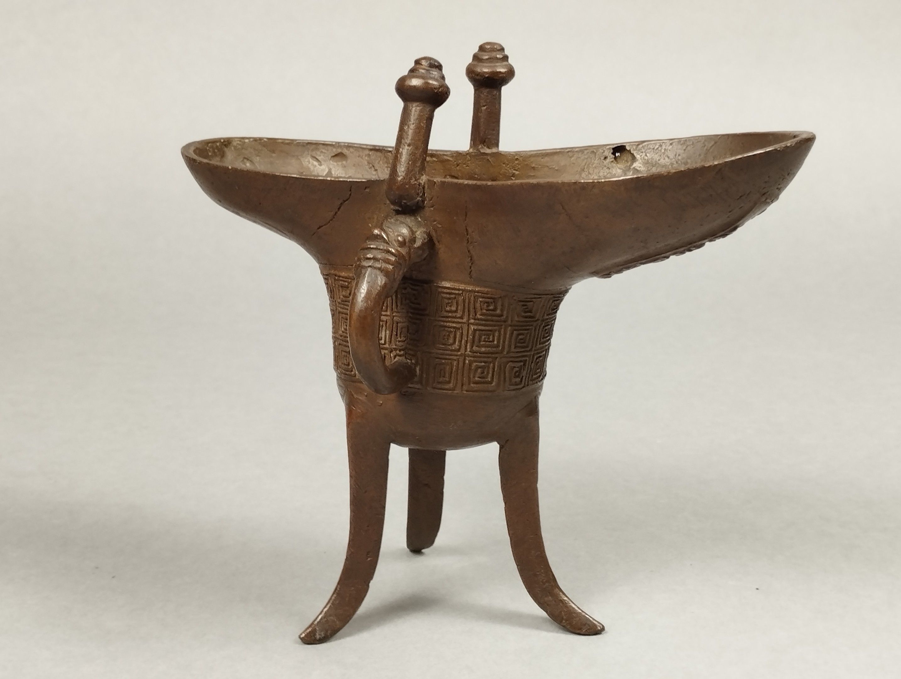 Several jues of this type have been recorded, but the cast is still imperfect. Referenced by Elwyn M. Smolen, "Chinese Bronzes of the Ming Dynasty", Arts of Asia, January 1980, p. 84, fig. 31.