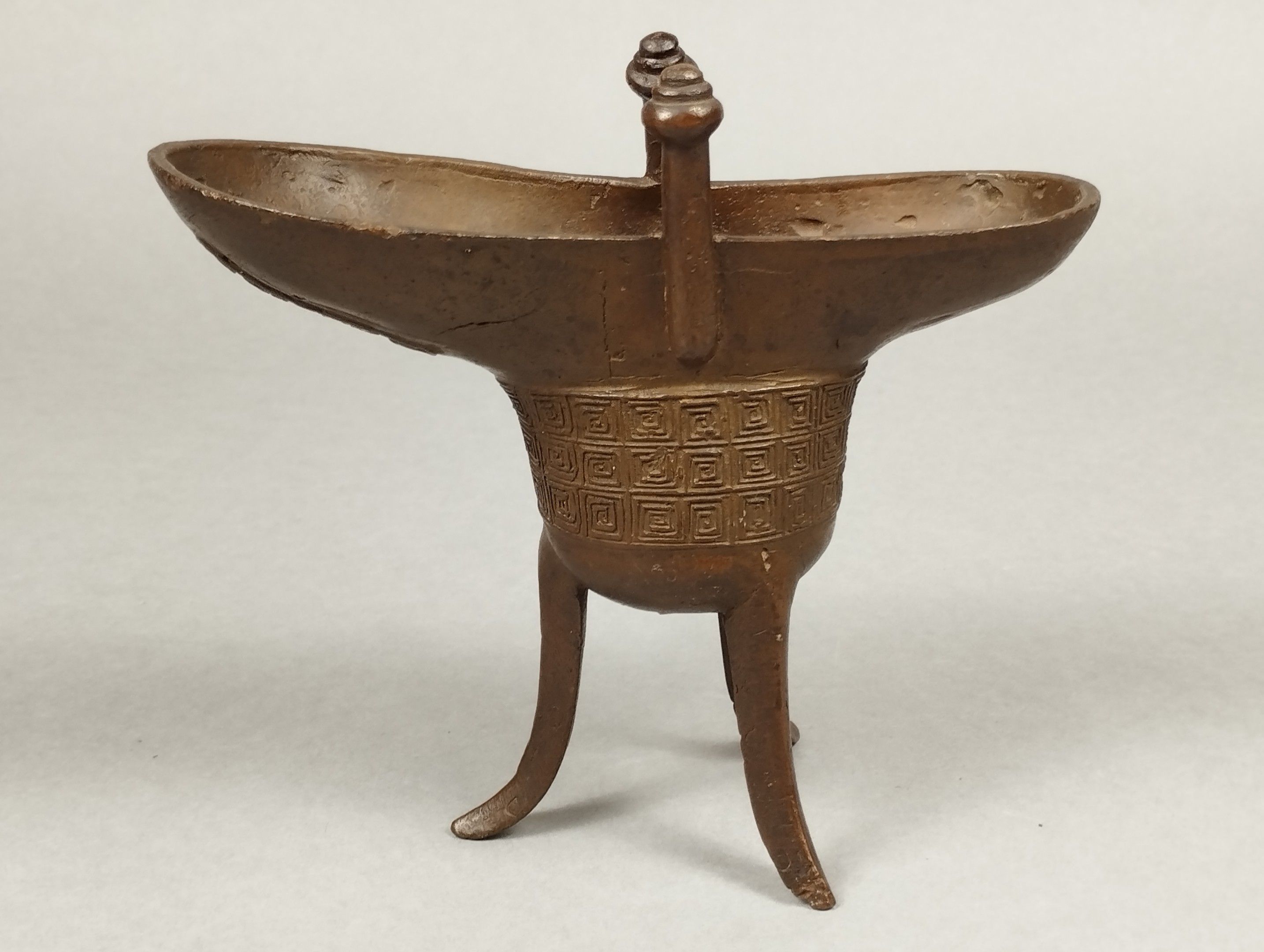 CHINA. A bronze tripod vase, known as a jue, in the archaic …