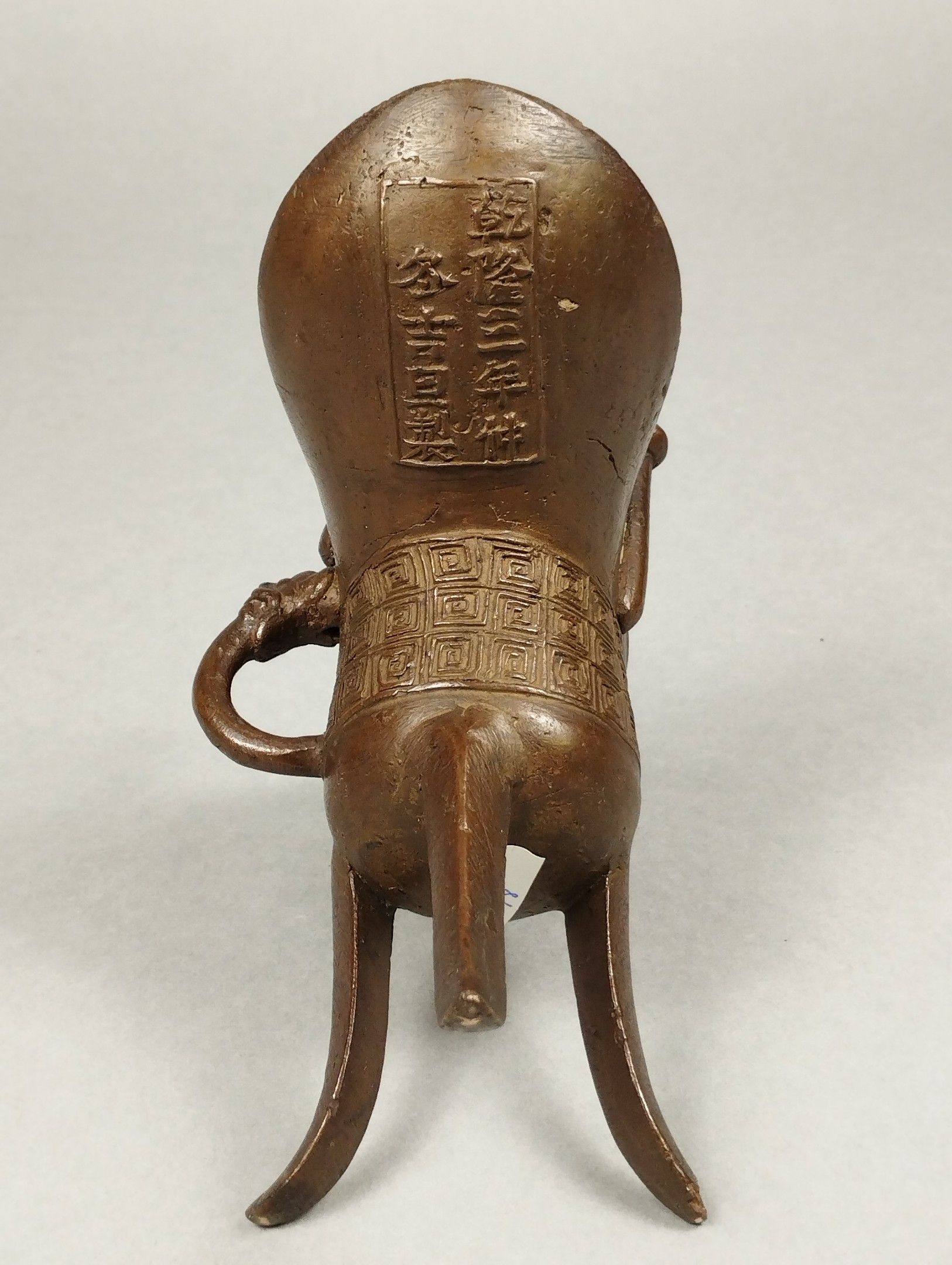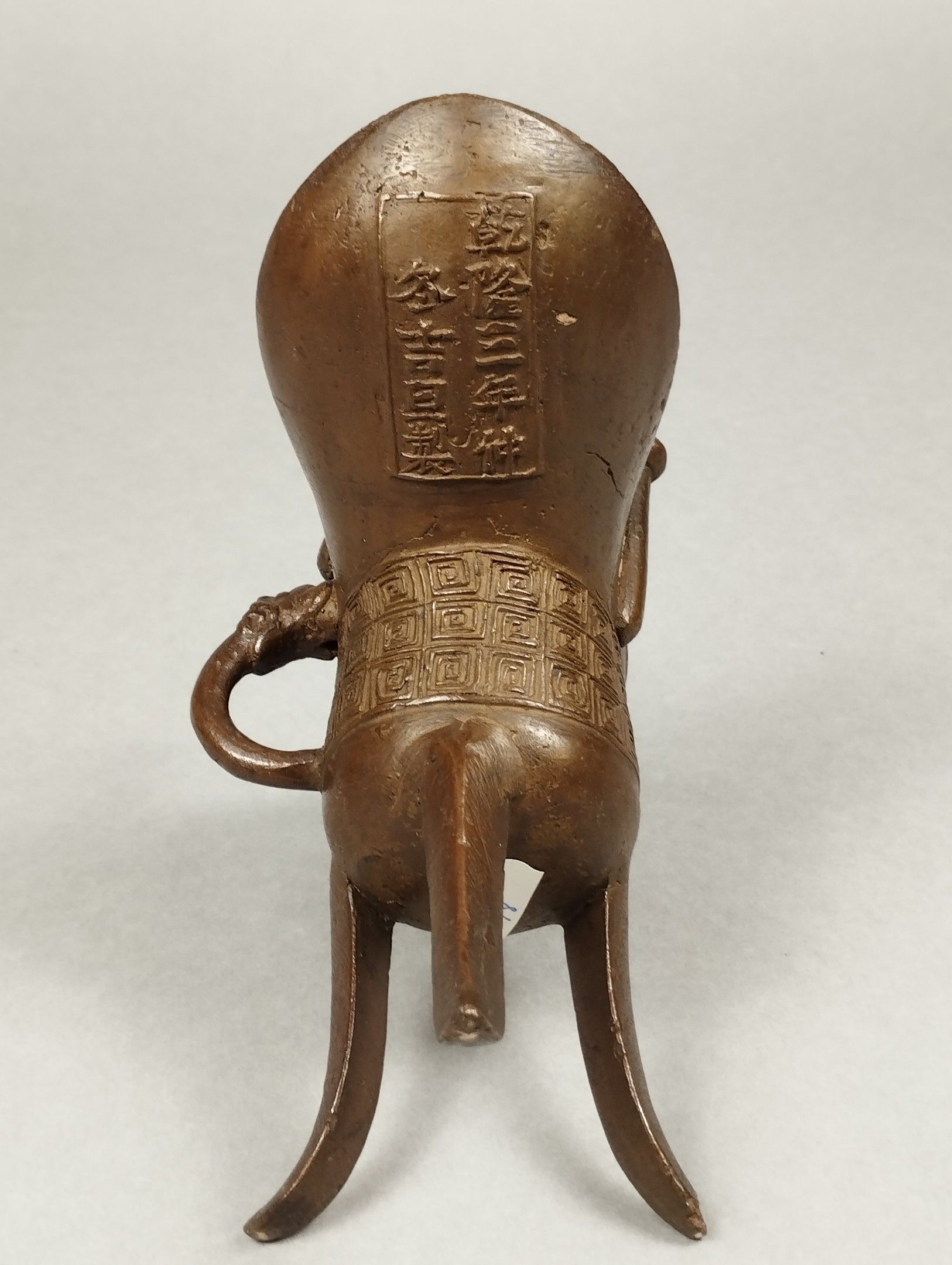 CHINA. A bronze tripod vase, known as a jue, in the archaic style. The cartouche "Qianlong sannian zhongdong jidan zhi" indicates that it was made on the 1st day of the eleventh month of the third year of the reign of Quianlong (1738). Height 15.5cm.