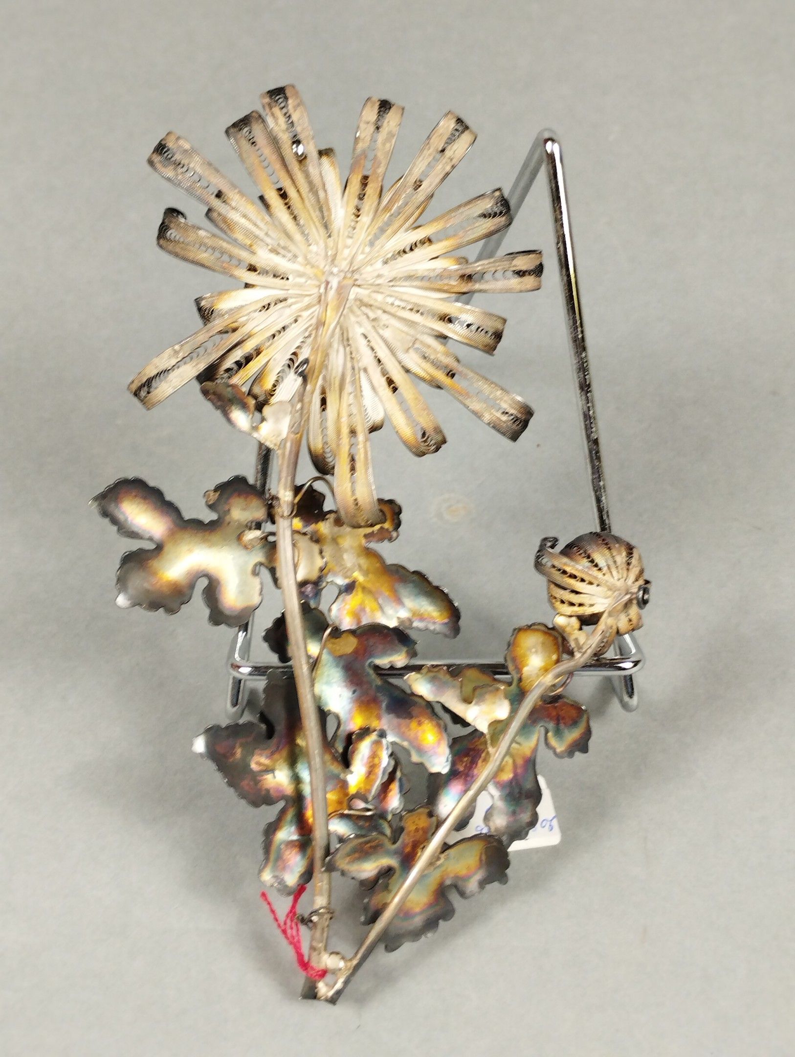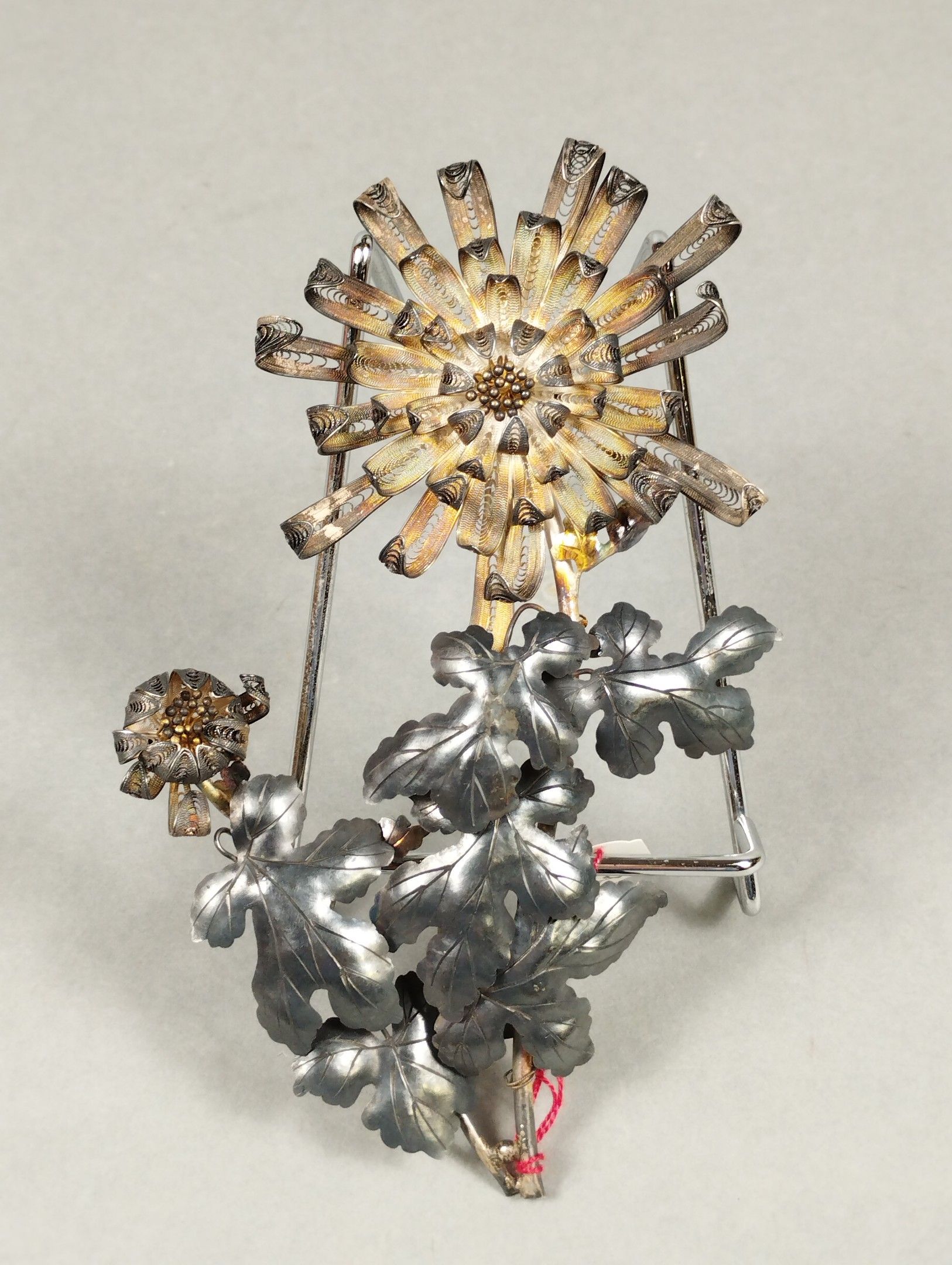 JAPAN. Silver chrysanthemum flowers, the flowers entirely made with filigree. 18.5 x 12 cm. Weight 94 g.
