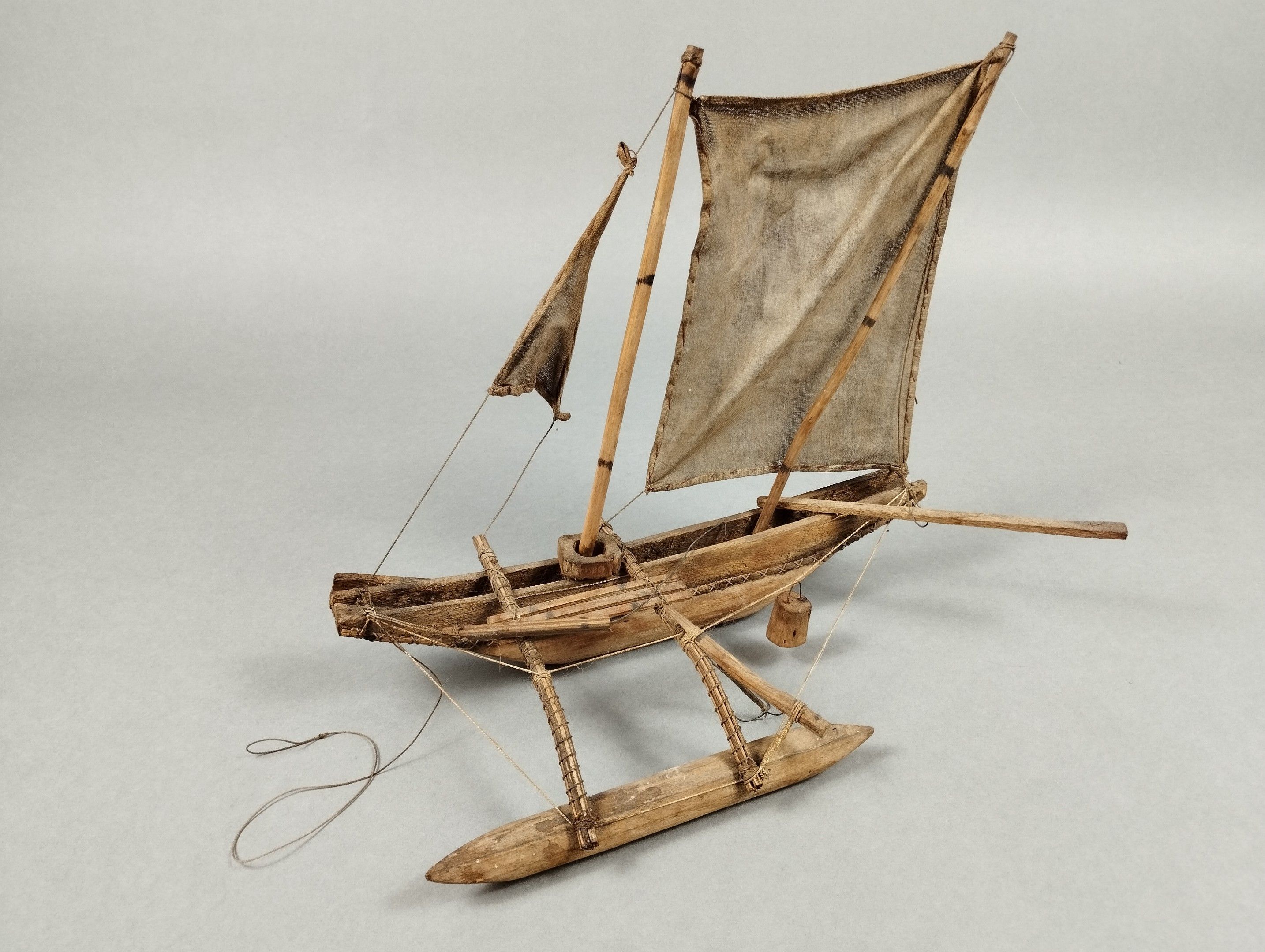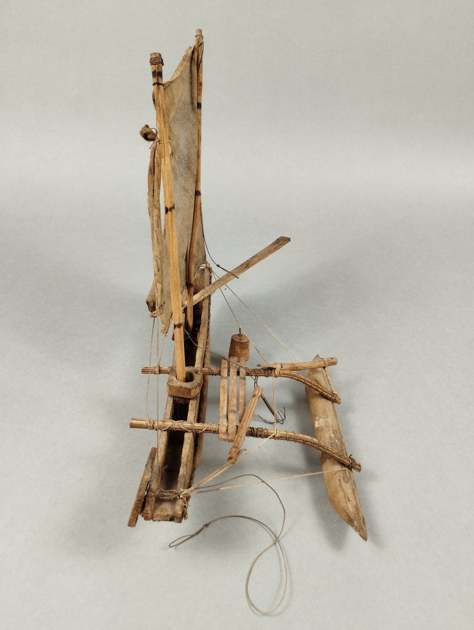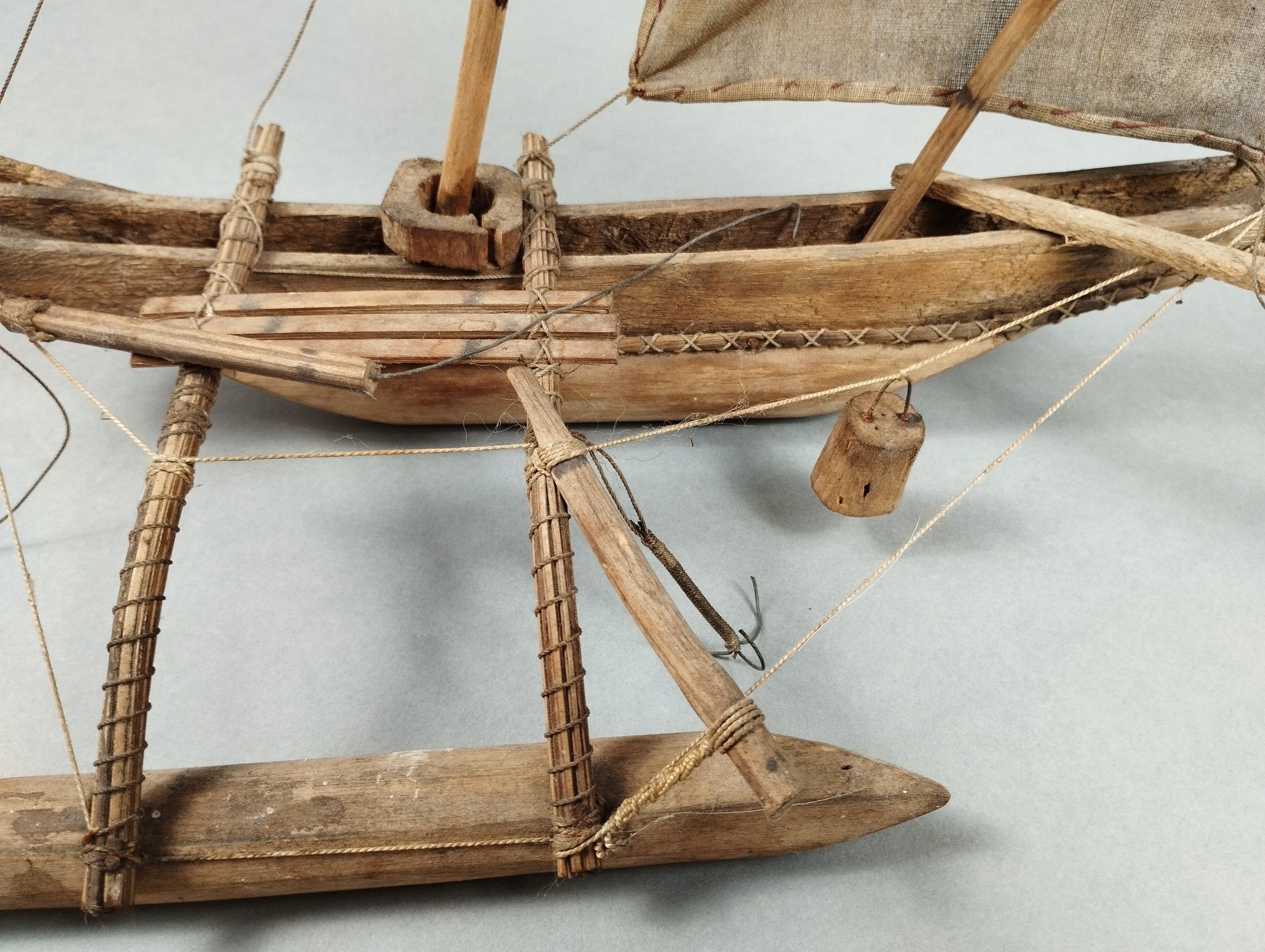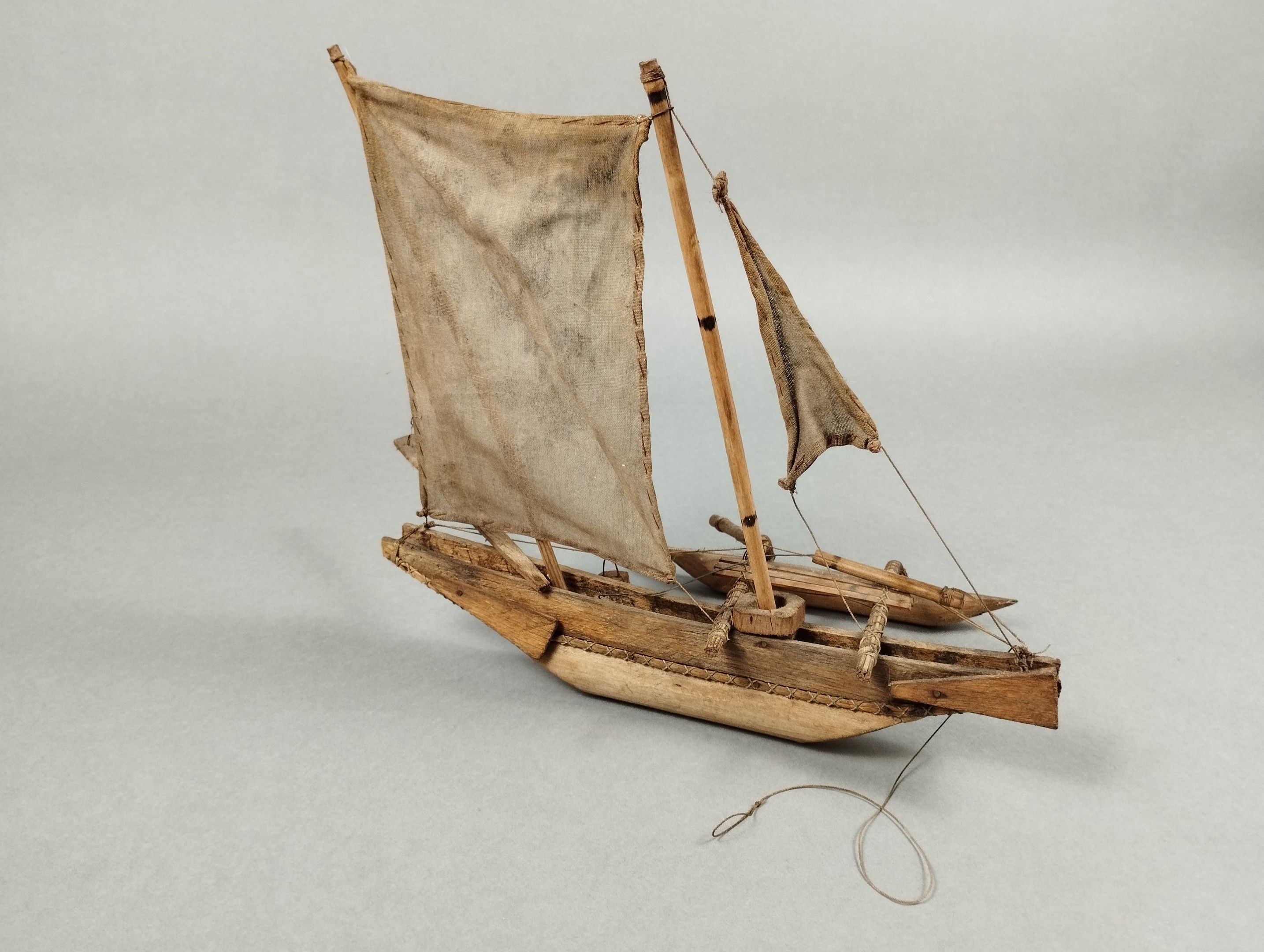 CEYLON (SRI LANKA). Model of a sewn outrigger pirogue from Colombo, complete with accessories. Wood and canvas. Length 31 cm. Early 20th century.