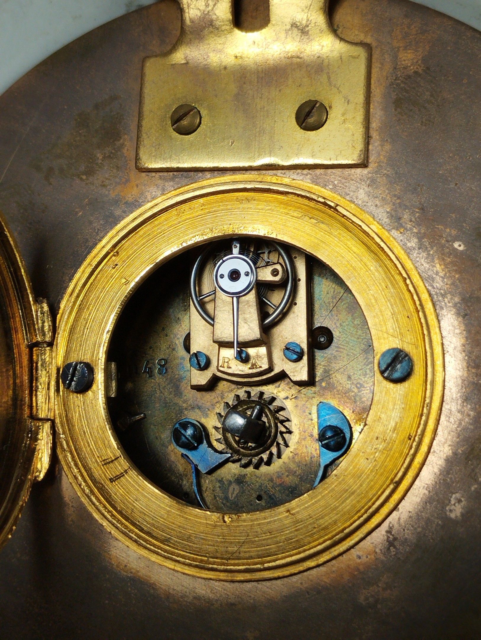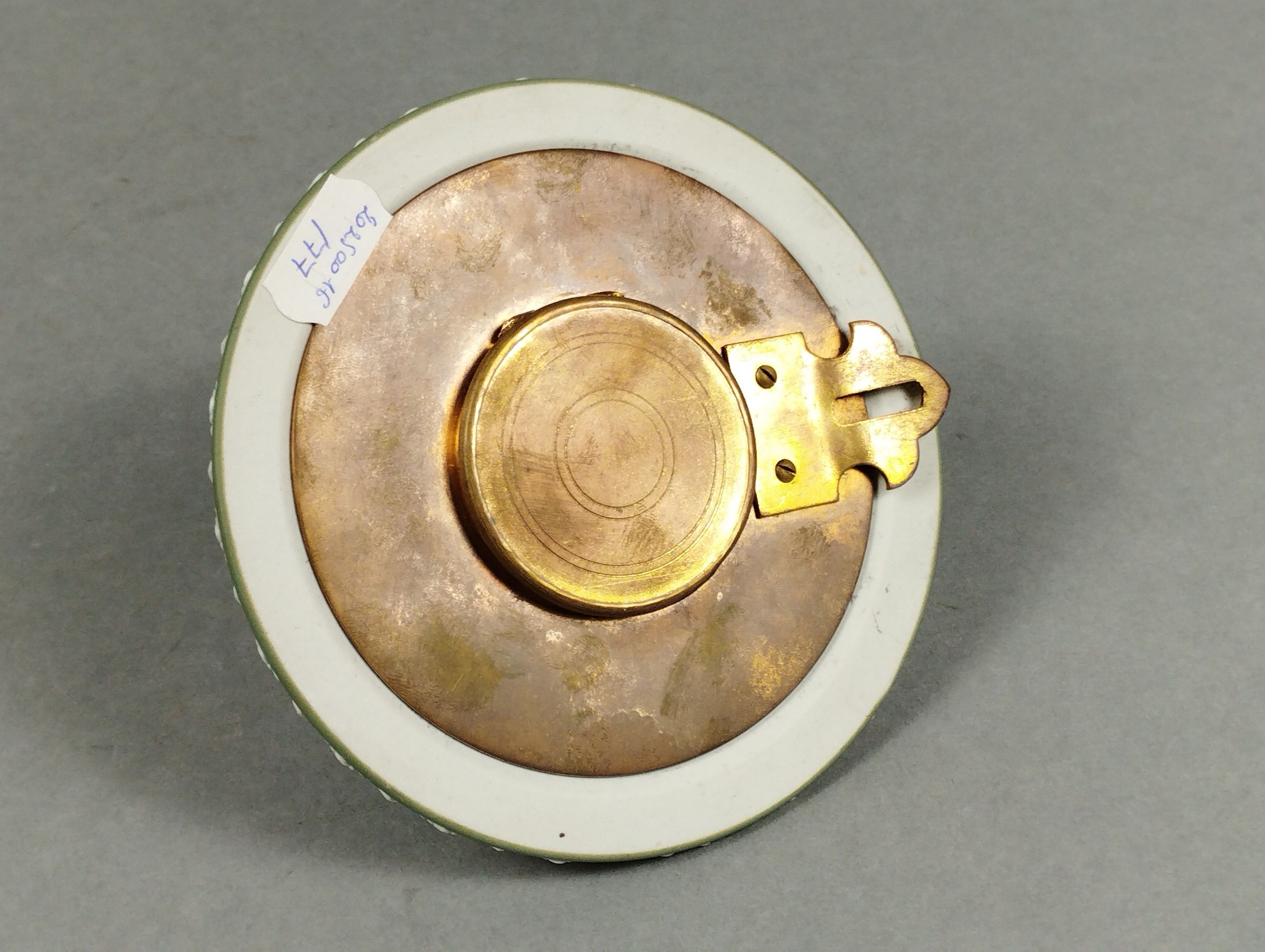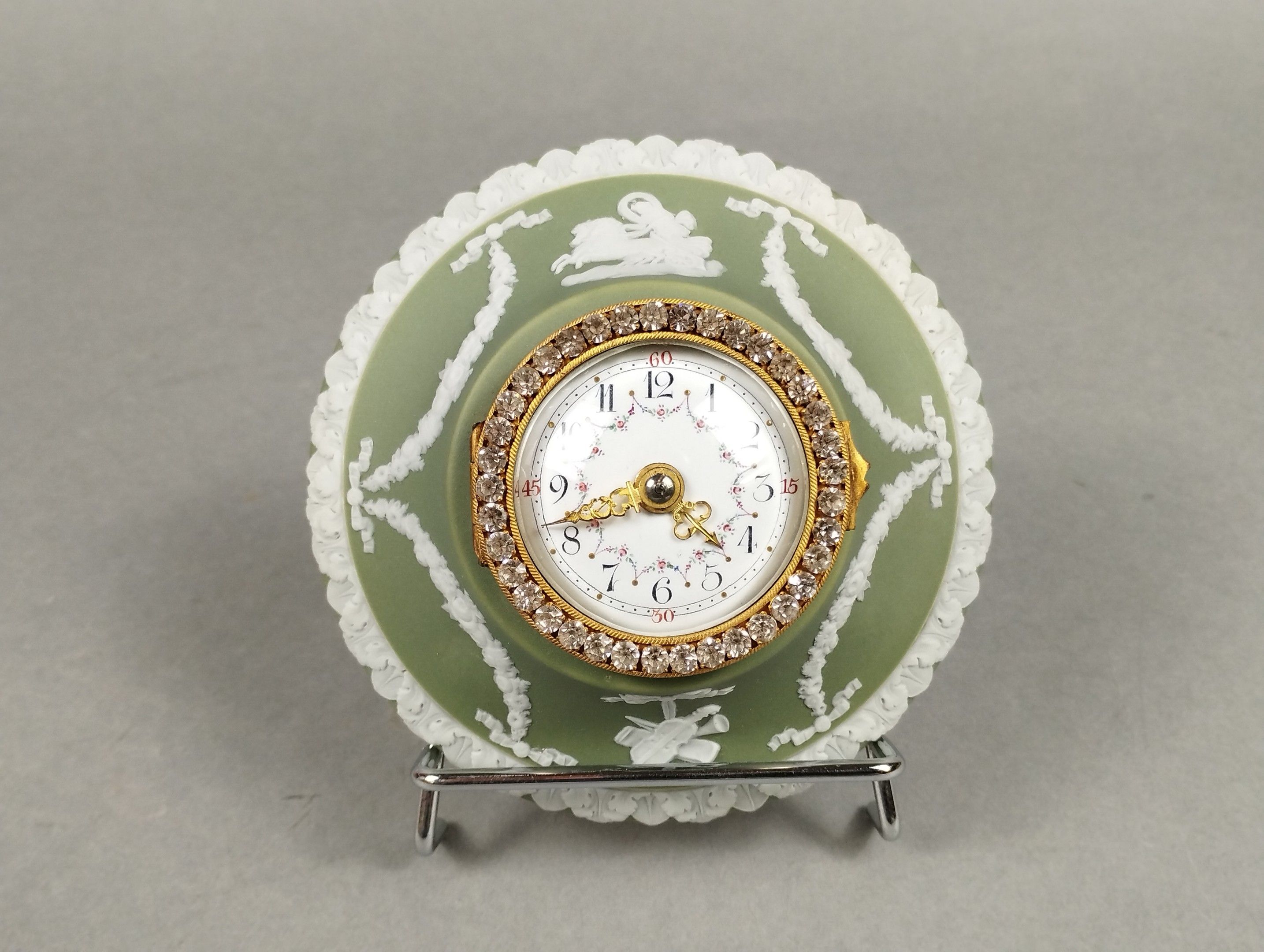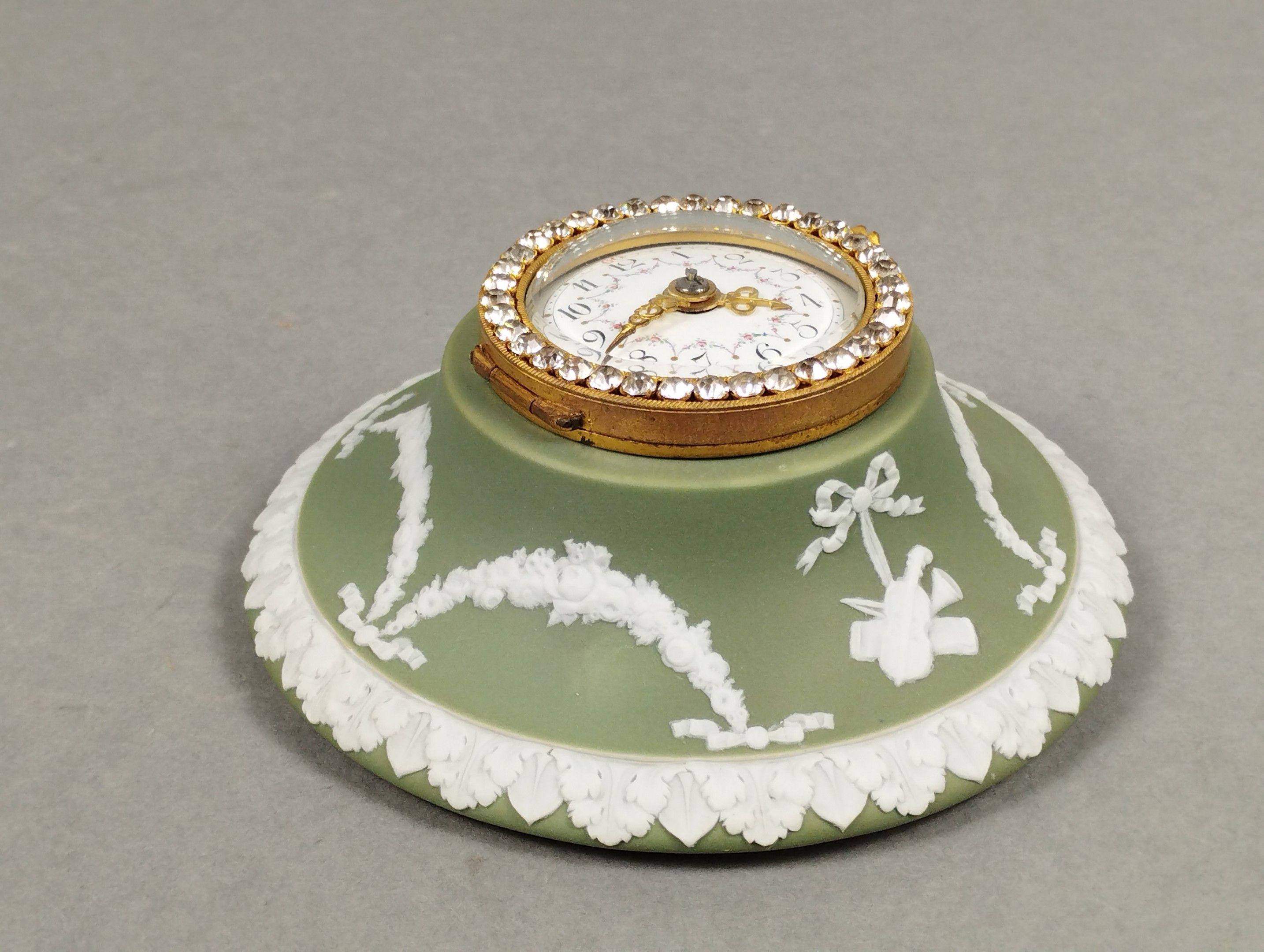 House of DAUBREE (Nancy, Lorraine) and WEDGWOOD (England). Charming neo-classical wall-mounted cartel in stoneware biscuit called "jasperware" and gilt bronze enhanced by a rhinestone surround. Circa 1900. Diameter 13.2 cm.