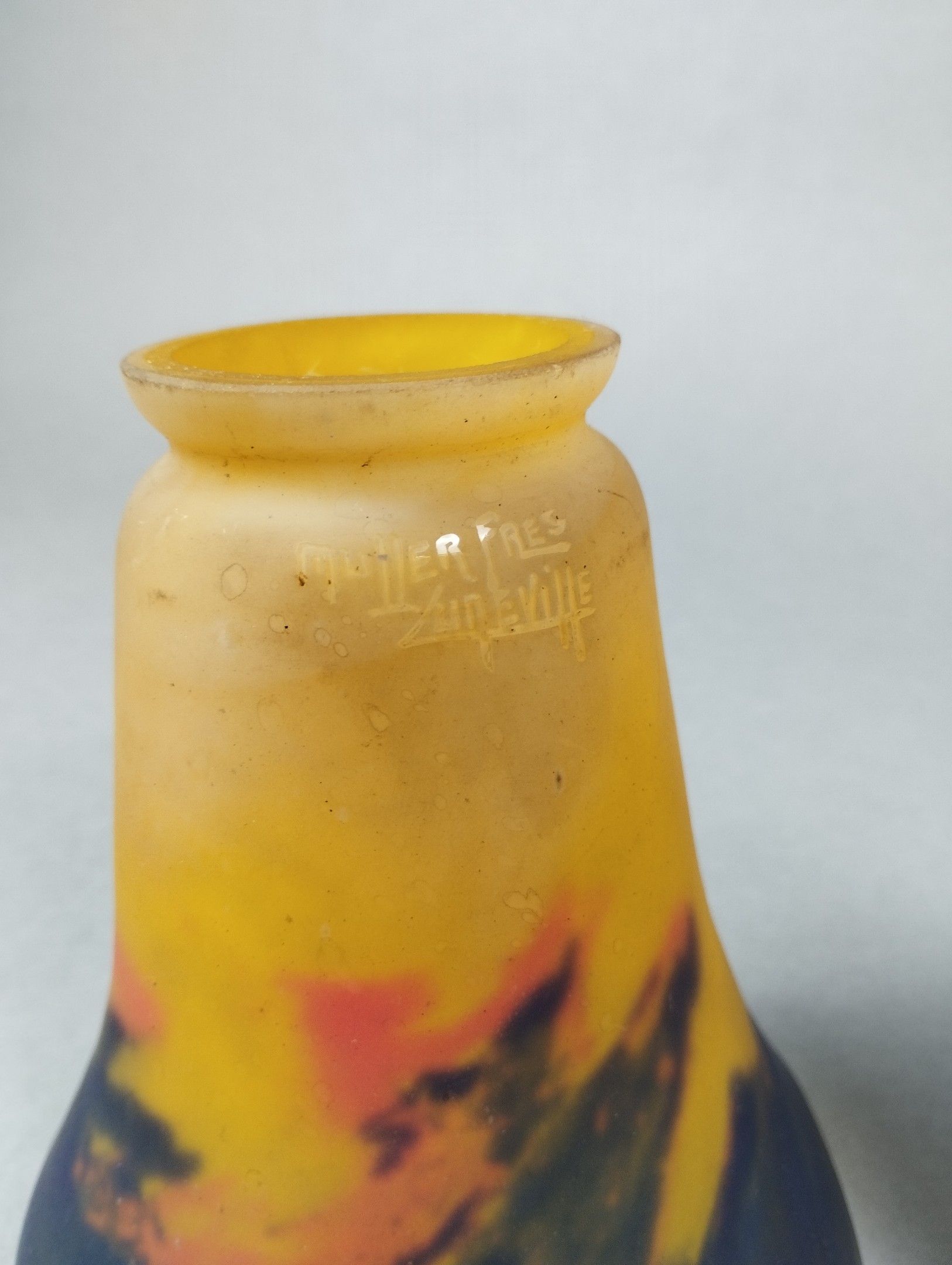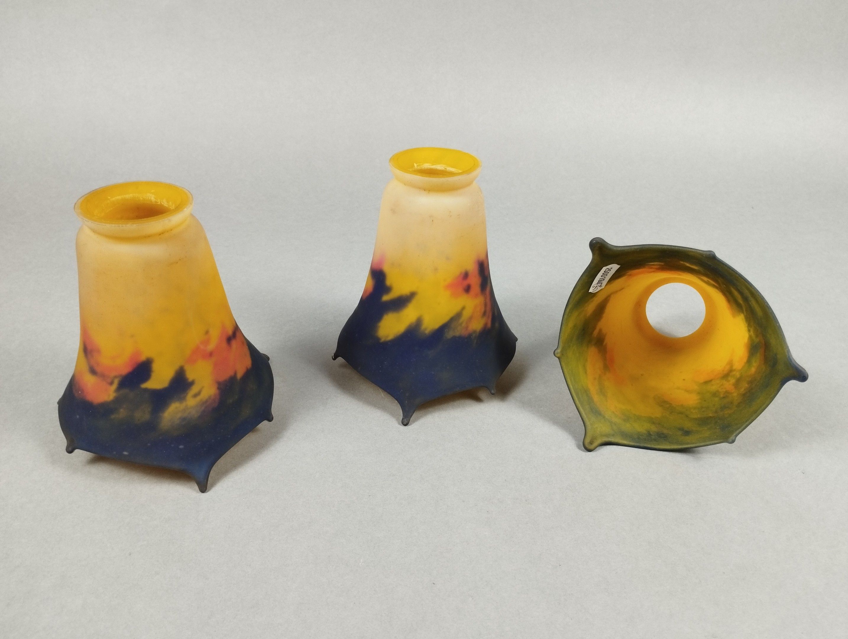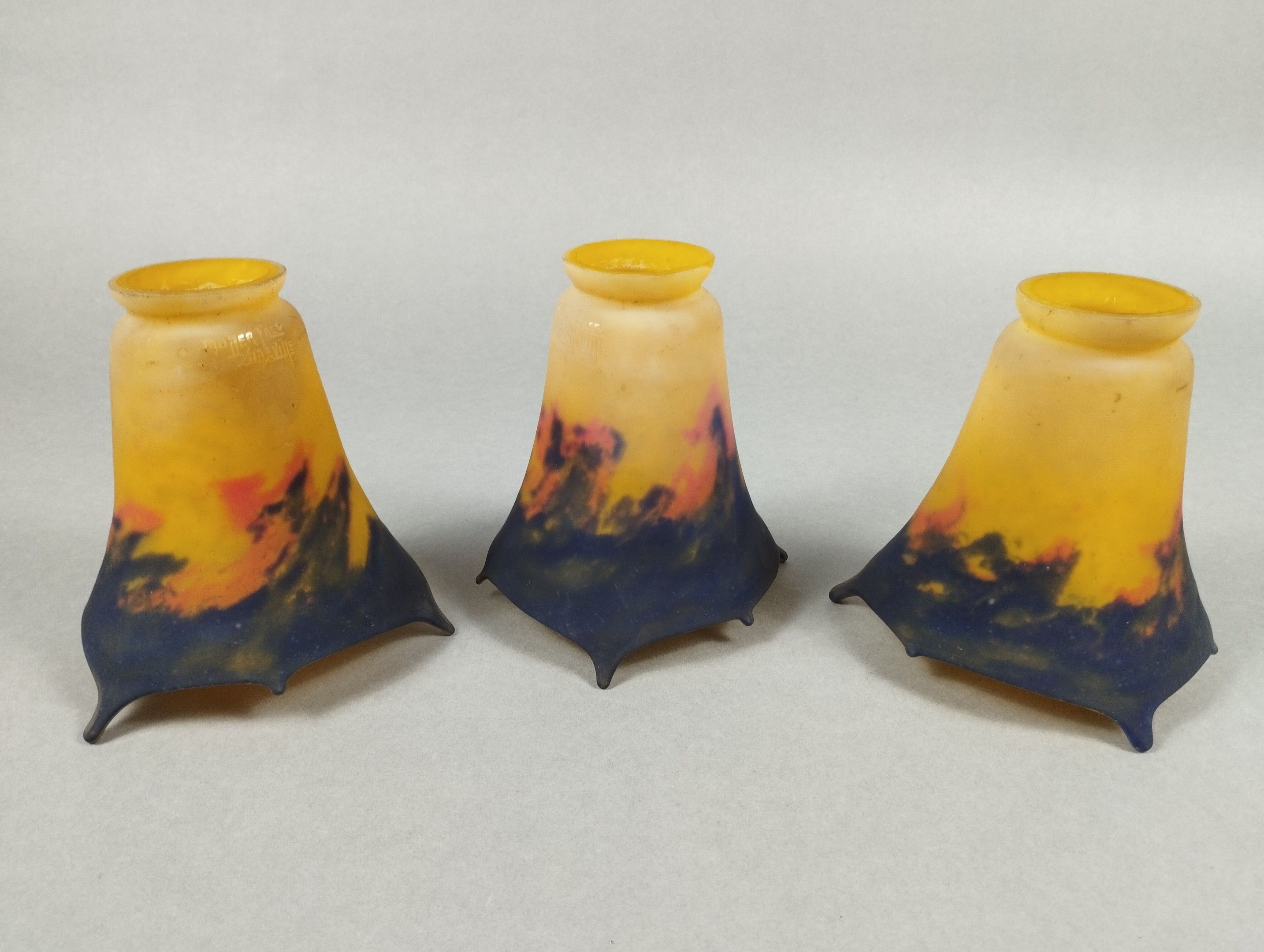 MULLER FRERES in Lunéville (Lorraine). Set of three Art Nouveau tulips in bluish-yellow, heat-drawn glass. Signed. 1910-1920. Height 14.5 cm - diameter 12.5 cm. Very small chips on the neck (not visible when mounted).