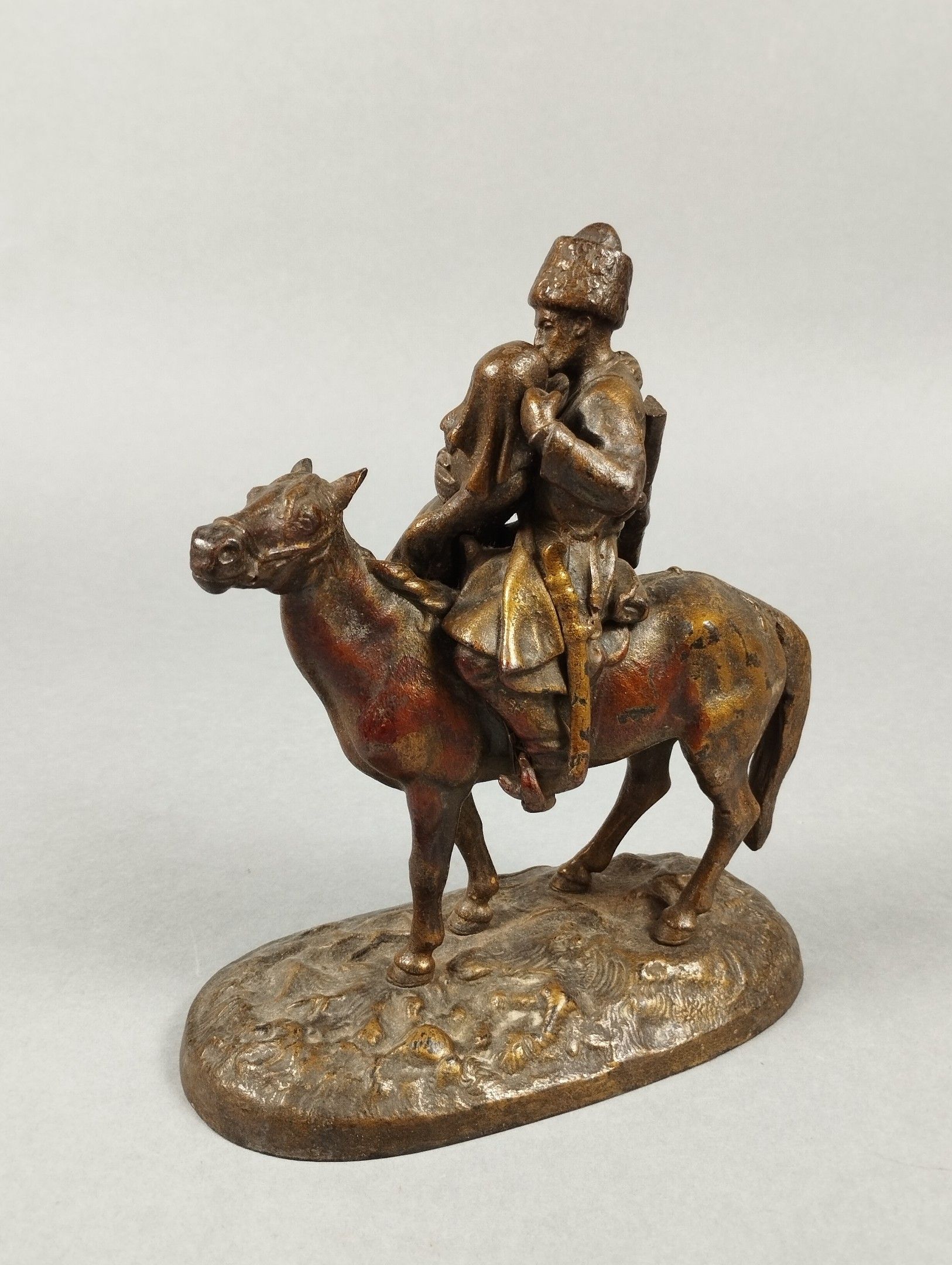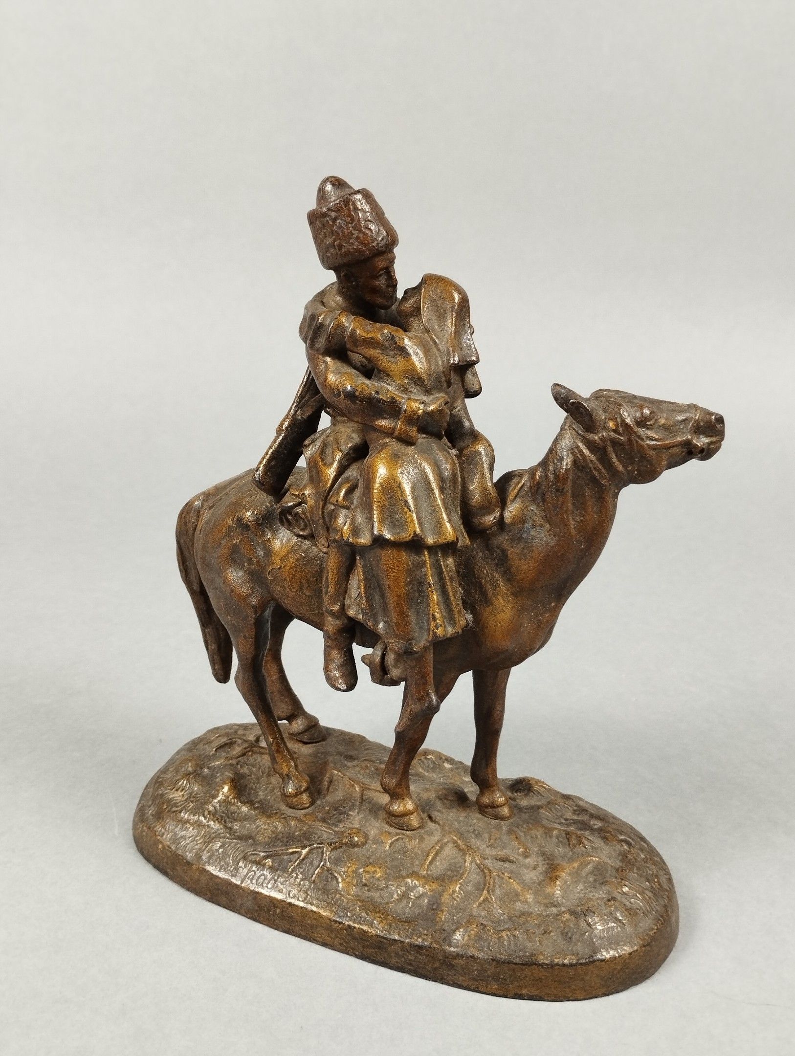 Eugène Alexandre, known as Evgeny Alexandrovitch, LANCERAY (1848-1886). The Cossack's farewell kiss. Model created in 1878. Patinated cast from the Kasli art foundry (stamped with a double-headed eagle), dated 1902. Height 21 cm. Minor damage and missing parts.