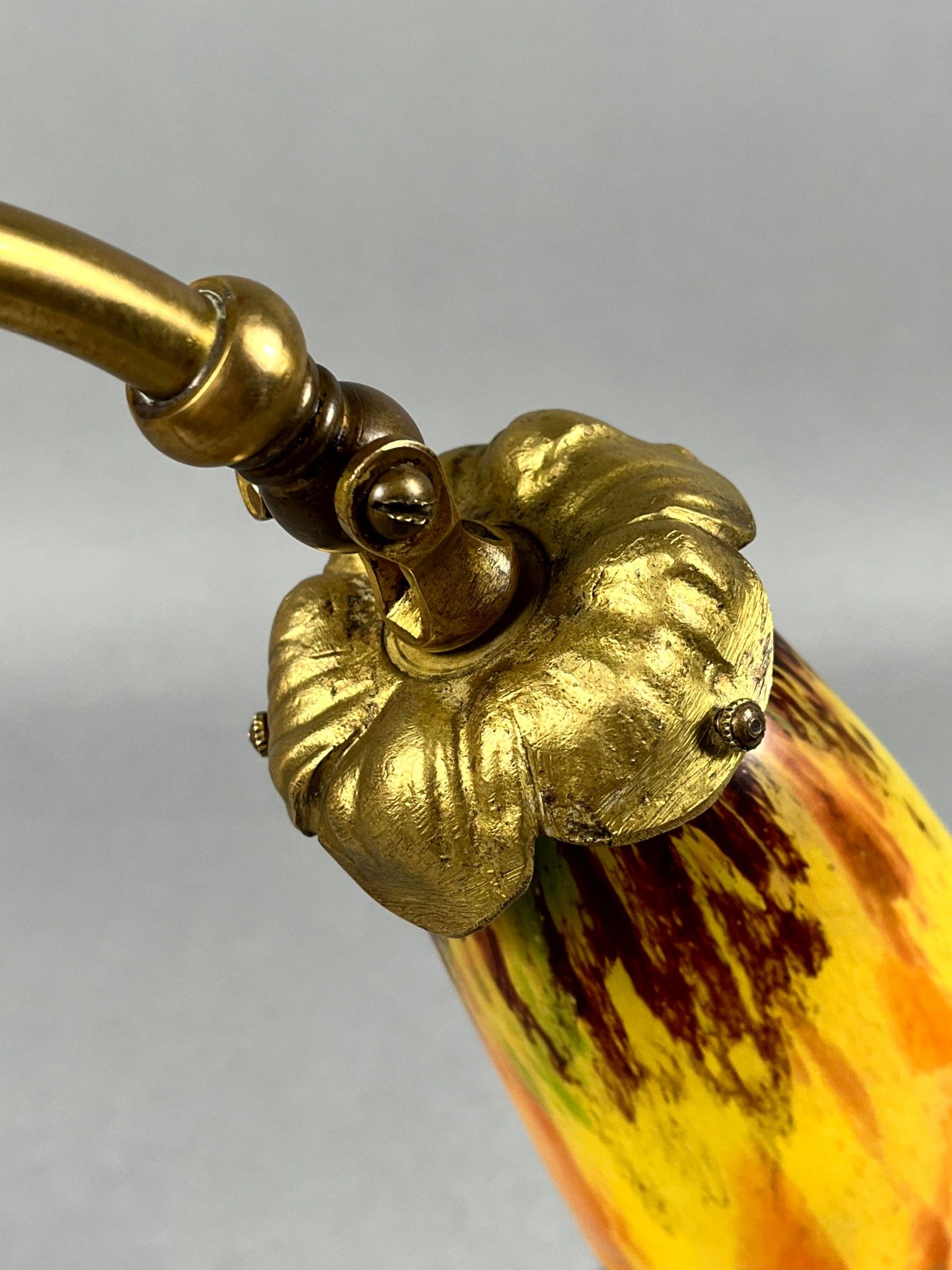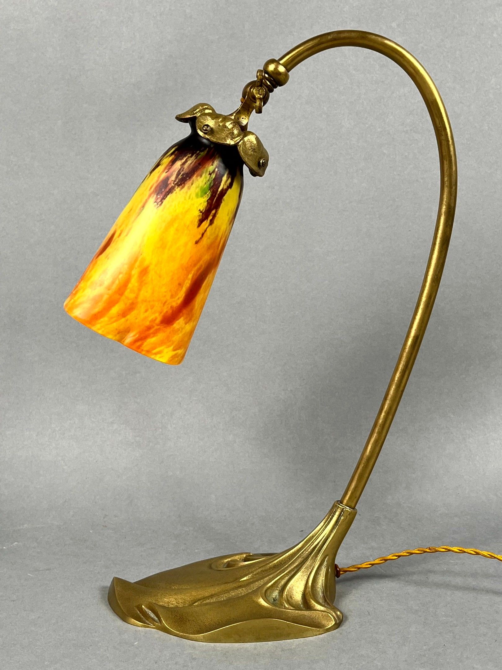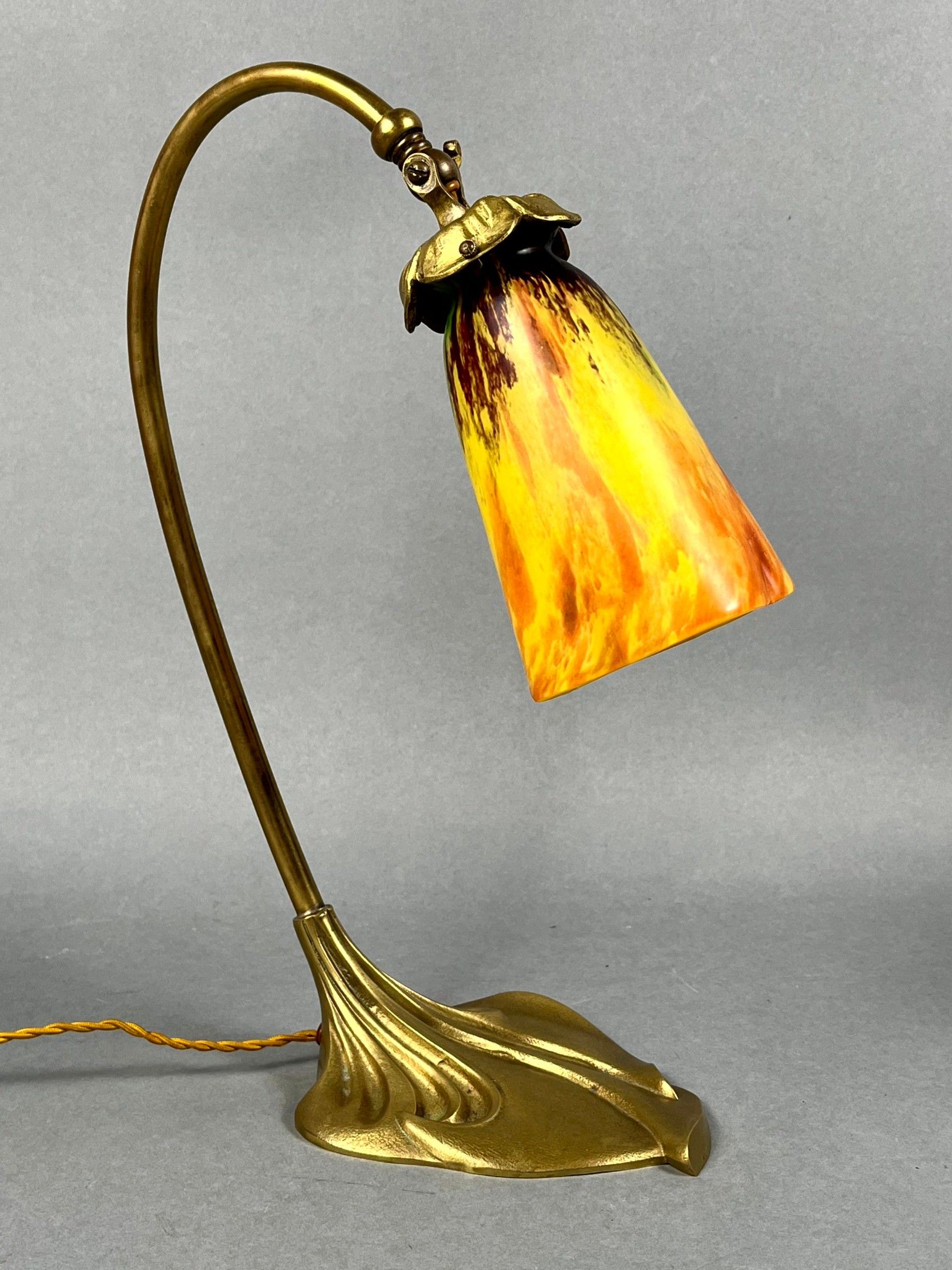 An ormolu desk lamp featuring a bouquet of arums at the base, the hinged end holding a yellow/orange marmorated glass tulip, signed DAUM Nancy France (Lorraine). Total height: 40 cm; tulip height: 16 cm.