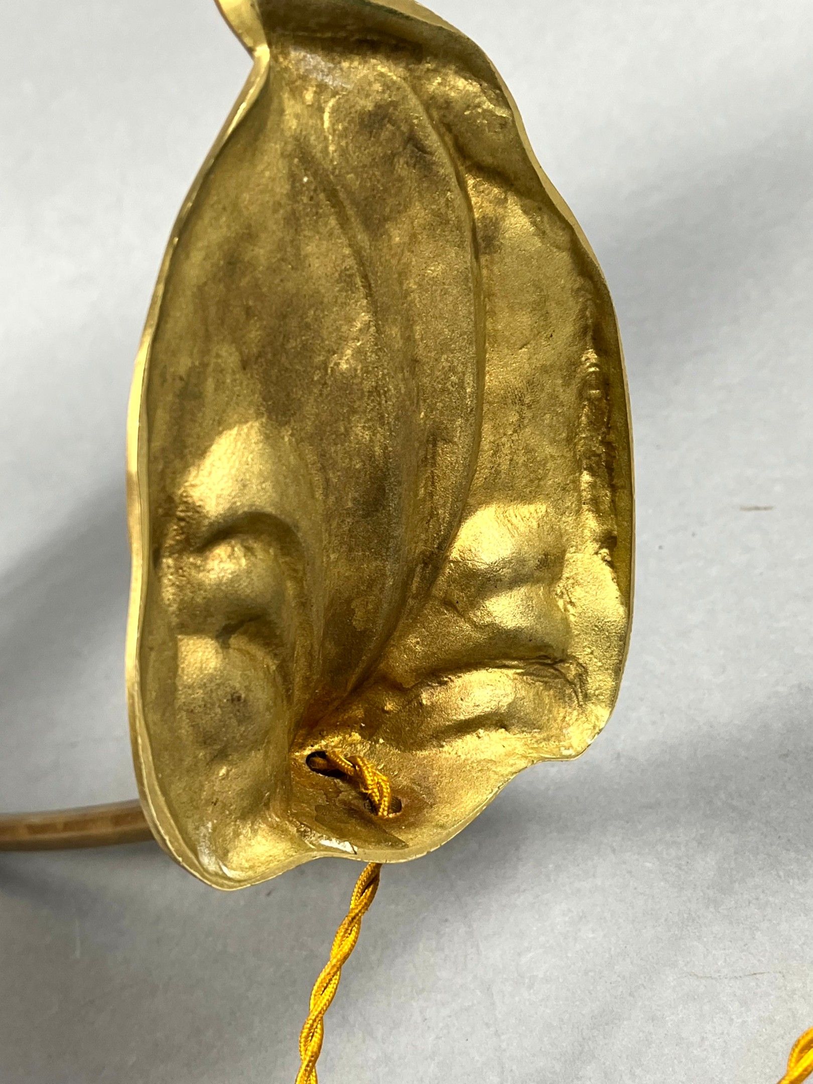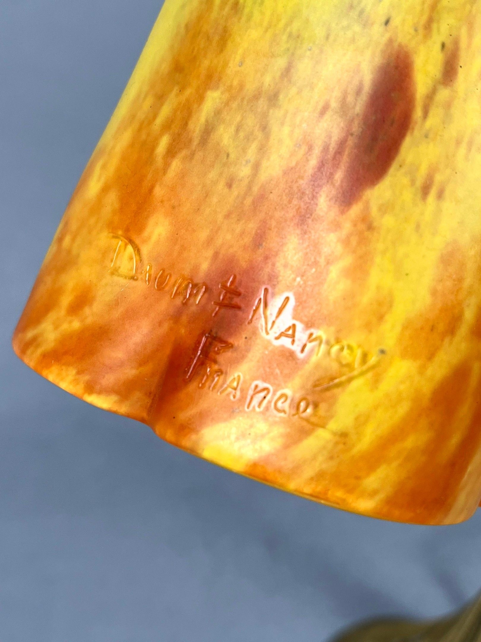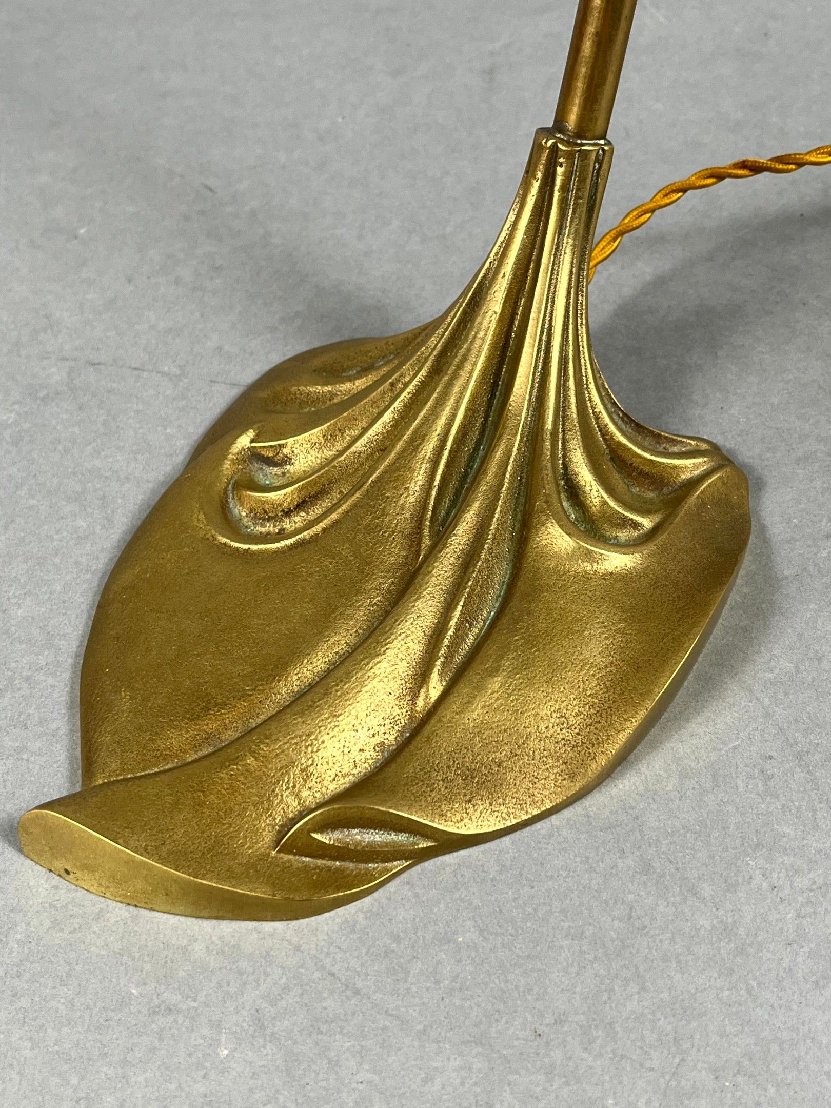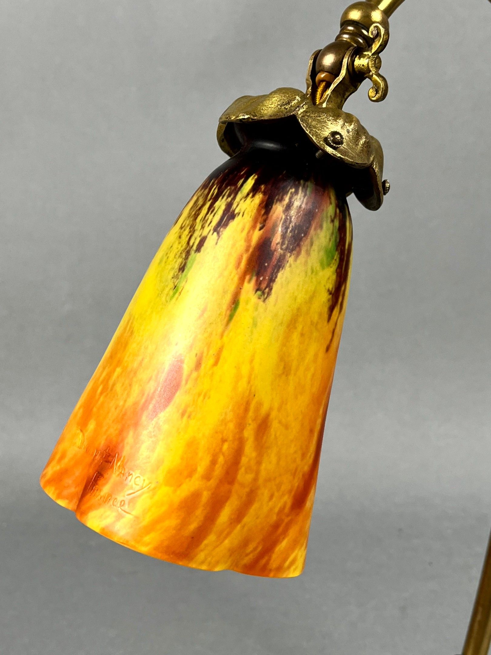 An ormolu desk lamp featuring a bouquet of arums at the base, the hinged end holding a yellow/orange marmorated glass tulip, signed DAUM Nancy France (Lorraine). Total height: 40 cm; tulip height: 16 cm.