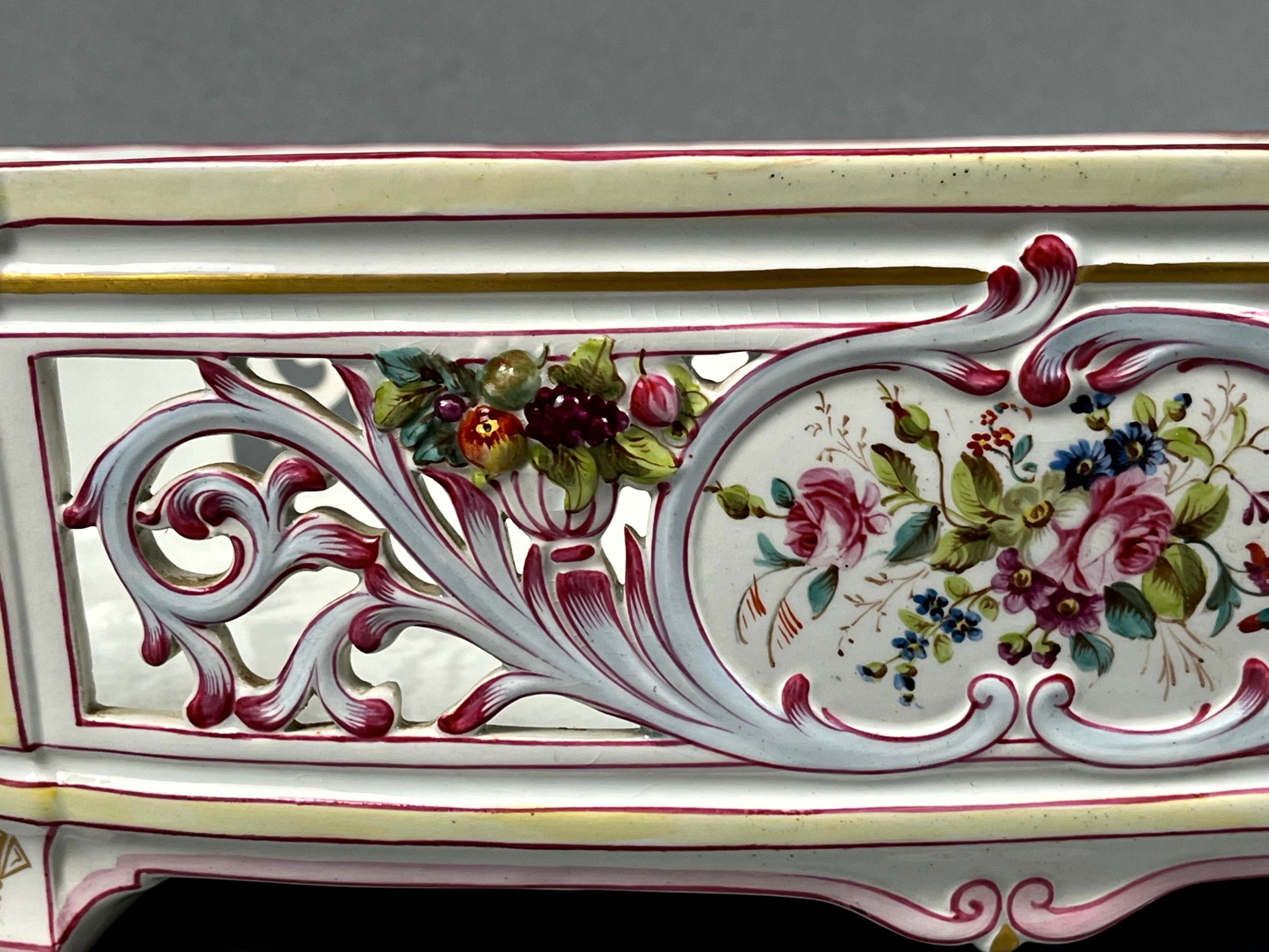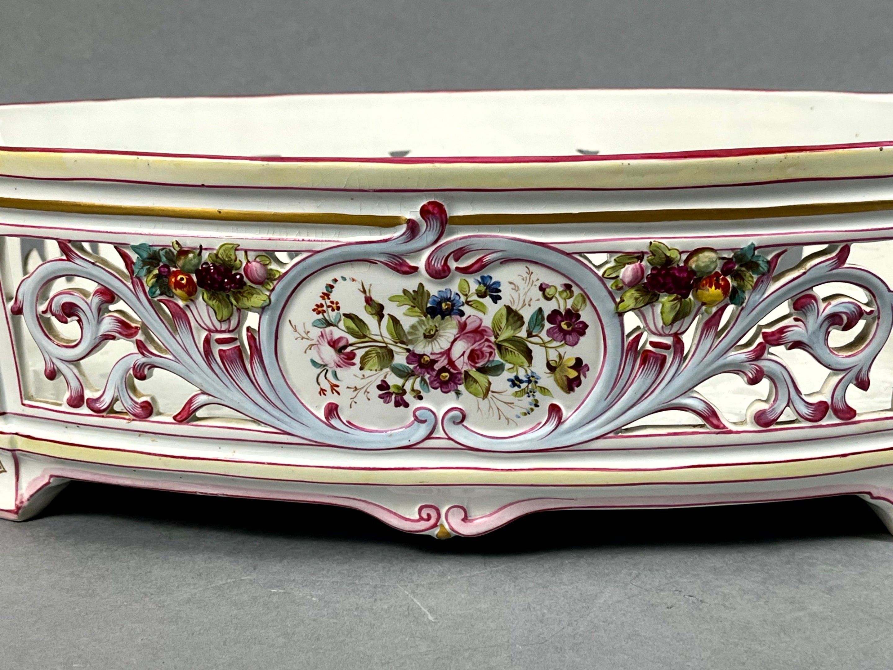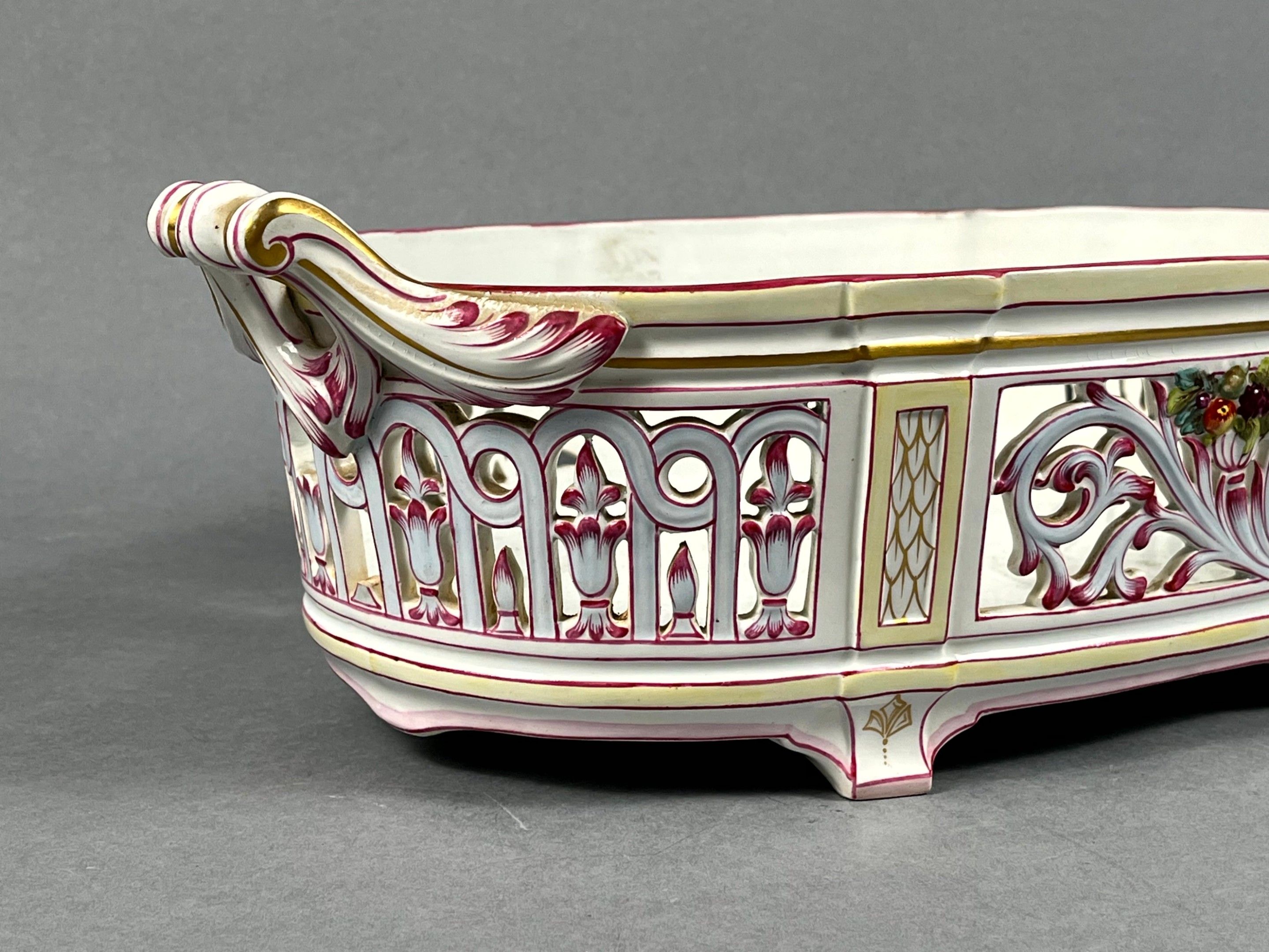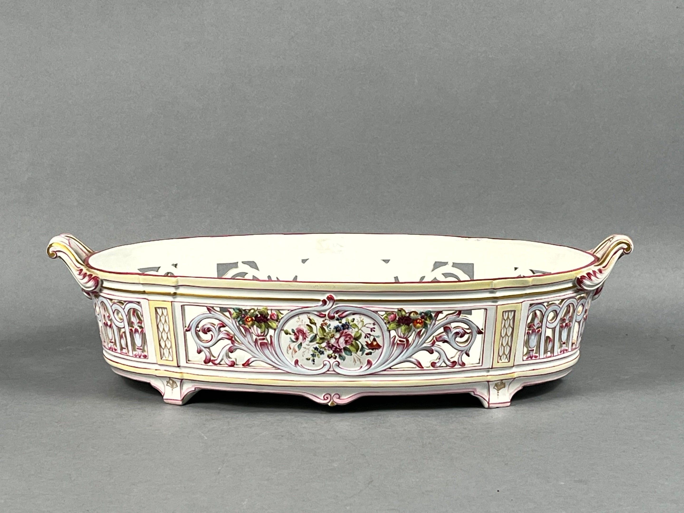 KELLER & GUERIN (KG) LUNEVILLE, France. A large oval jardinière in polychrome earthenware with gold highlights, decorated with flowers and foliage. Leafy handles. Signed. Length with handles: 55 cm. The openwork decoration is slightly missing.