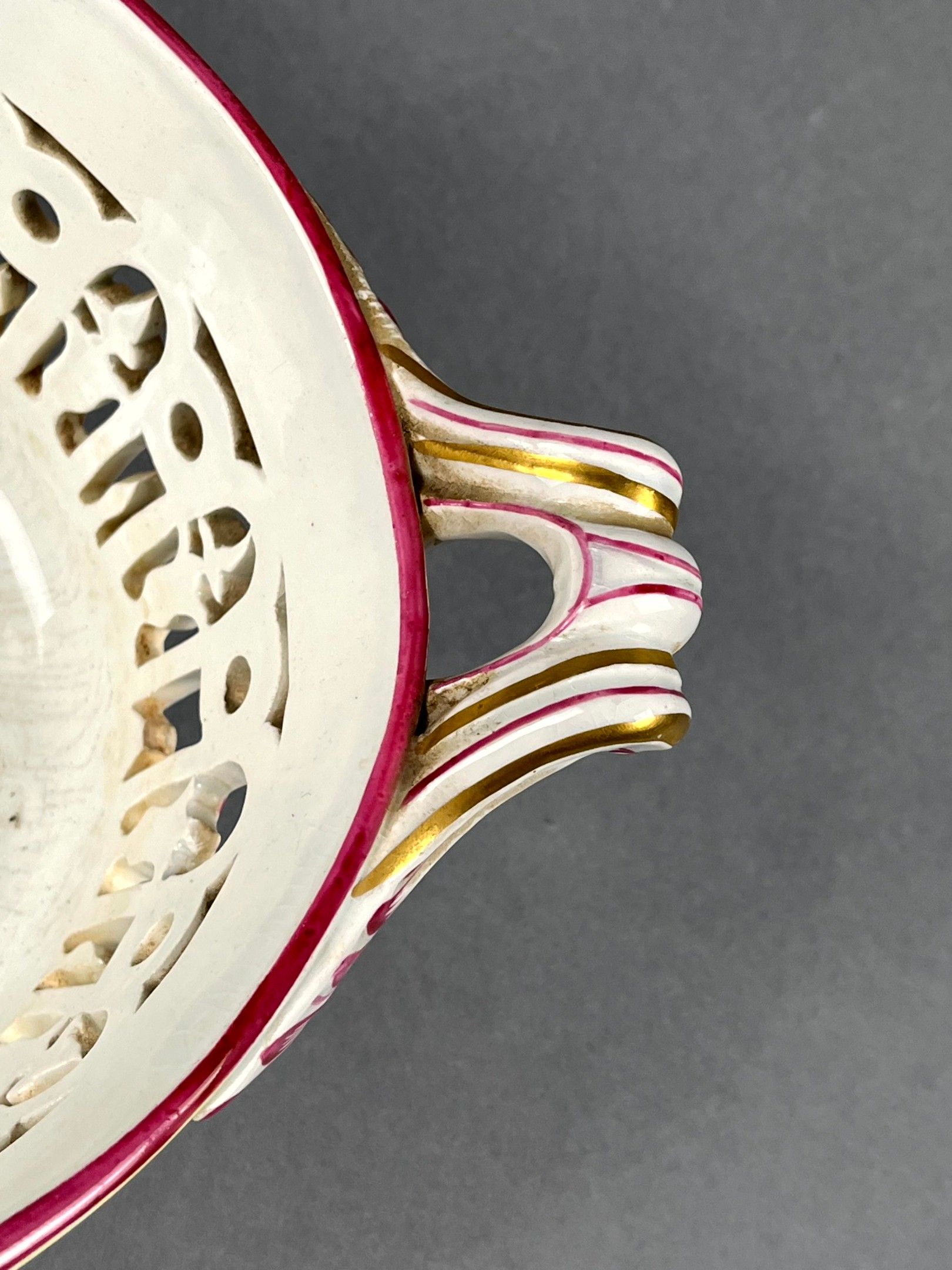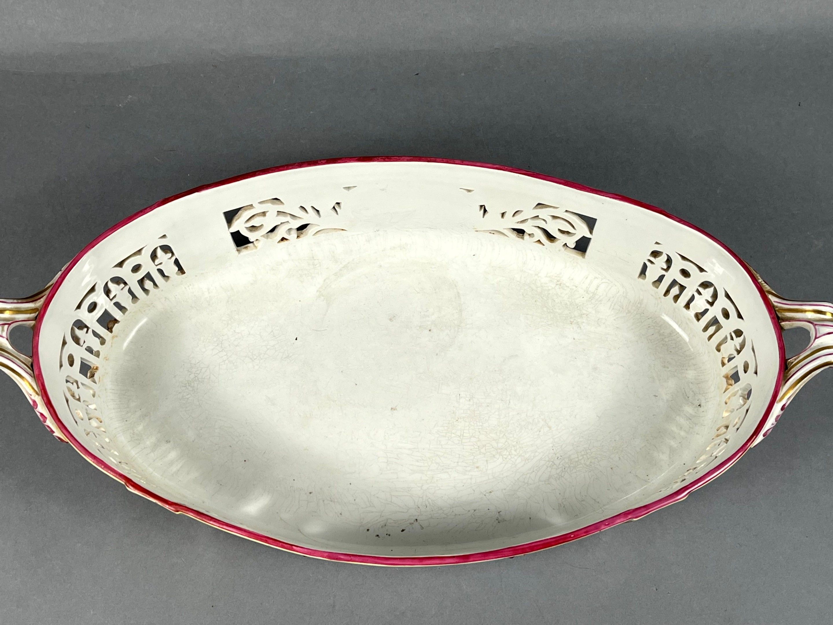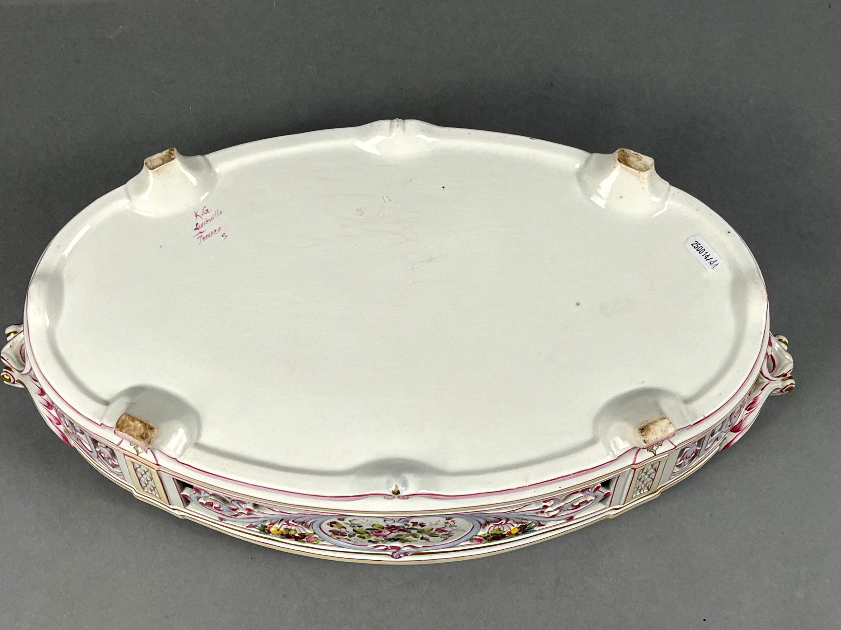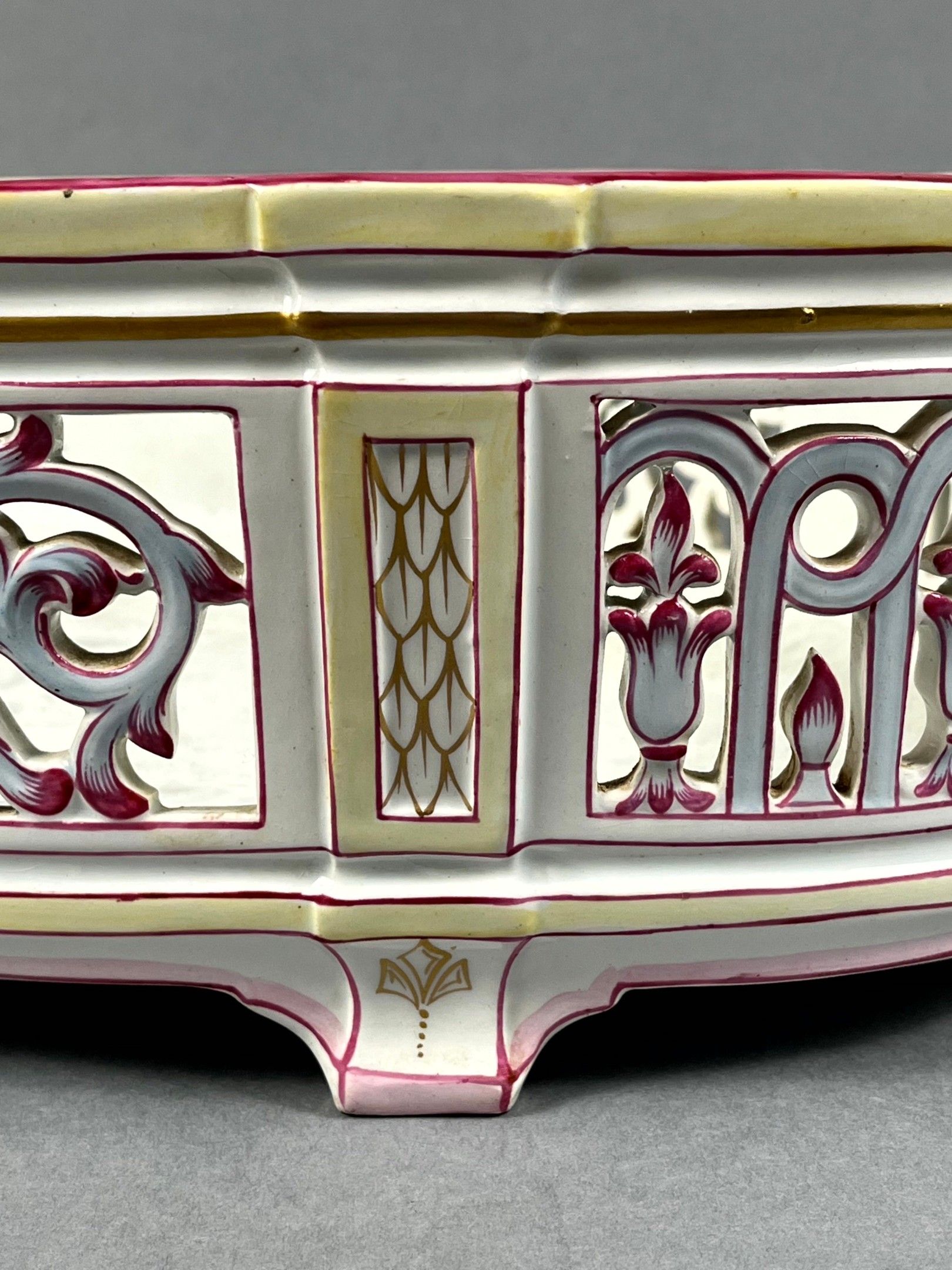 KELLER & GUERIN (KG) LUNEVILLE, France. A large oval jardinière in polychrome earthenware with gold highlights, decorated with flowers and foliage. Leafy handles. Signed. Length with handles: 55 cm. The openwork decoration is slightly missing.