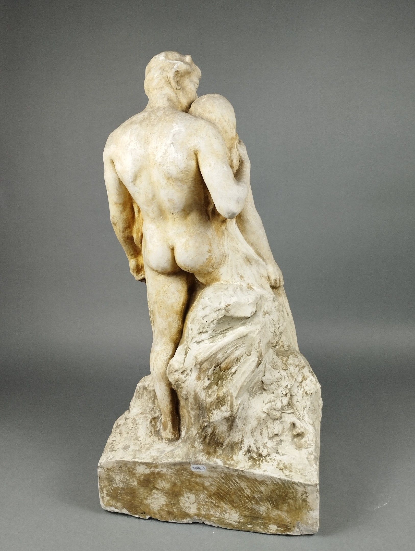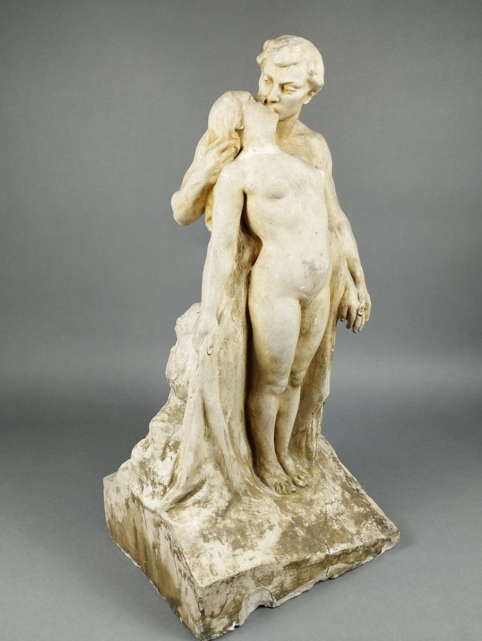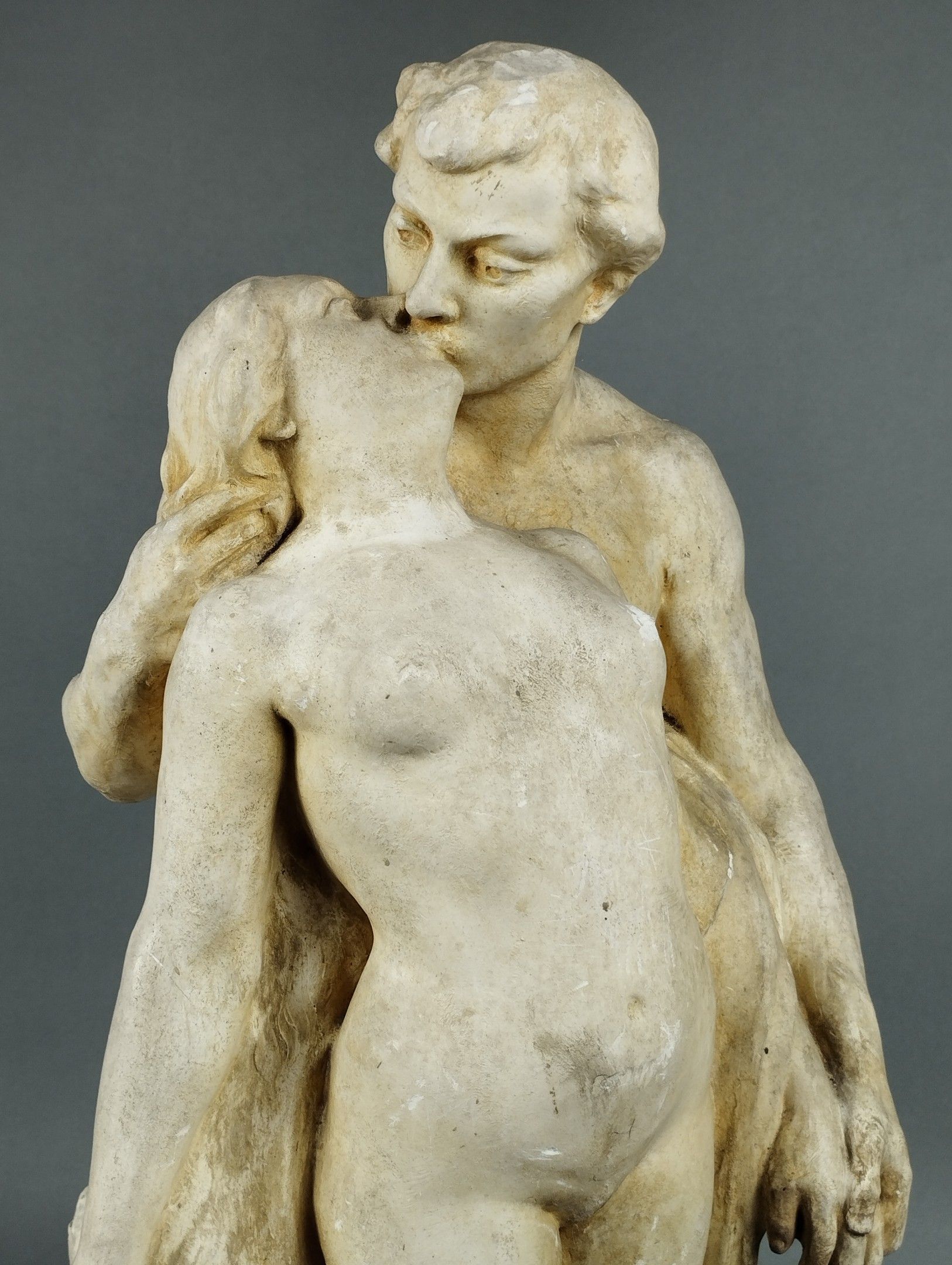 Alfred FINOT(1876-1947), Nancy - Lorraine. Large plaster group representing a nude couple kissing. Signed on the terrace. Early 20th century. 31 x 37 x 79 cm high. Minor accidents - chips to the base.