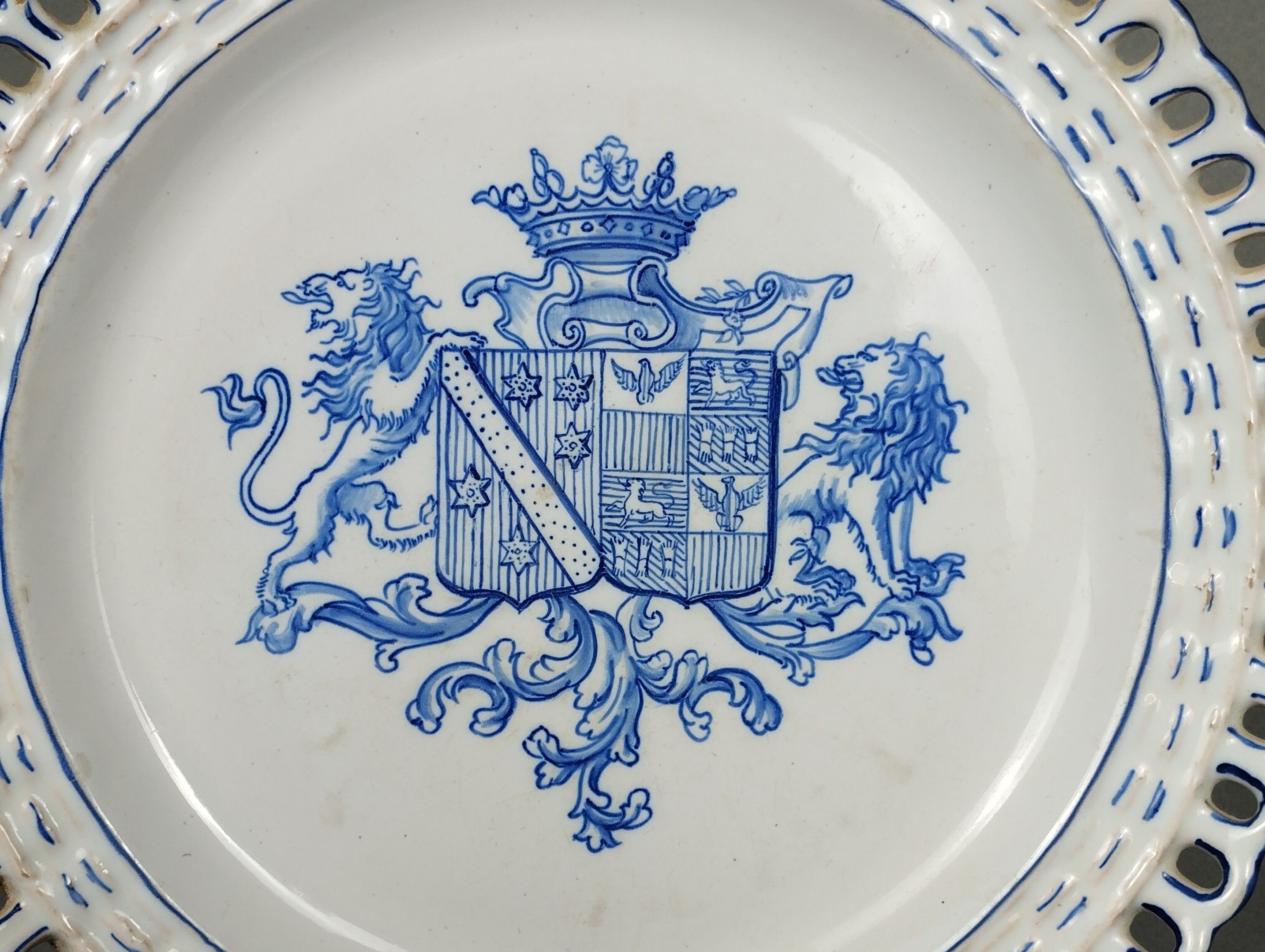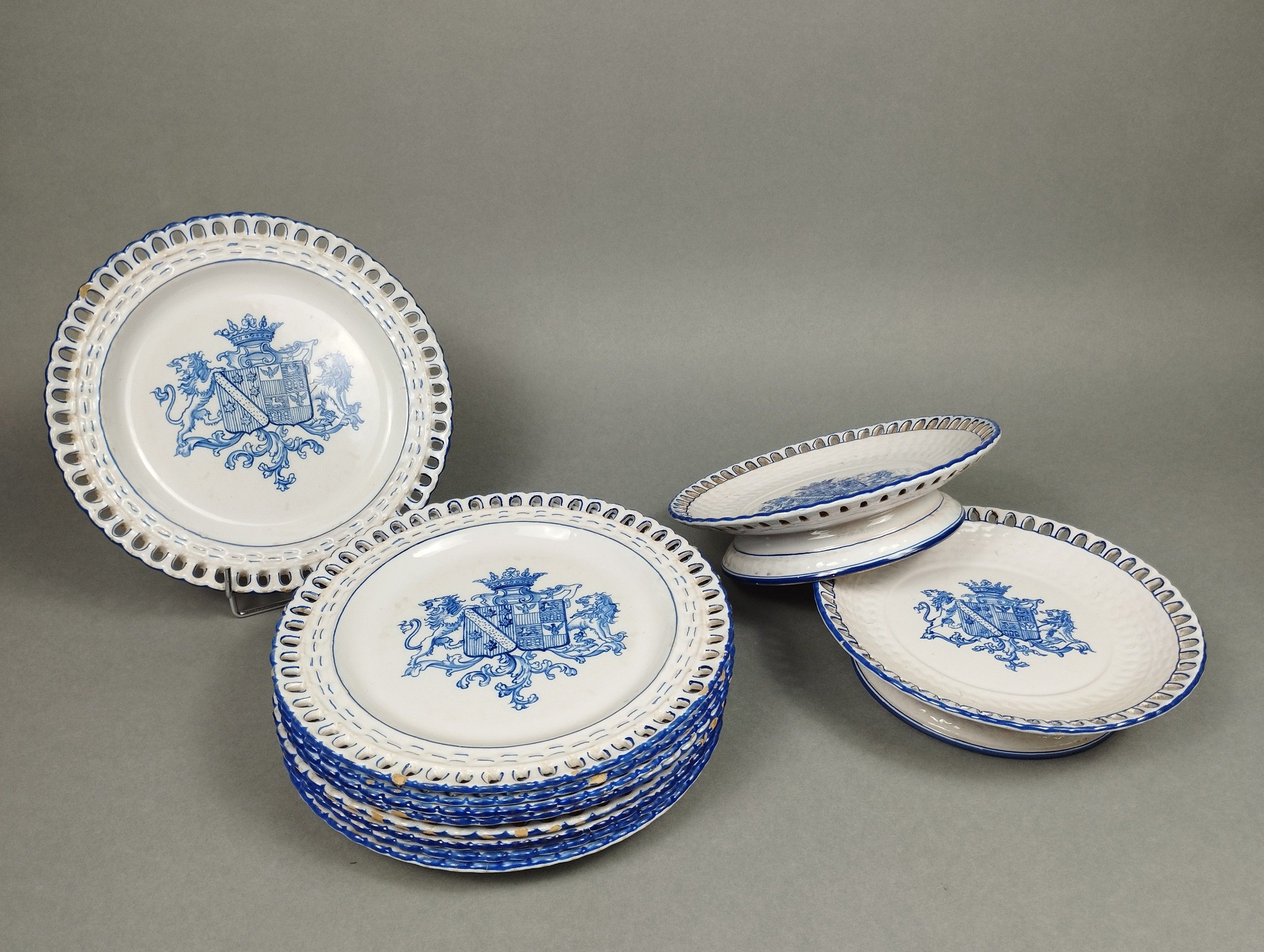 Emile GALLE (1846-1904), Nancy, for SAINT-CLEMENT (Lorraine). Suite of nine plates (diam. 23 cm) and two cake dishes (diam. 21 cm) in openwork earthenware, with heraldic decoration with the arms, under a marquis crown, of François Alexandre Prosper de GASCQ (c. 1808 - before 1876) and Henriette Catherine ROETTIERS de MONTALEAU (1817-1876). Circa 1870. Stamped. Minor accidents.