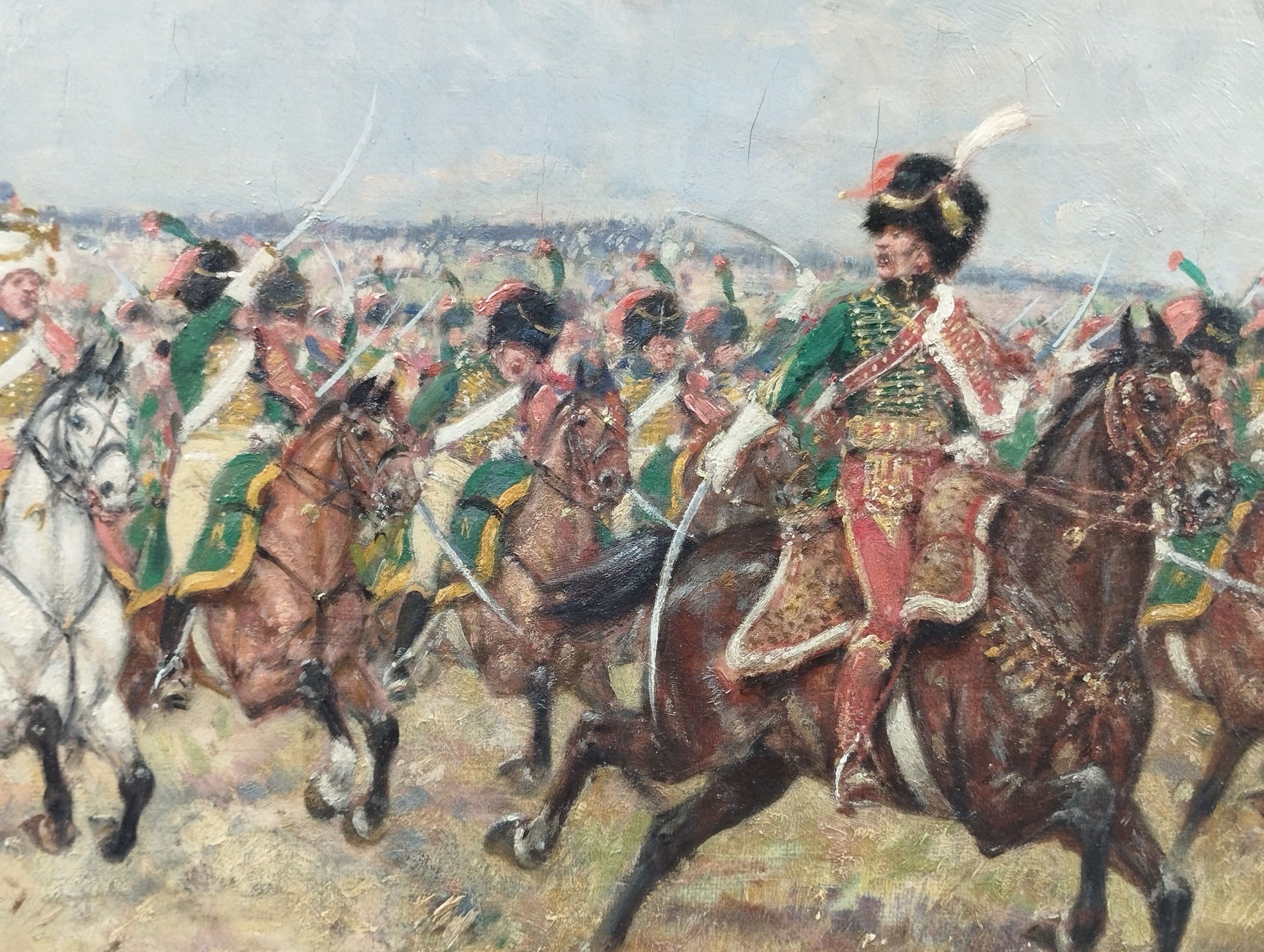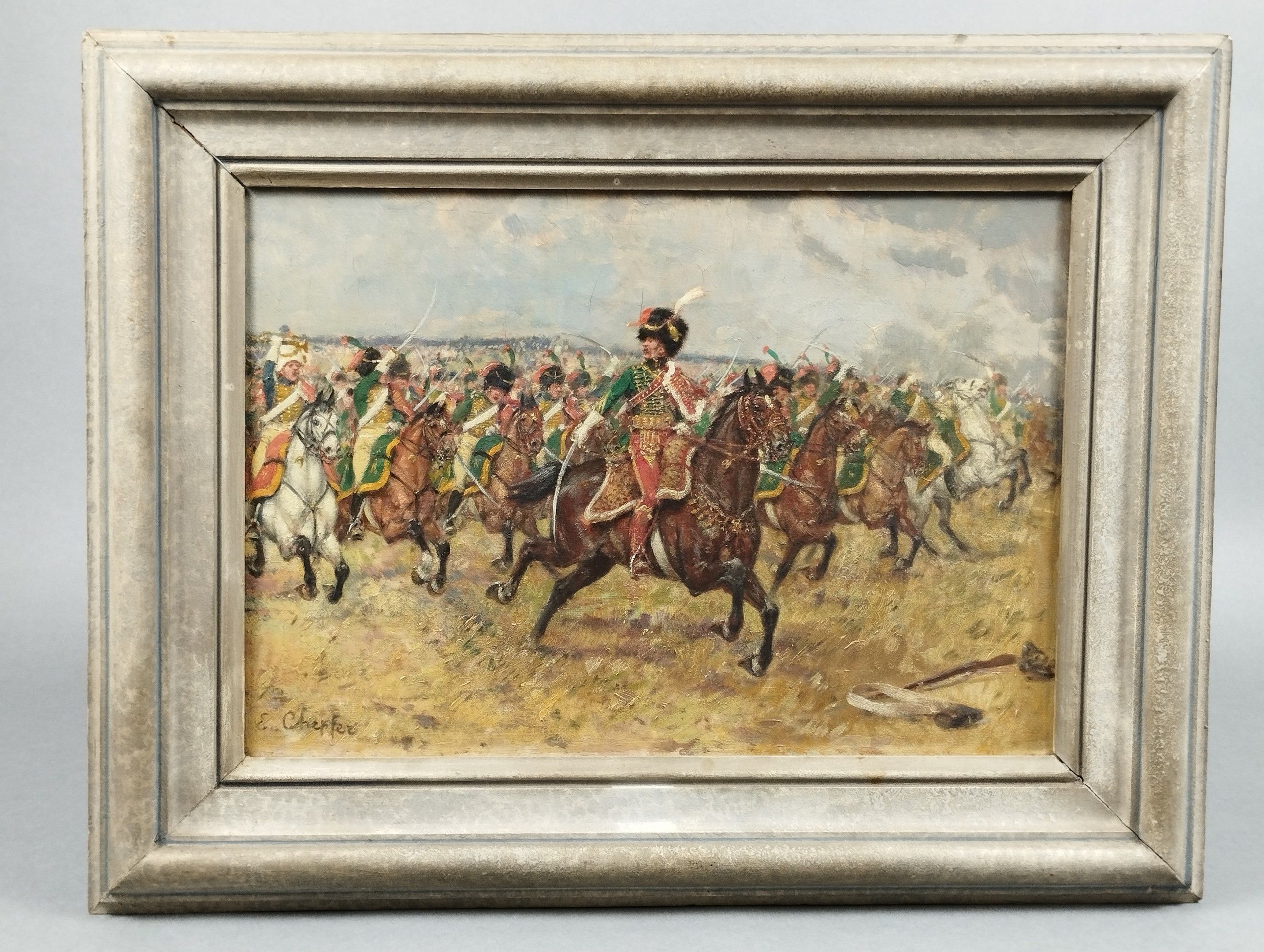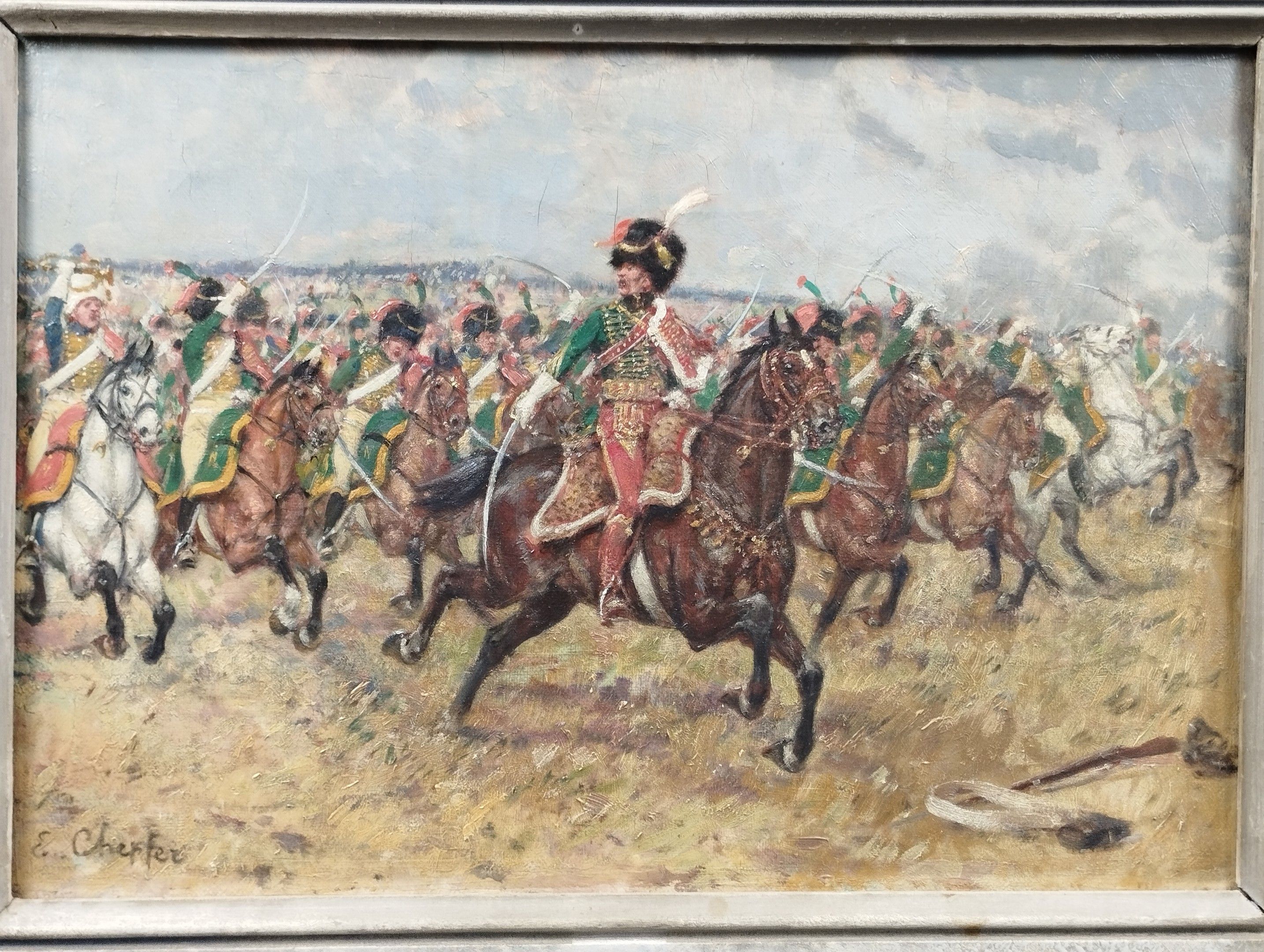 Emile CHEPFER (1876-1944), Lorraine. The Charge of the Chasseurs of the Imperial Guard. Oil on canvas, signed lower left and titled on reverse. 29 x 41 cm.