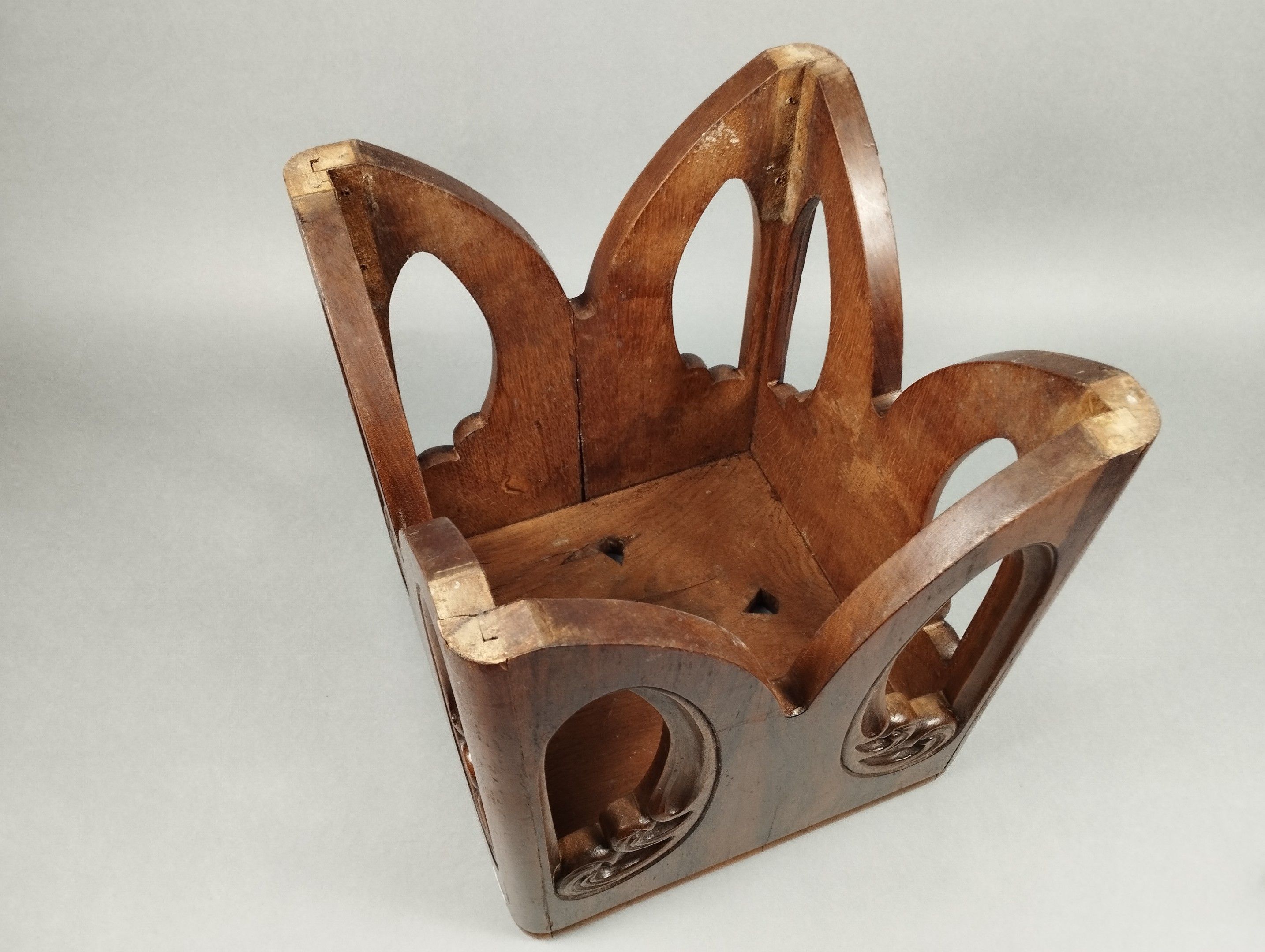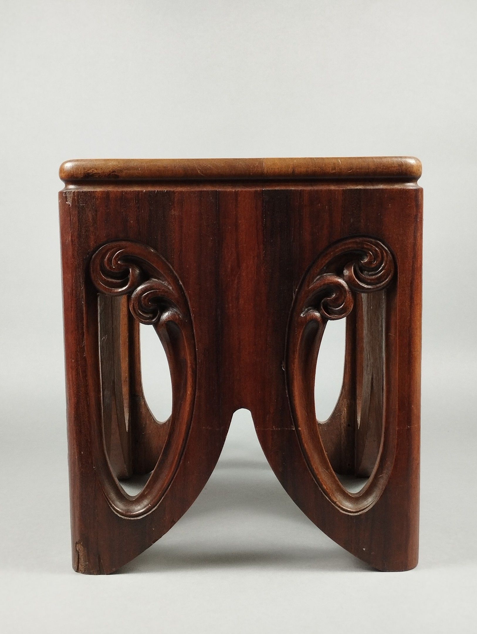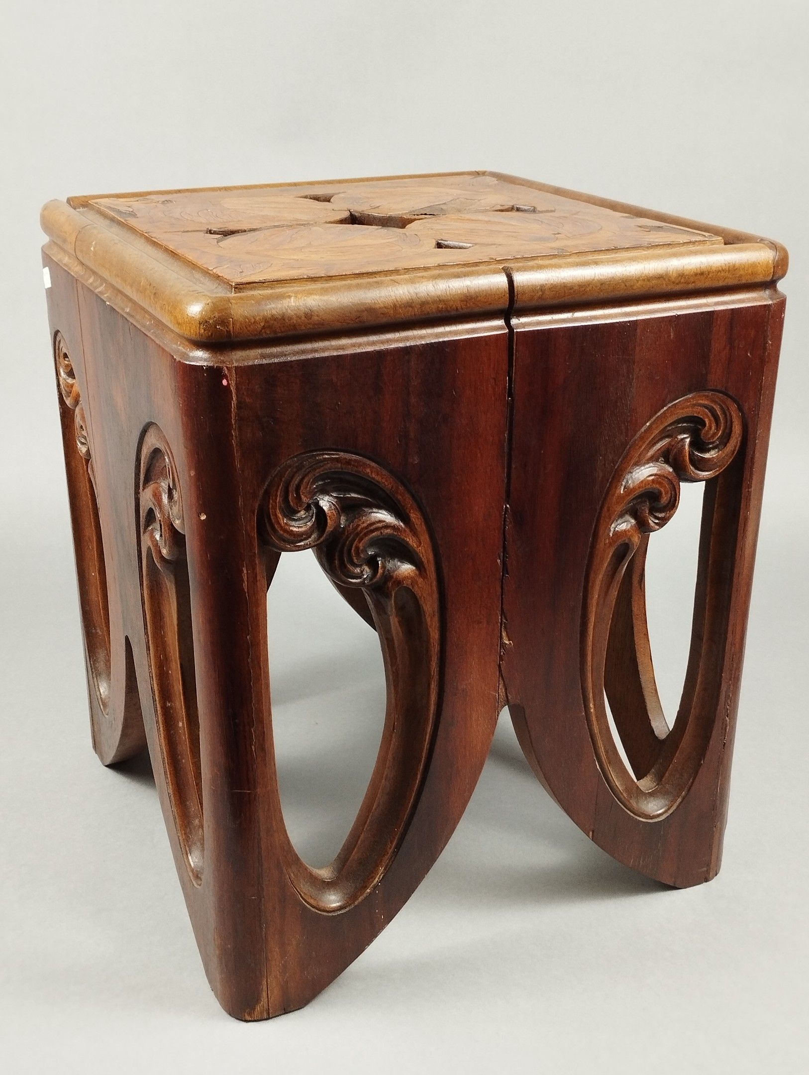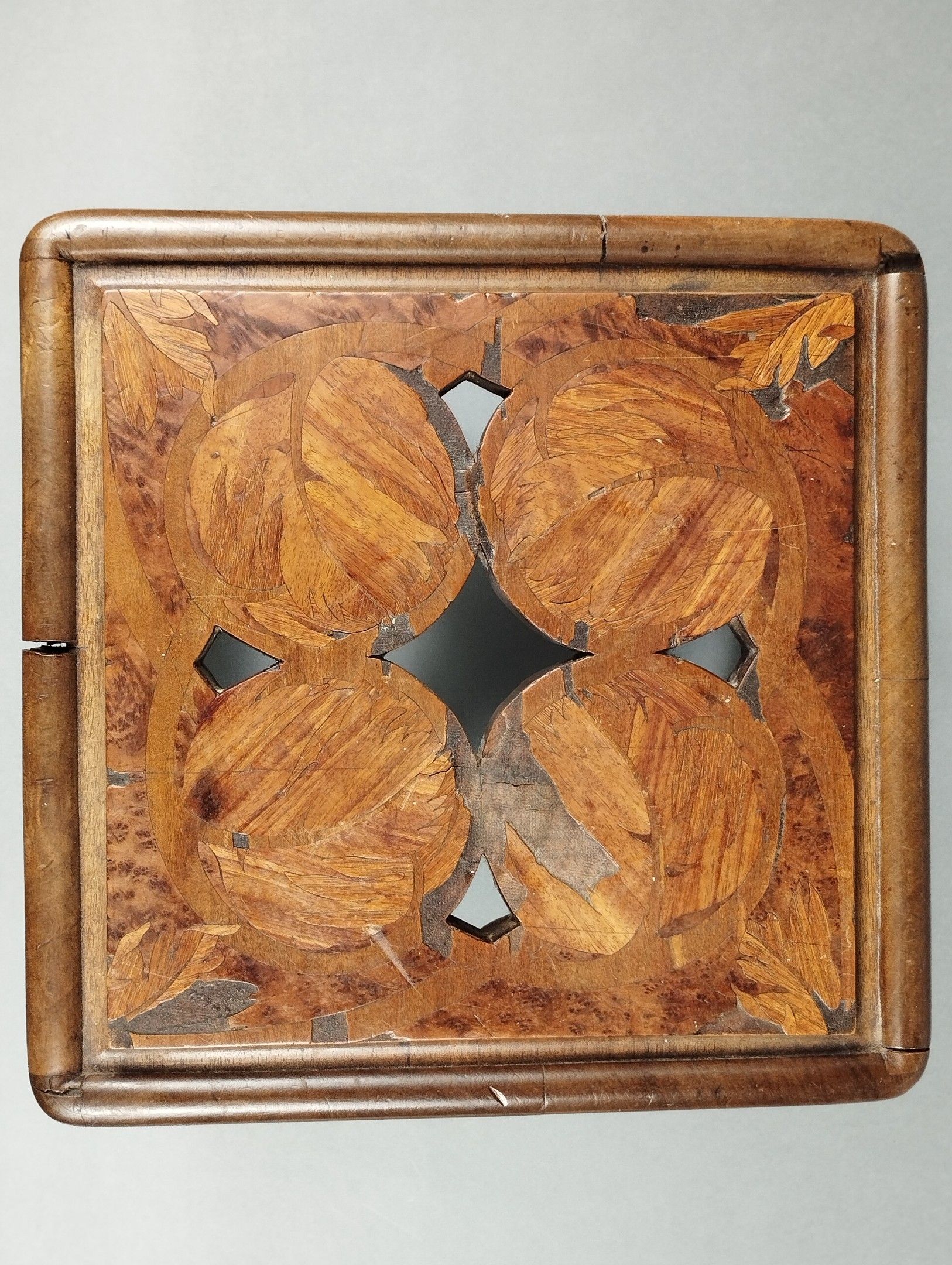 Louis MAJORELLE (1859-1926), Nancy - Lorraine. Small Art Nouveau plant-holder table decorated with ferns. A similar model was in the living room of the Villa Majorelle. Created around 1902. 34.5 x 34.5 x h. 40 cm high. Damage and missing pieces (restoration would restore this rare avant-garde table to its former glory).