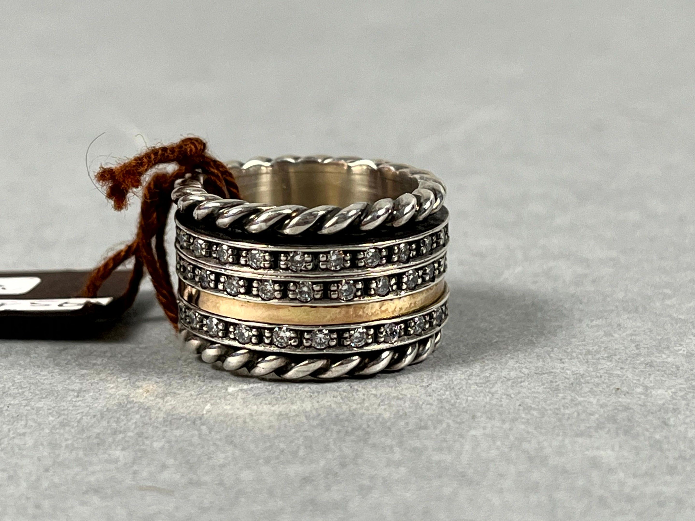 ASTORGA, Portugal. Six-ring ring in silver (925/00), set with gold (375/00), twisted and set with white stones. The four central rings are mobile. Signed. Gross weight: 19.25 g. TDD: 58. New from stock.