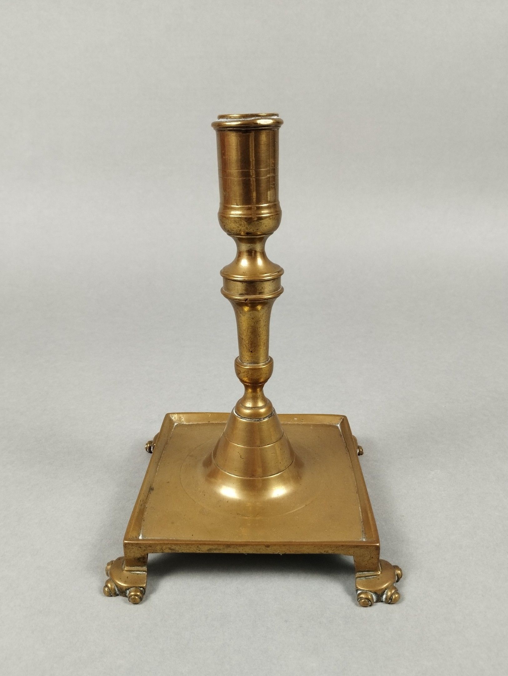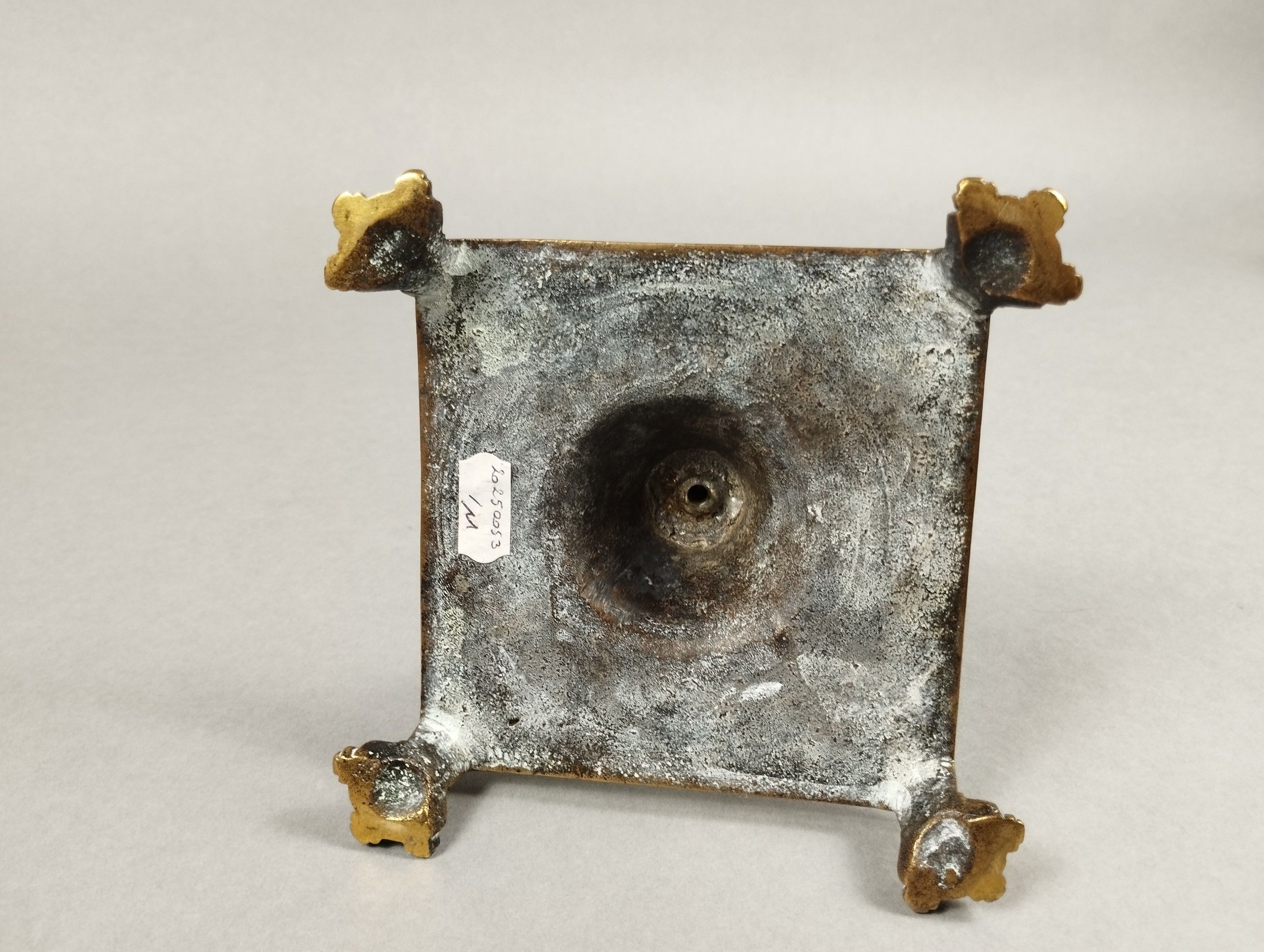 SPAIN, 17th century. A bronze candlestick with a square base resting on stylised legs. Height 22.5 cm.