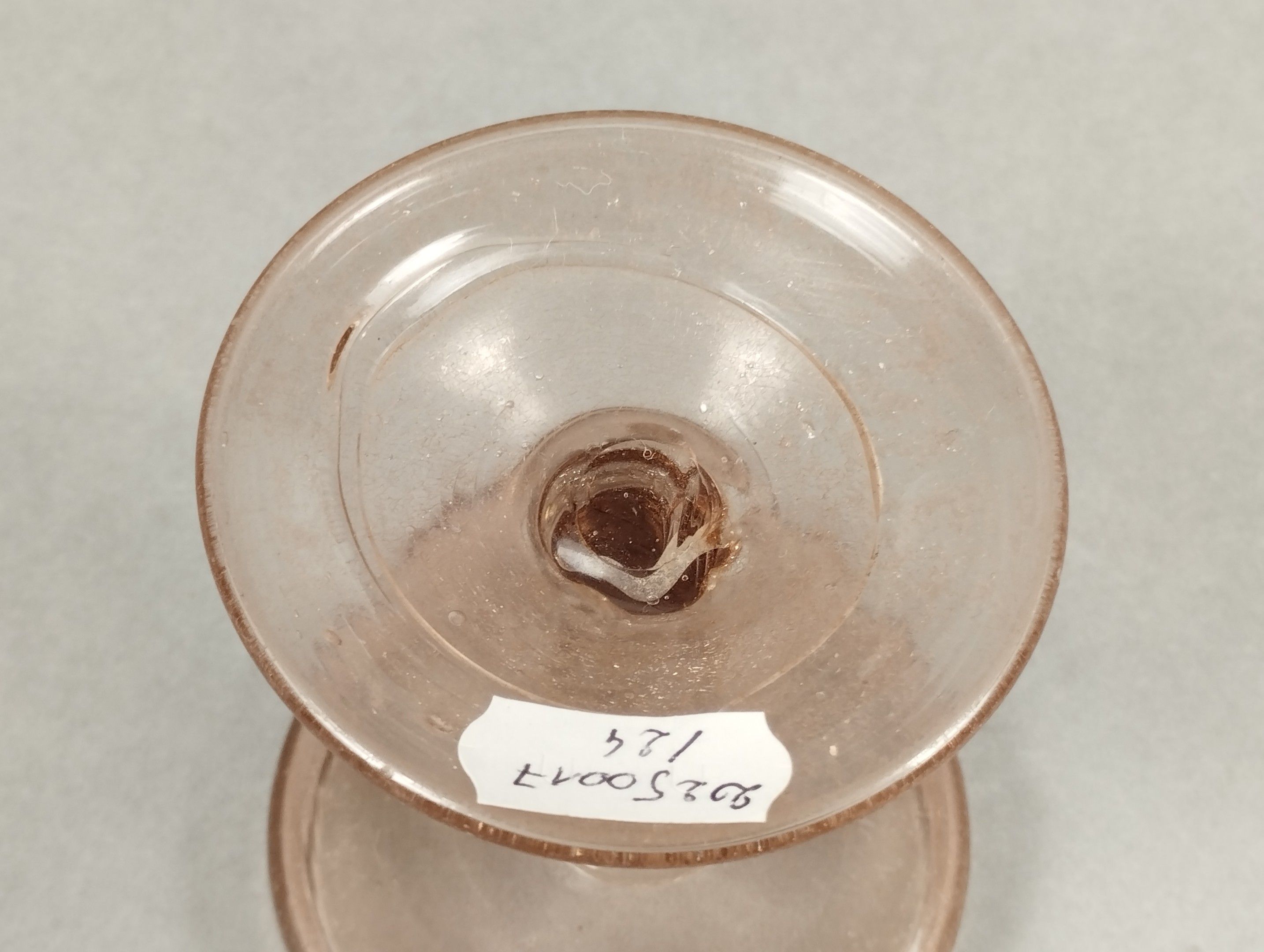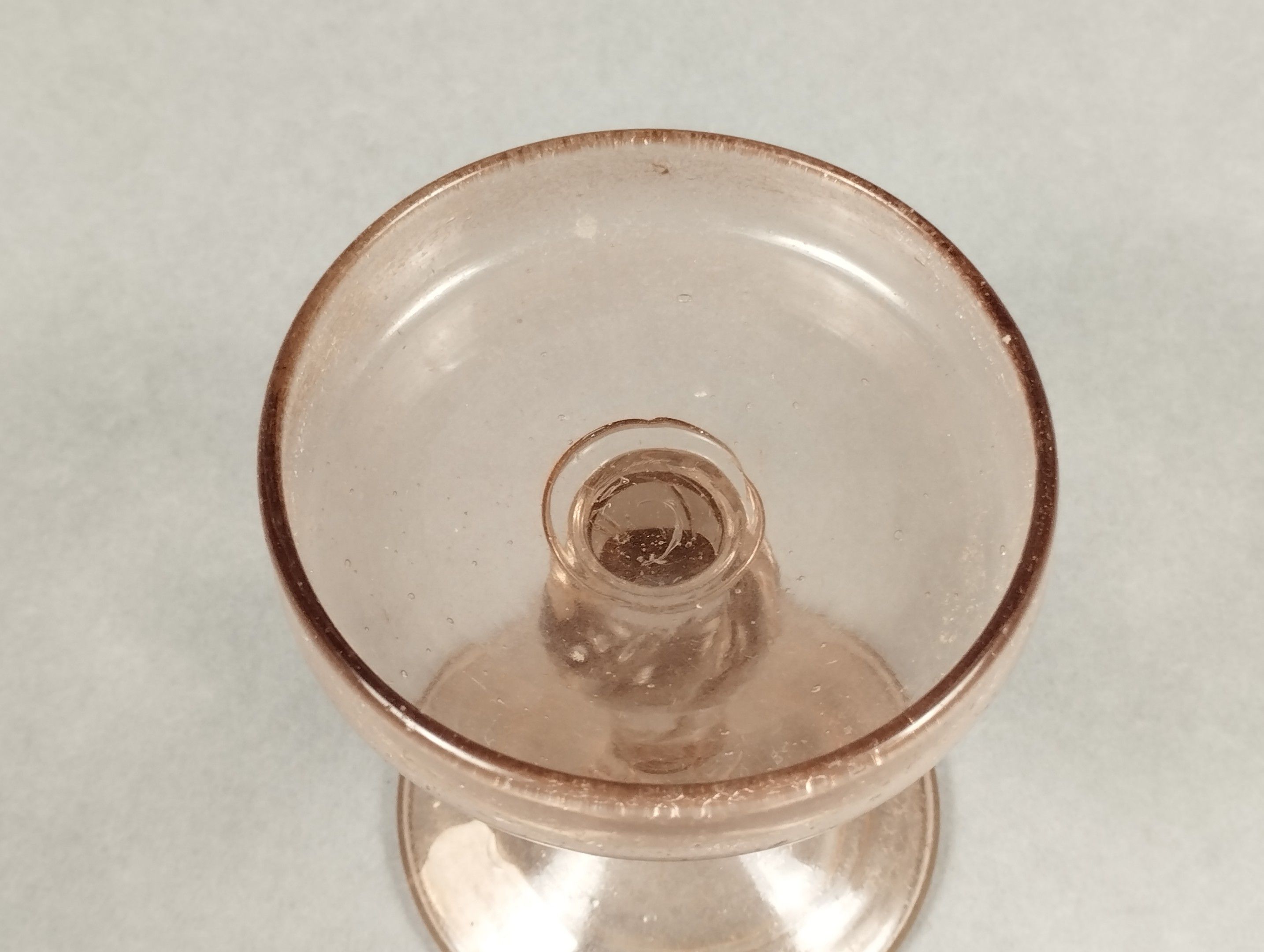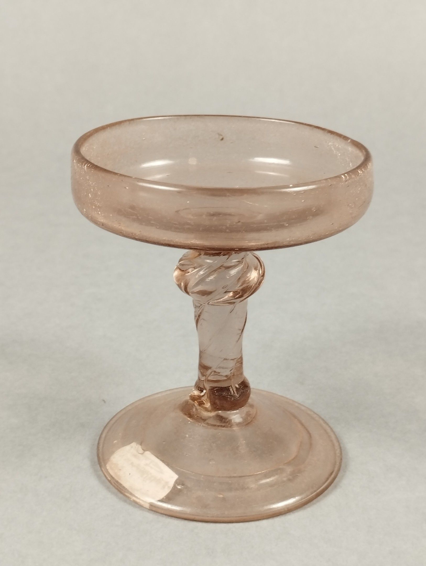 Rosé glass bowl on a foot, the stem decorated with a central knot. 16th century (?). Height 9.5 - diameter 8 cm.