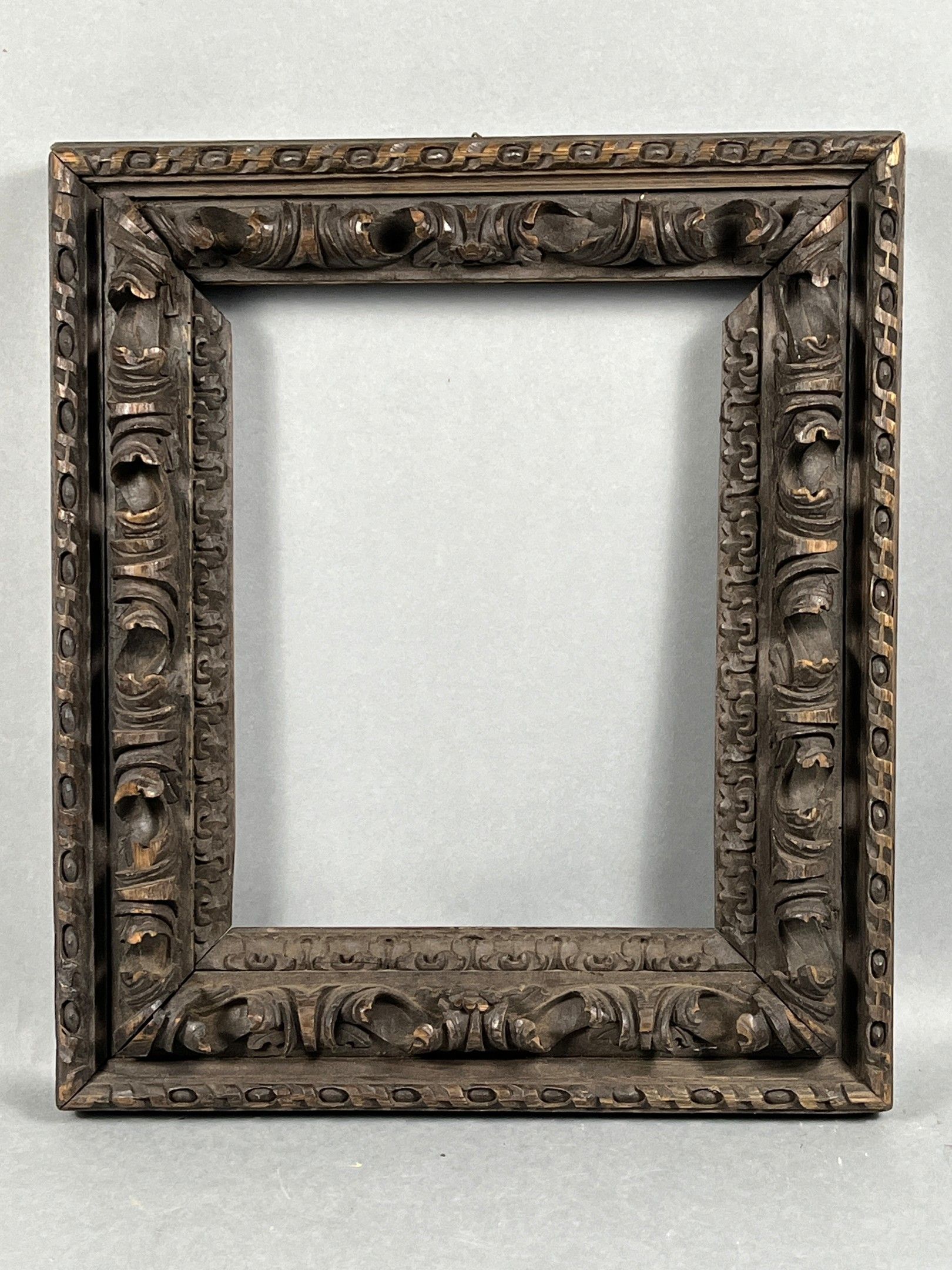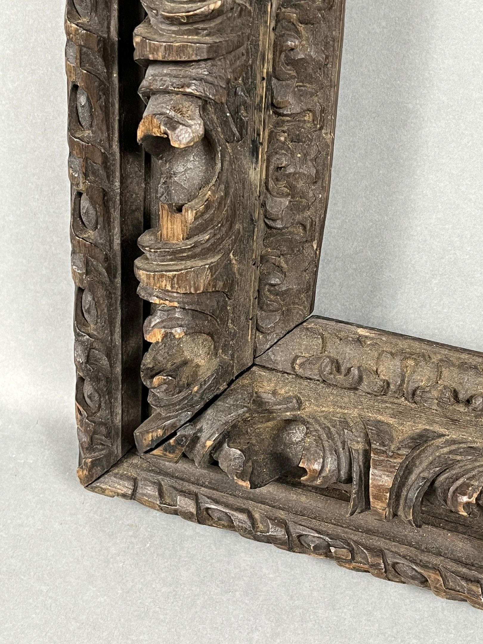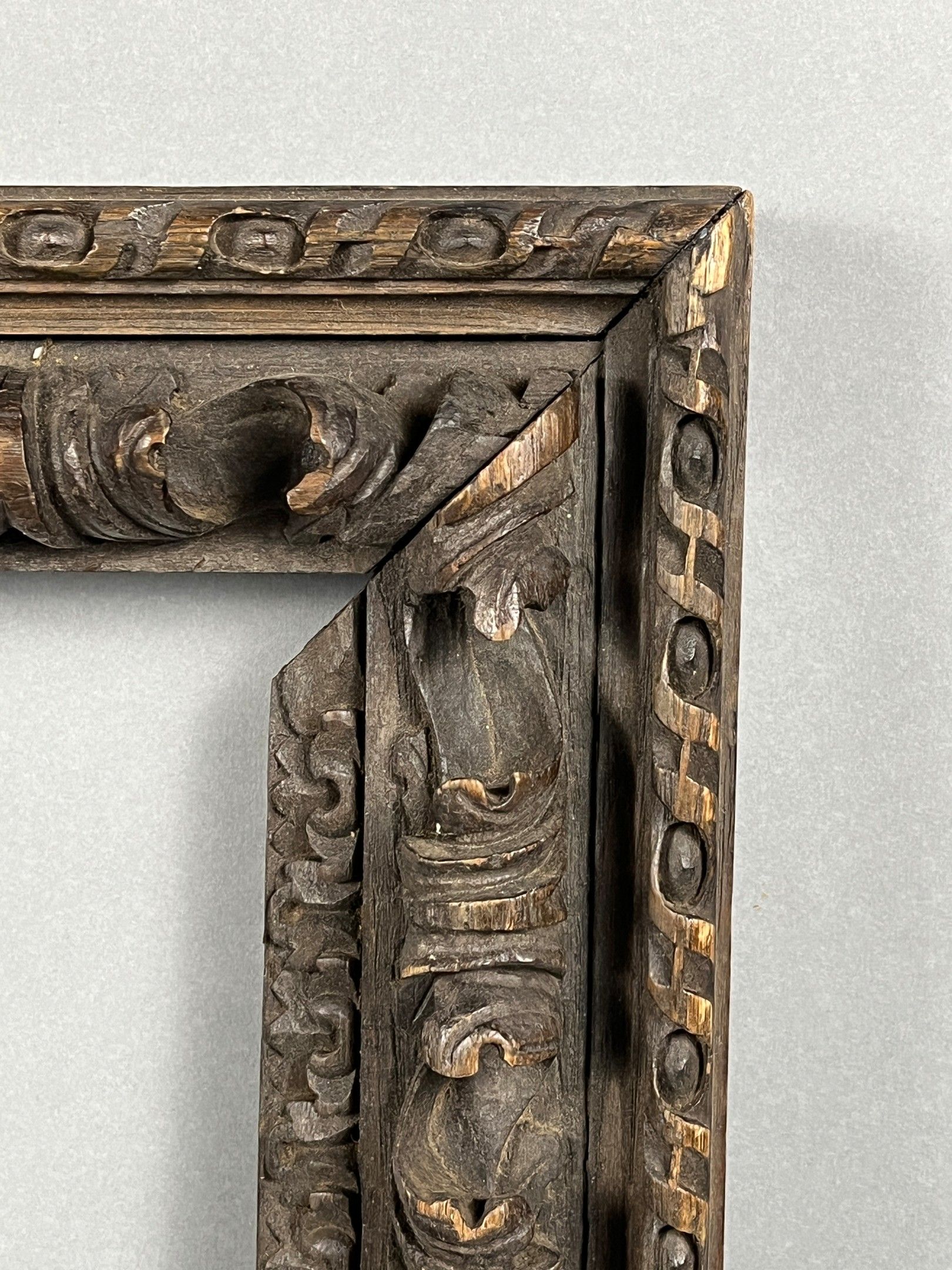Frame in natural oak, stained, with rich and deep carving of acanthus leaves in volutes. 19th century. Rebate dimensions: 36 x 31 cm. Overall dimensions: 50 x 43 cm. One top rail missing.