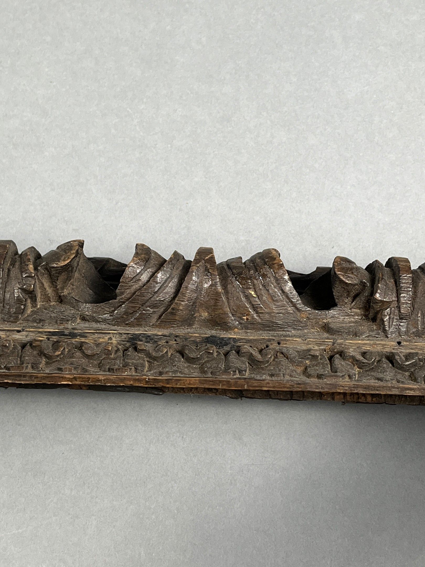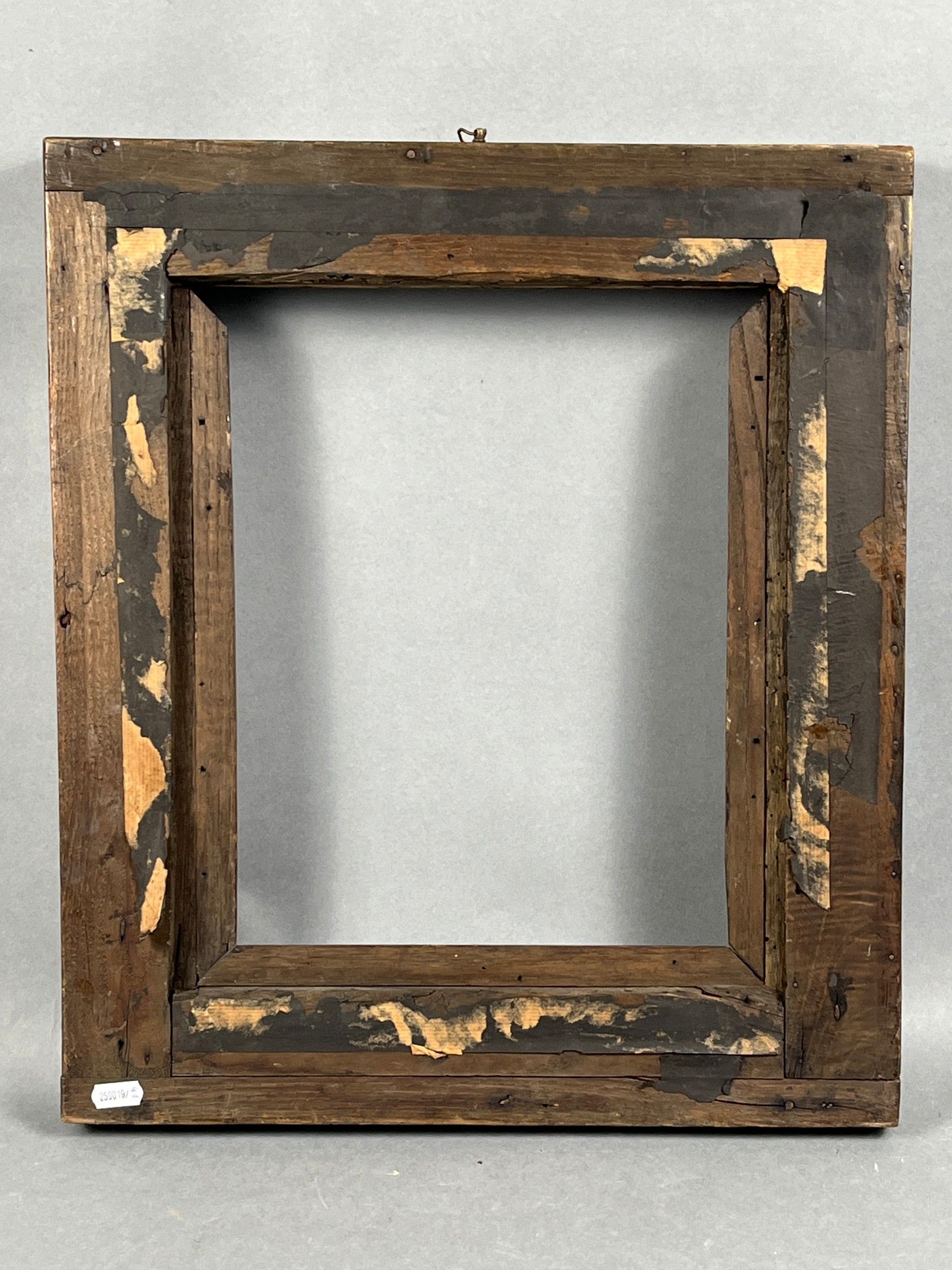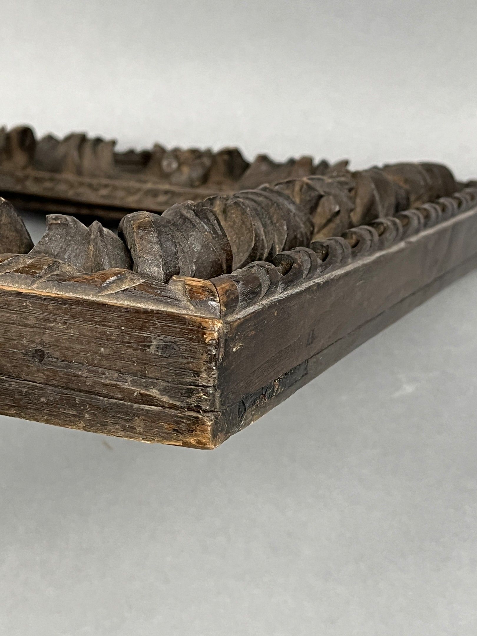 Frame in natural oak, stained, with rich and deep carving of acanthus leaves in volutes. 19th century. Rebate dimensions: 36 x 31 cm. Overall dimensions: 50 x 43 cm. One top rail missing.