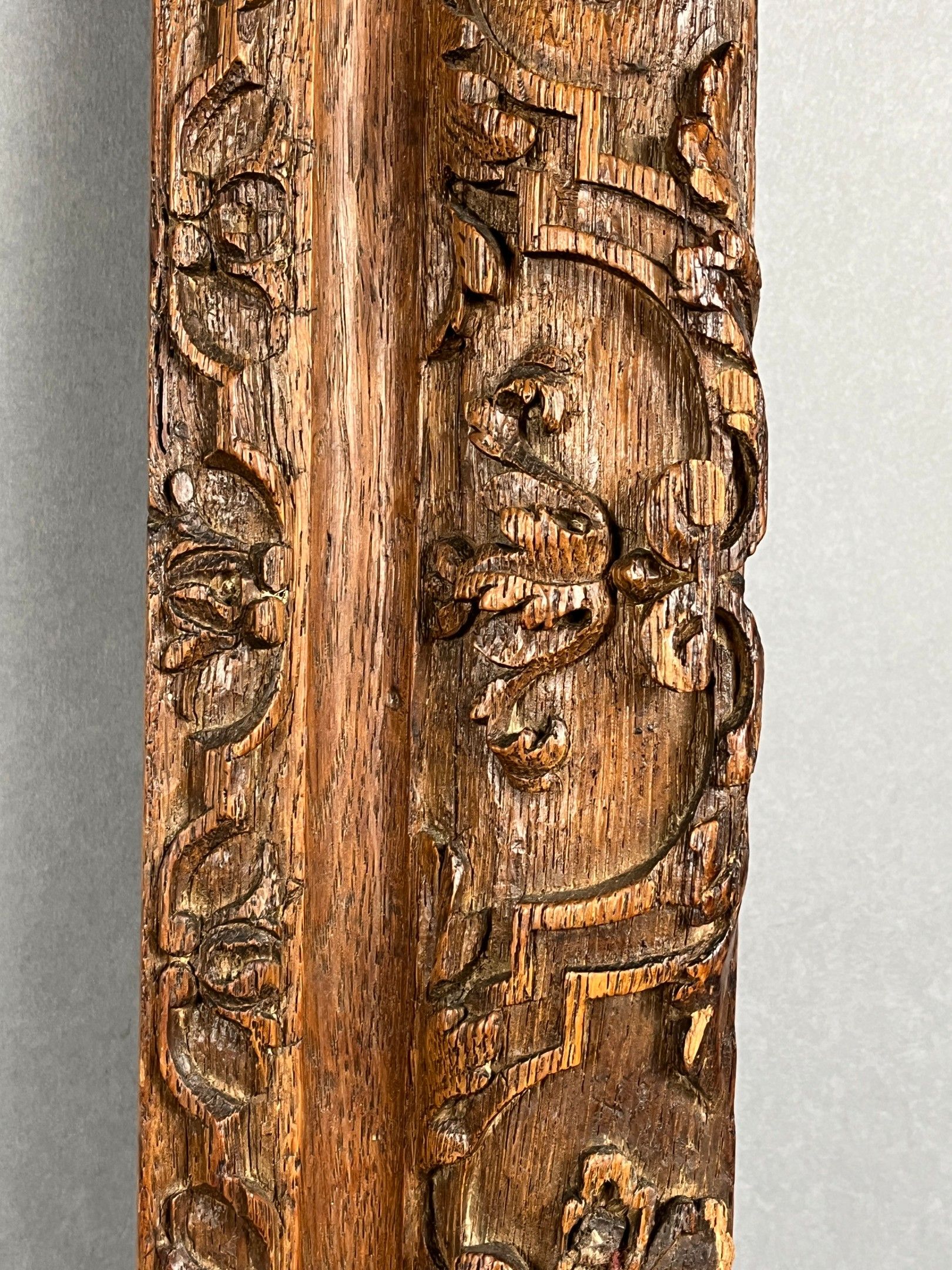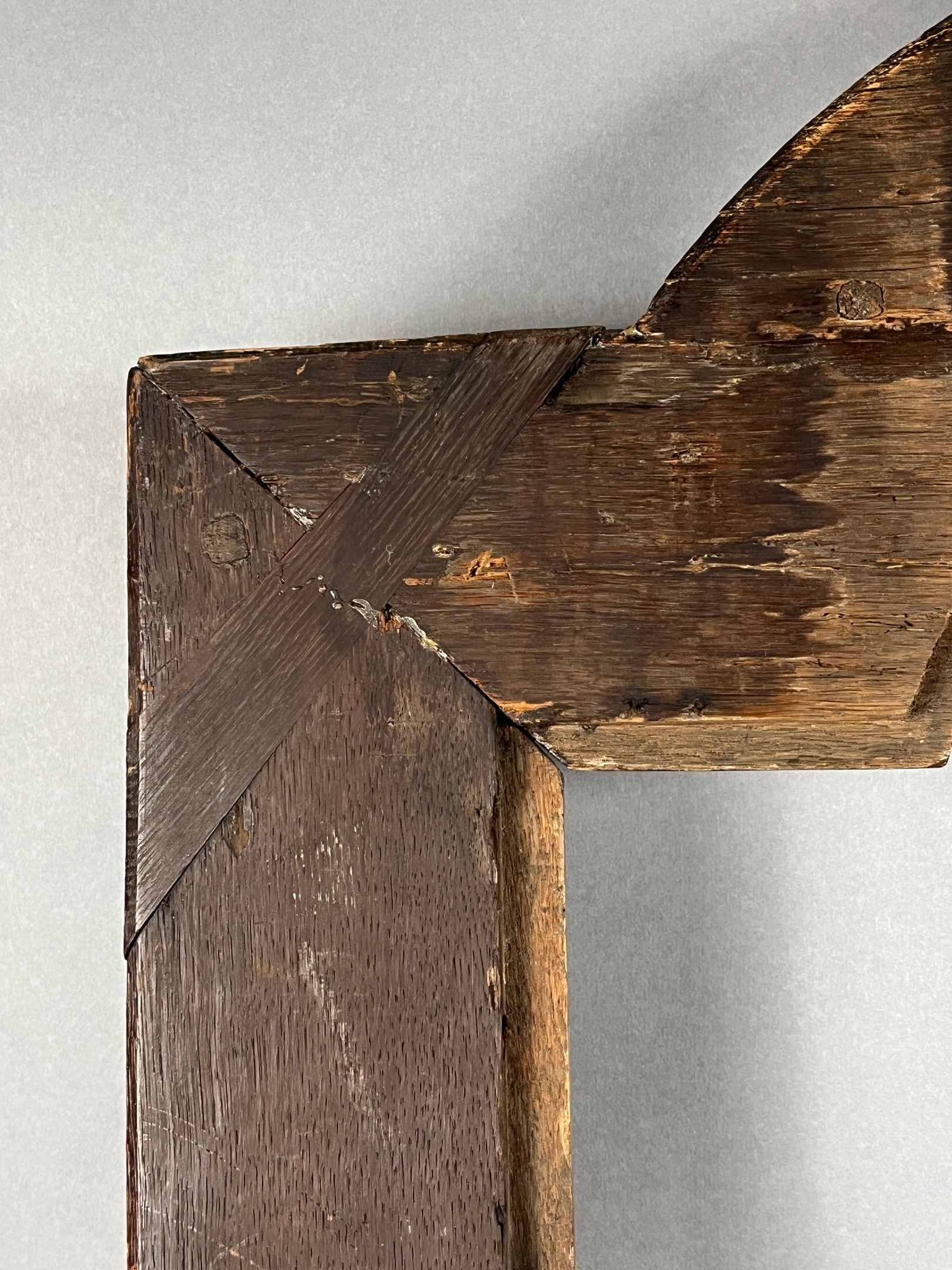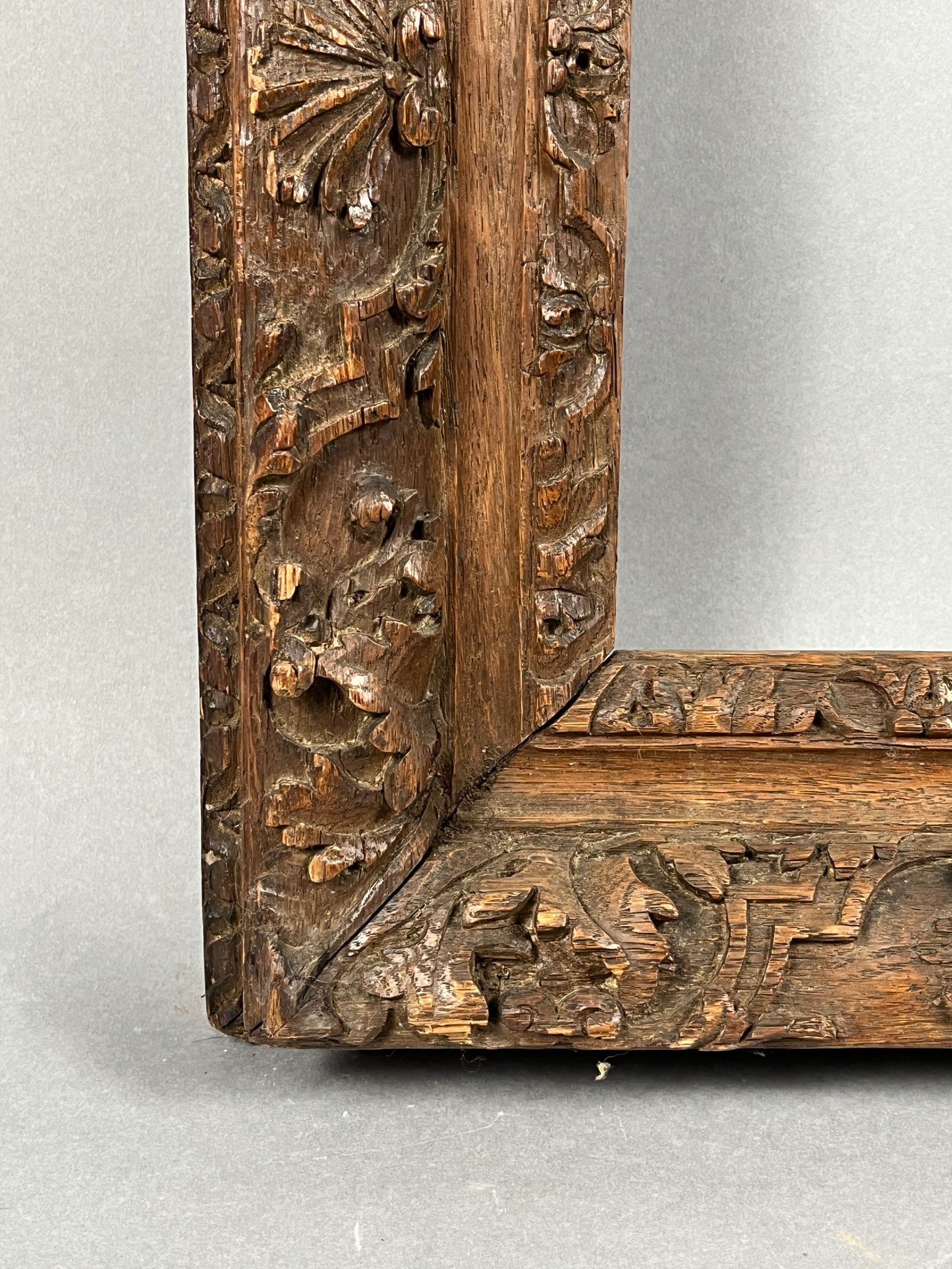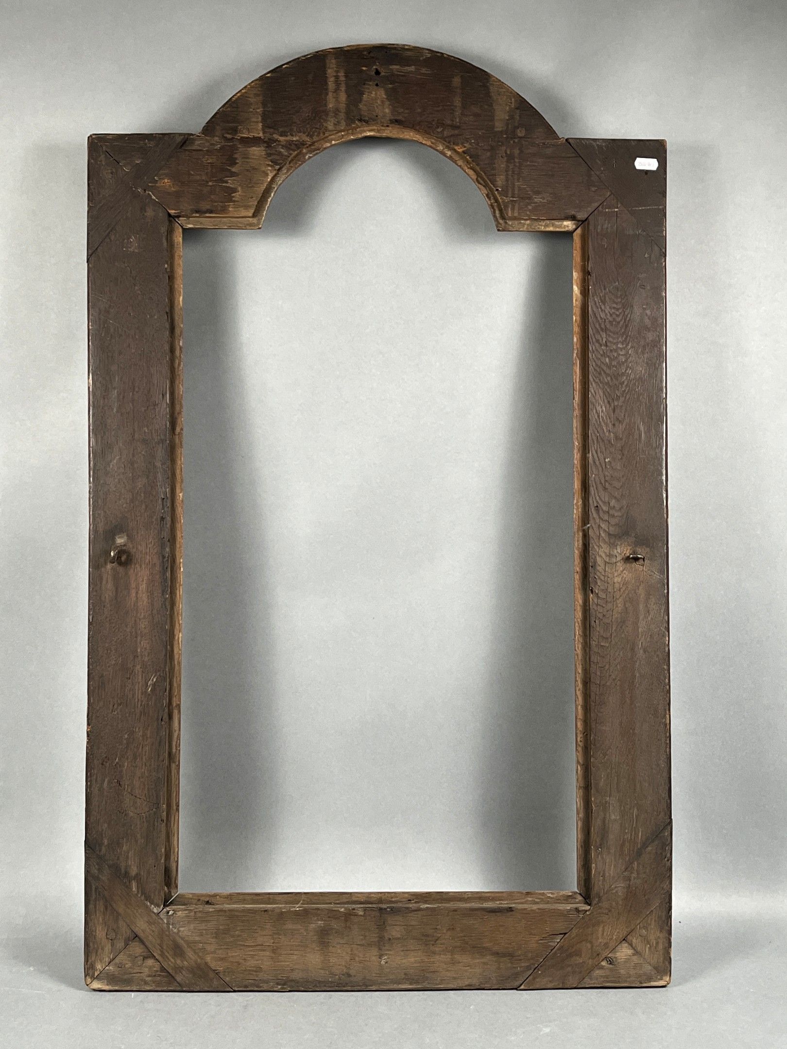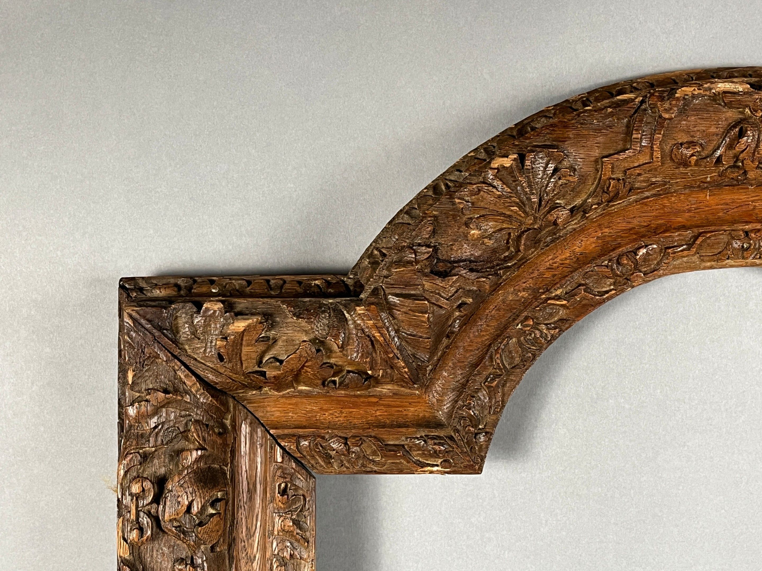 An important Louis XIV period frame with a semi-circular pediment in carved and stained oak, richly decorated with lambrequins. Circa 1700-1720, mounted with keys. Rebate dimensions: 76.5 (86 at the highest point of the pediment) x 47cm. Overall dimensions: 105 x 65 cm.