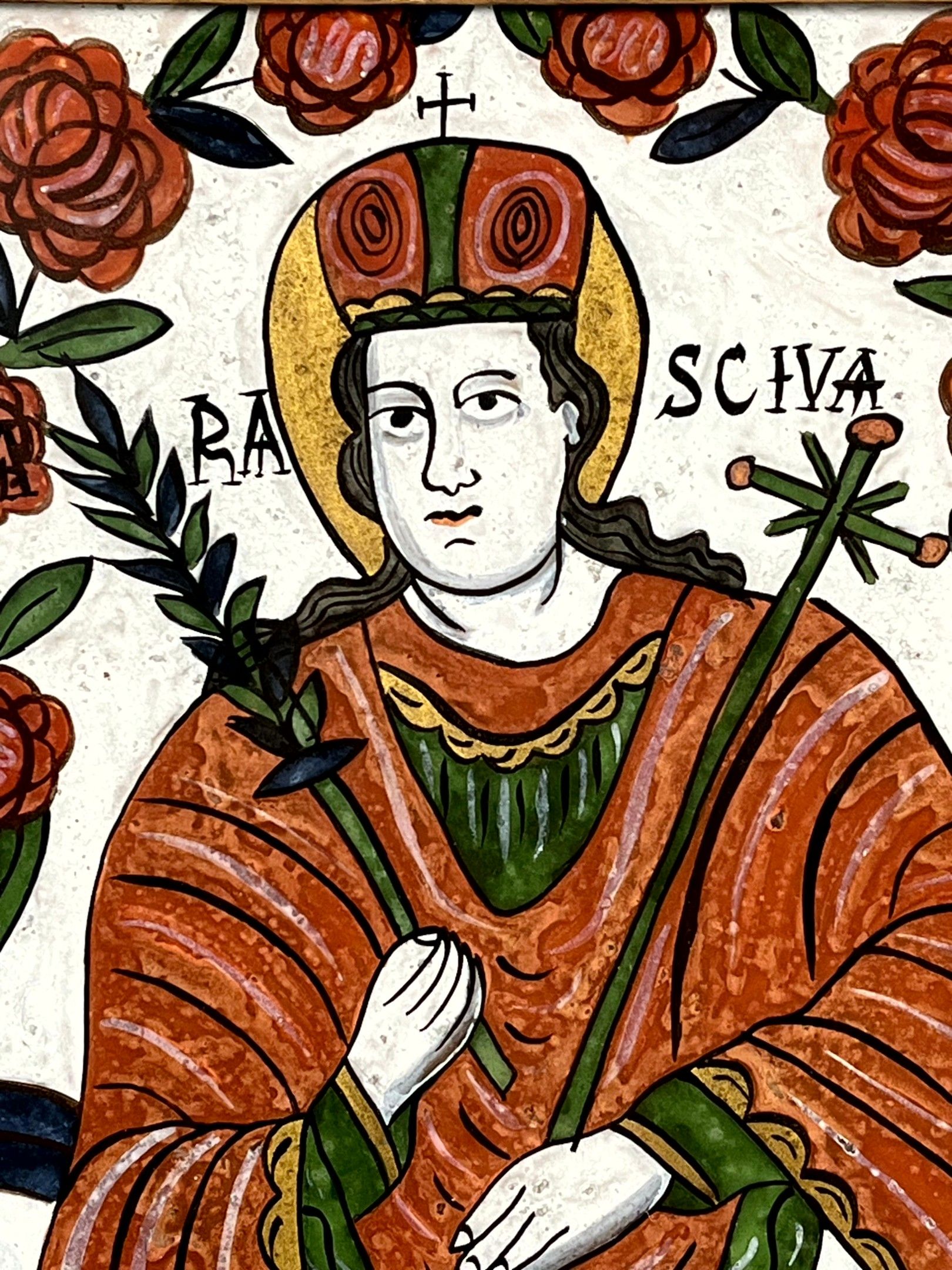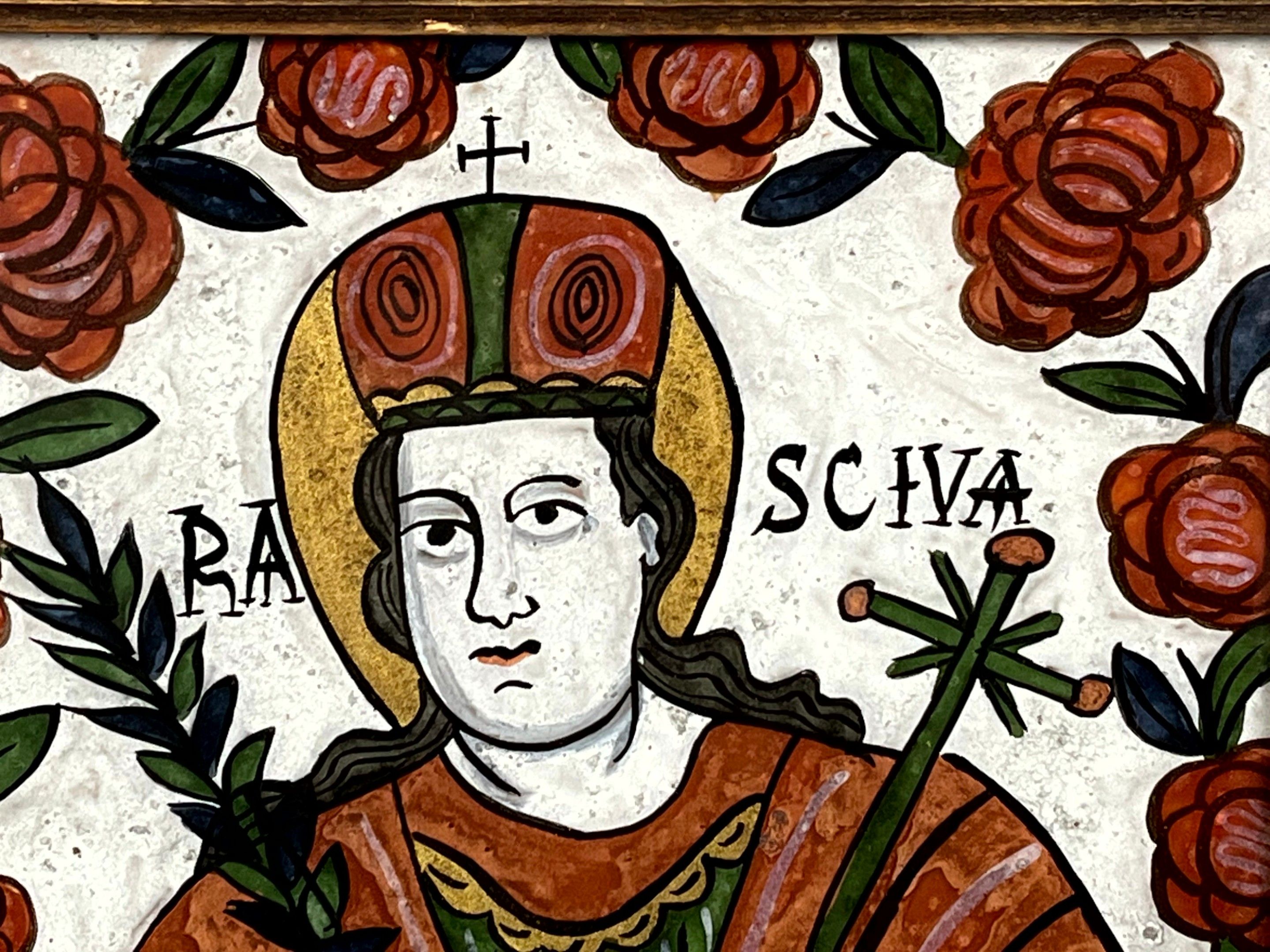 Sacred art. ROMANIA. Fixé under glass representing Saint Parascheva of the Balkans (or Parascheva of Serbia). Late 19th century. 47 x 37.5 cm. Saint Parascheva, who lived in the 11th century, is particularly honoured in the Balkans, Romania and Ukraine.