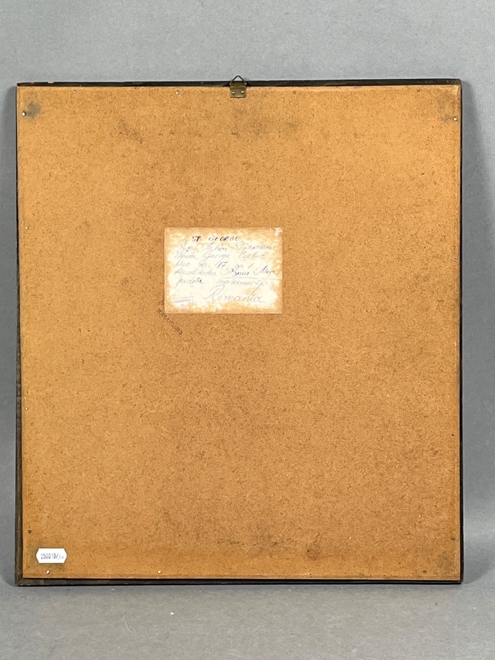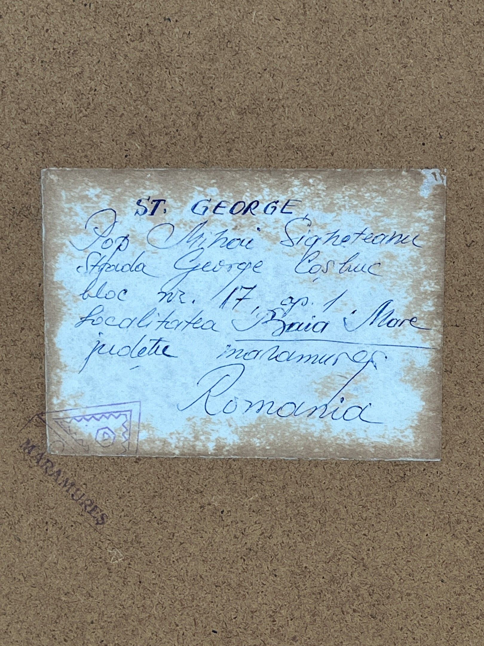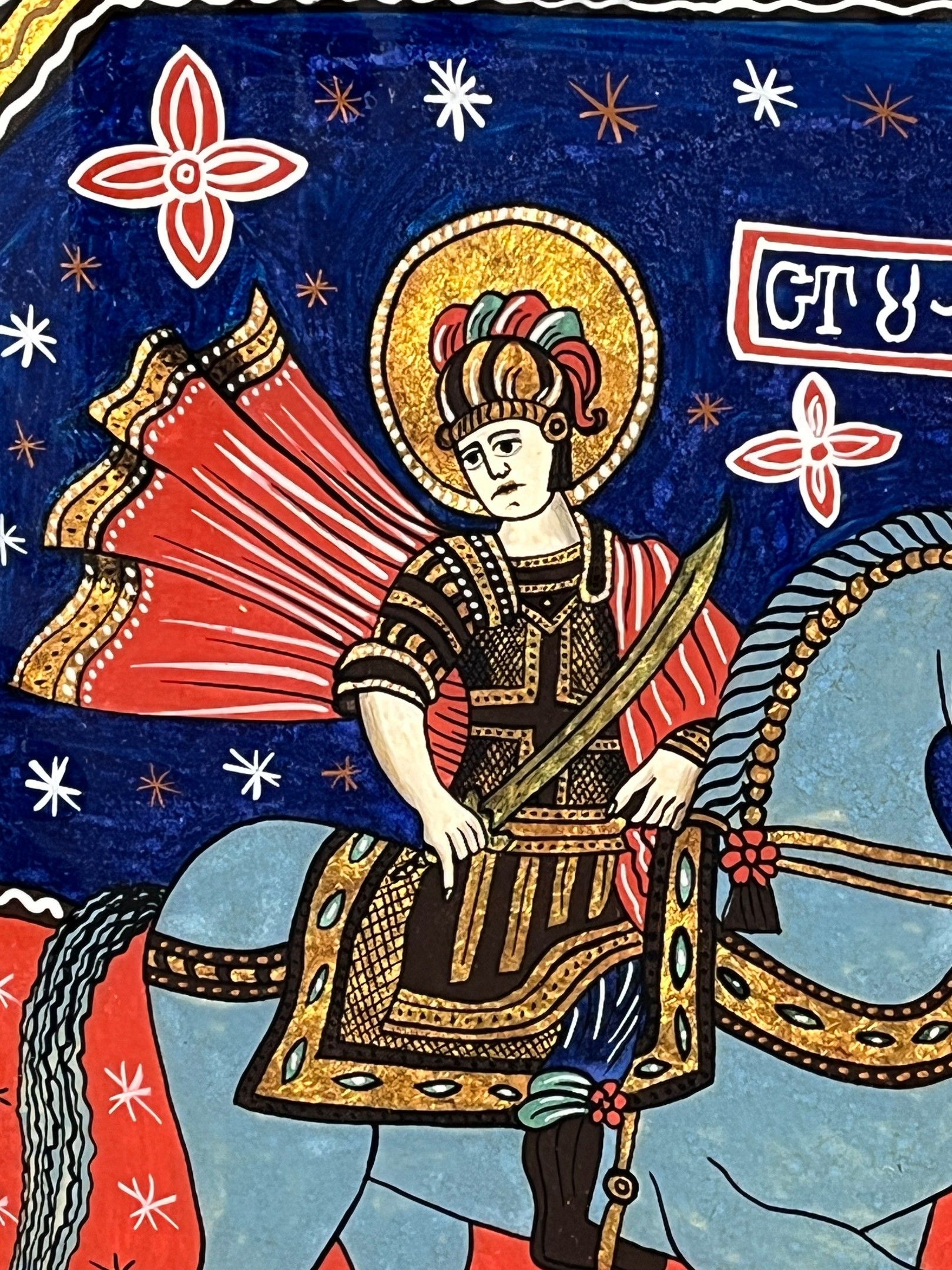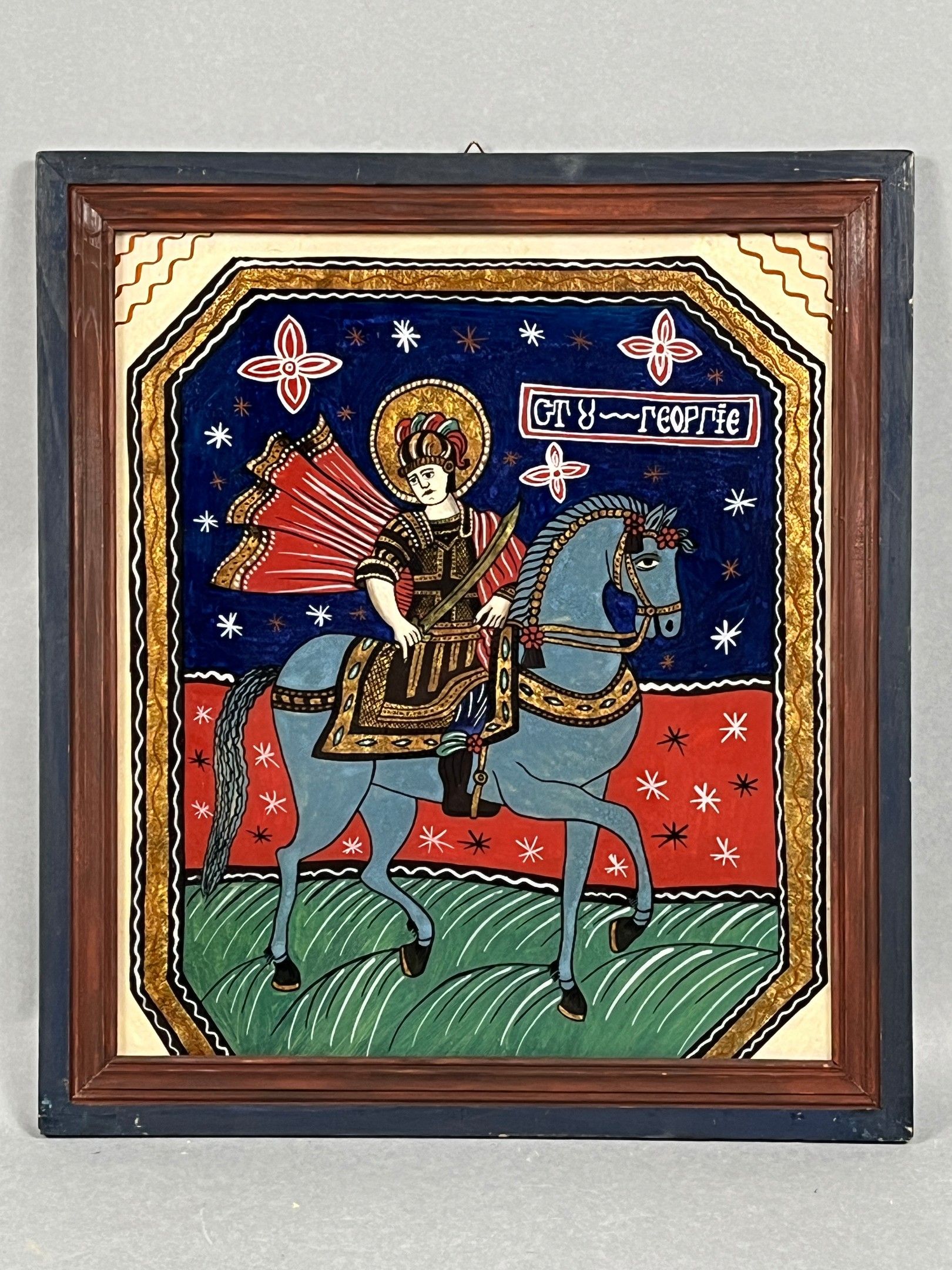 Sacred art. Pop Mihai SIGHETEANU (20th century), Romania. Mounted under glass depicting Saint George with sword in hand, in armour. 1980s. 44 x 39 cm.