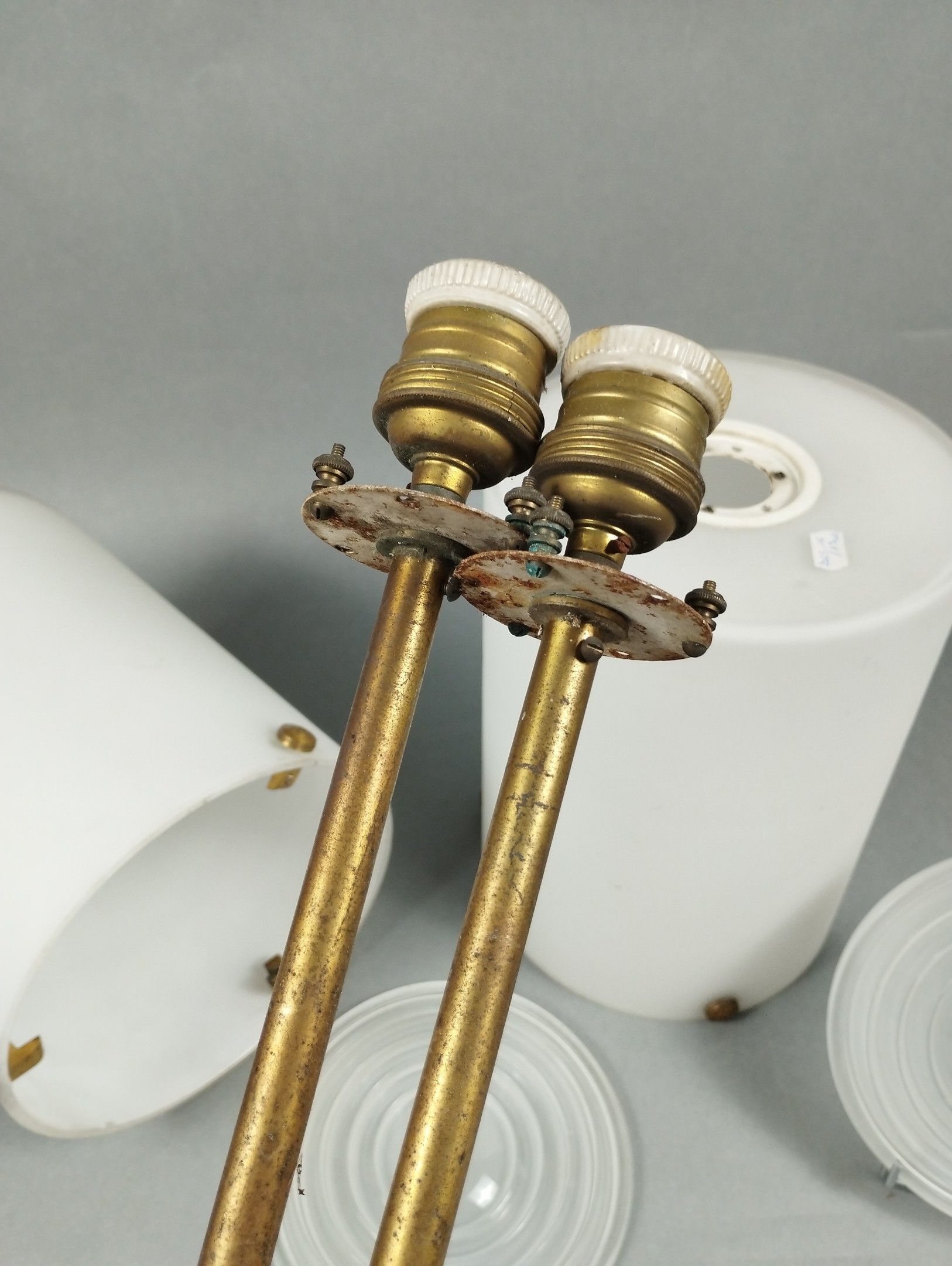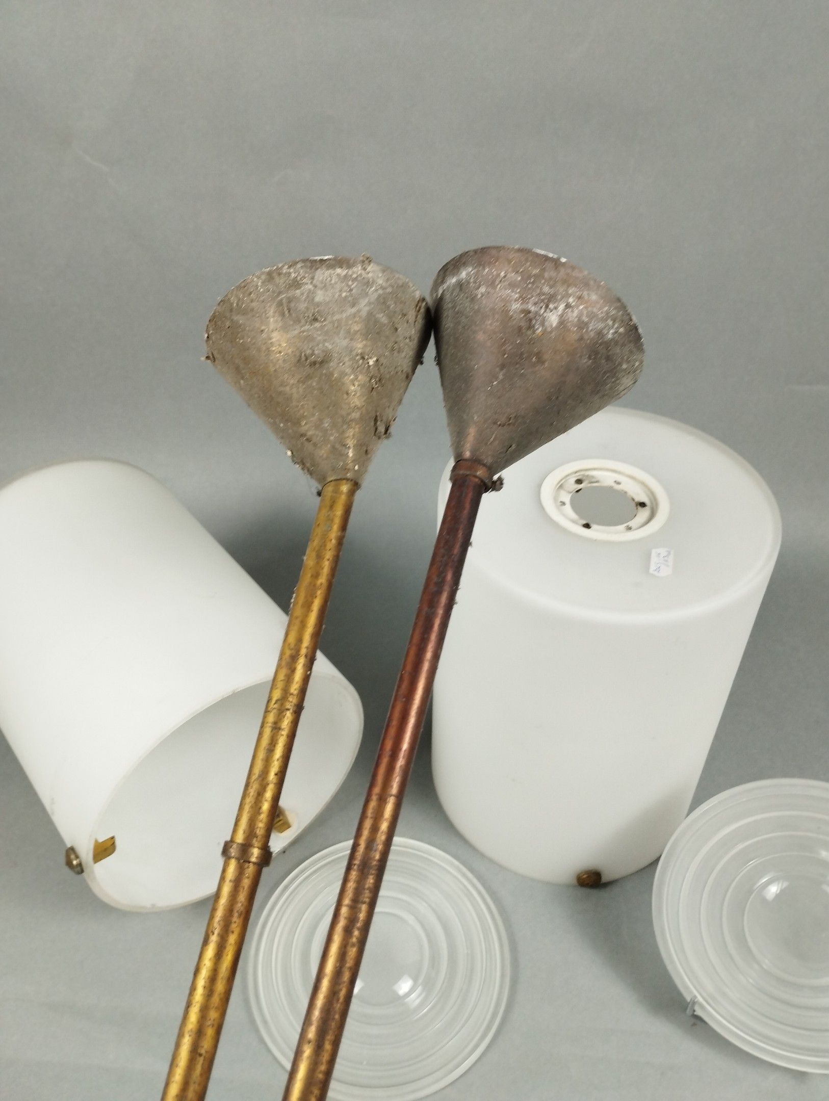 With brass fixing rods, complete with lampholders and covers (length 205 cm - can easily be cut to size). Height 28 cm - Diameter 20.5 cm (oxidation to the metal).
