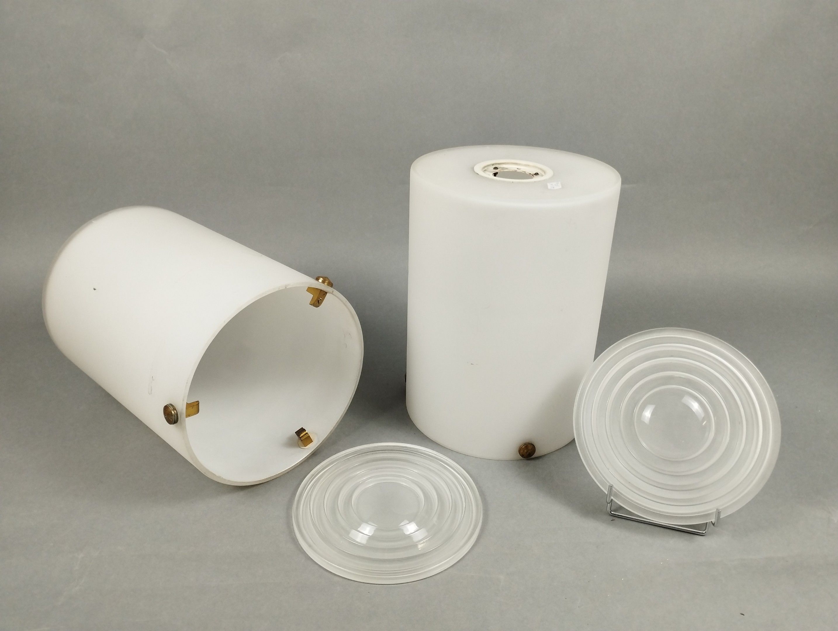 Jean PERZEL (1892-1986), Paris. Pair of ceiling lights-suspensions, model no. 2015, consisting of a cylindrical frosted glass bulb cover, the inner wall white, holding a Frénel type lens in pressed cast iron (varnished brass mounting). Upper mounting system in white lacquered metal. Purchased in 1957.