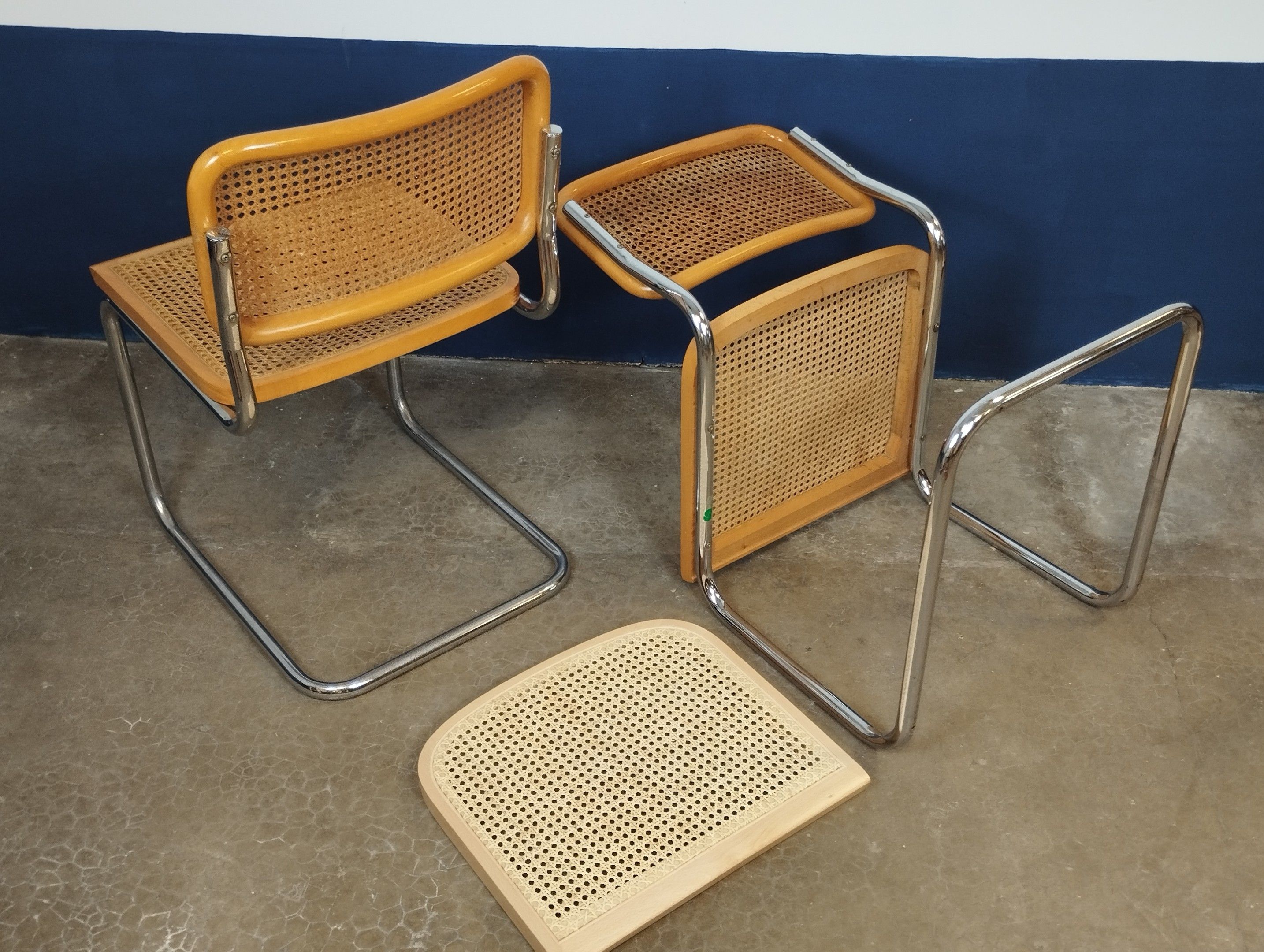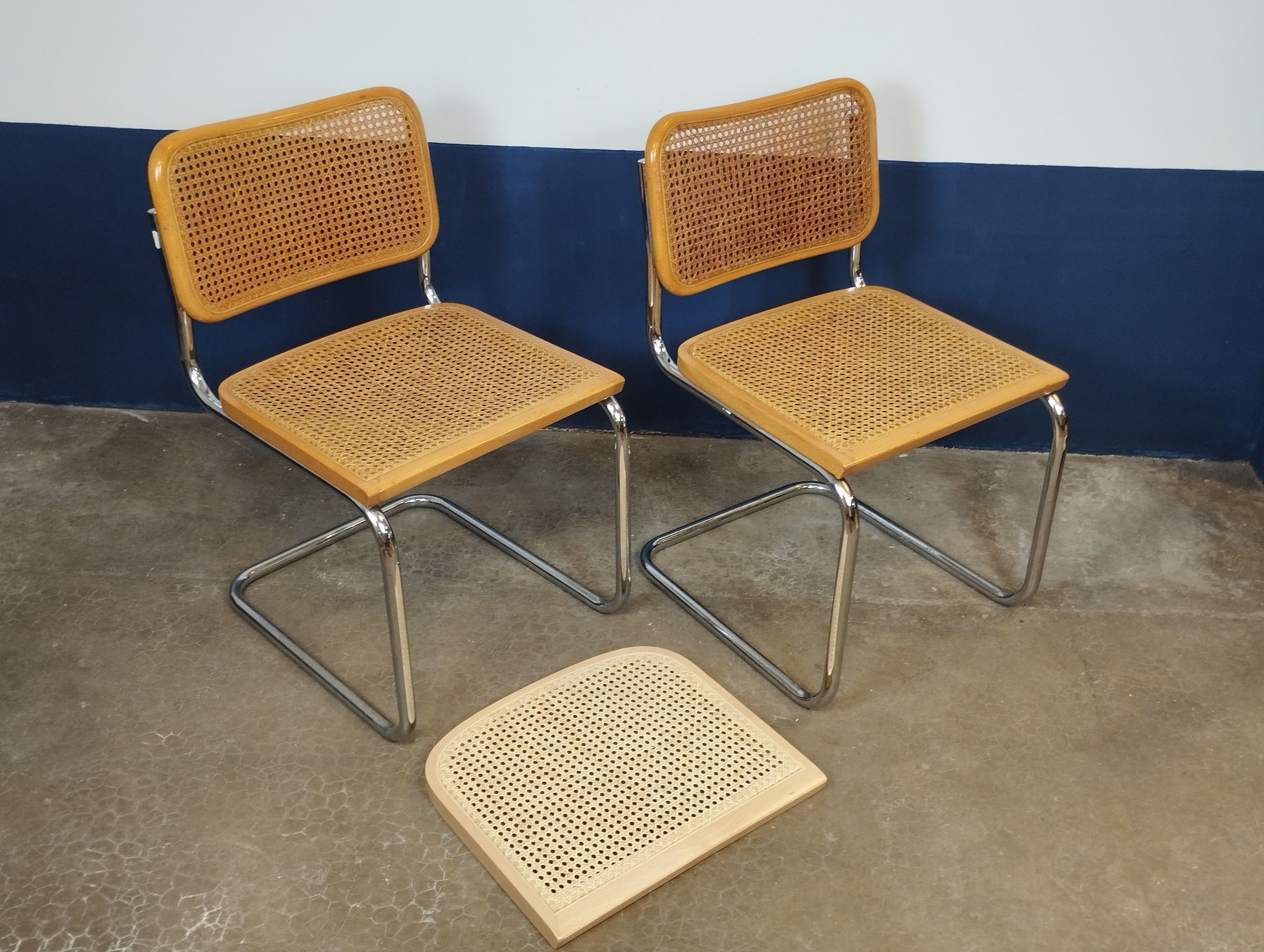Marcel BREUER (1902-1981) for Editions CIDUE. Two "Cesca B32" chairs (1925 model), natural wood colour. Chromed steel tubular frame; seats and backrests caned. Publisher's label on one. Habitat edition, 1975. Height = 79 cm. Joint: a spare seat.