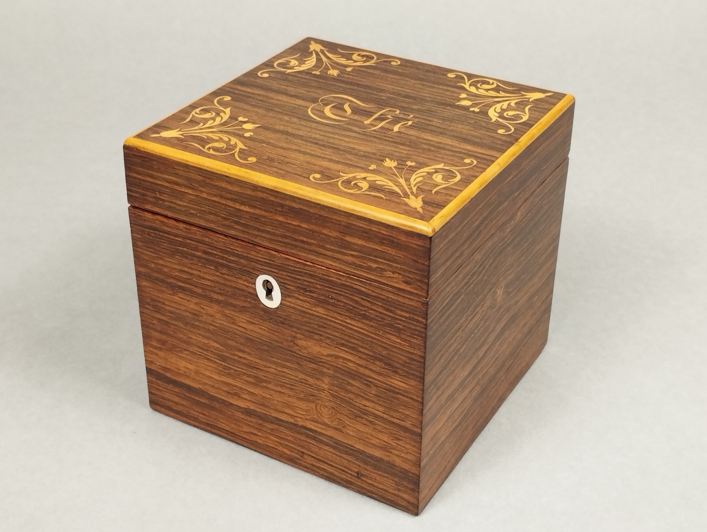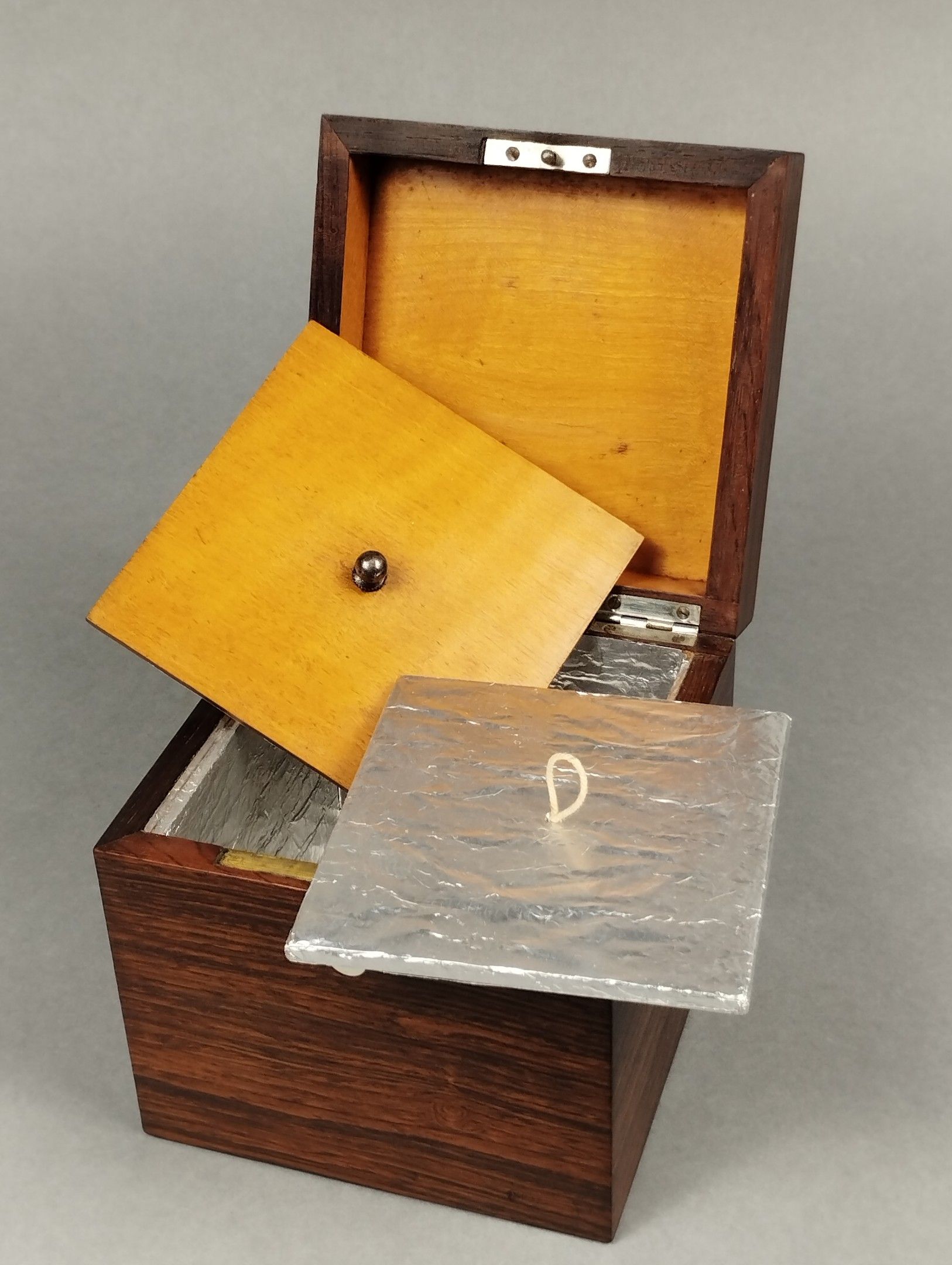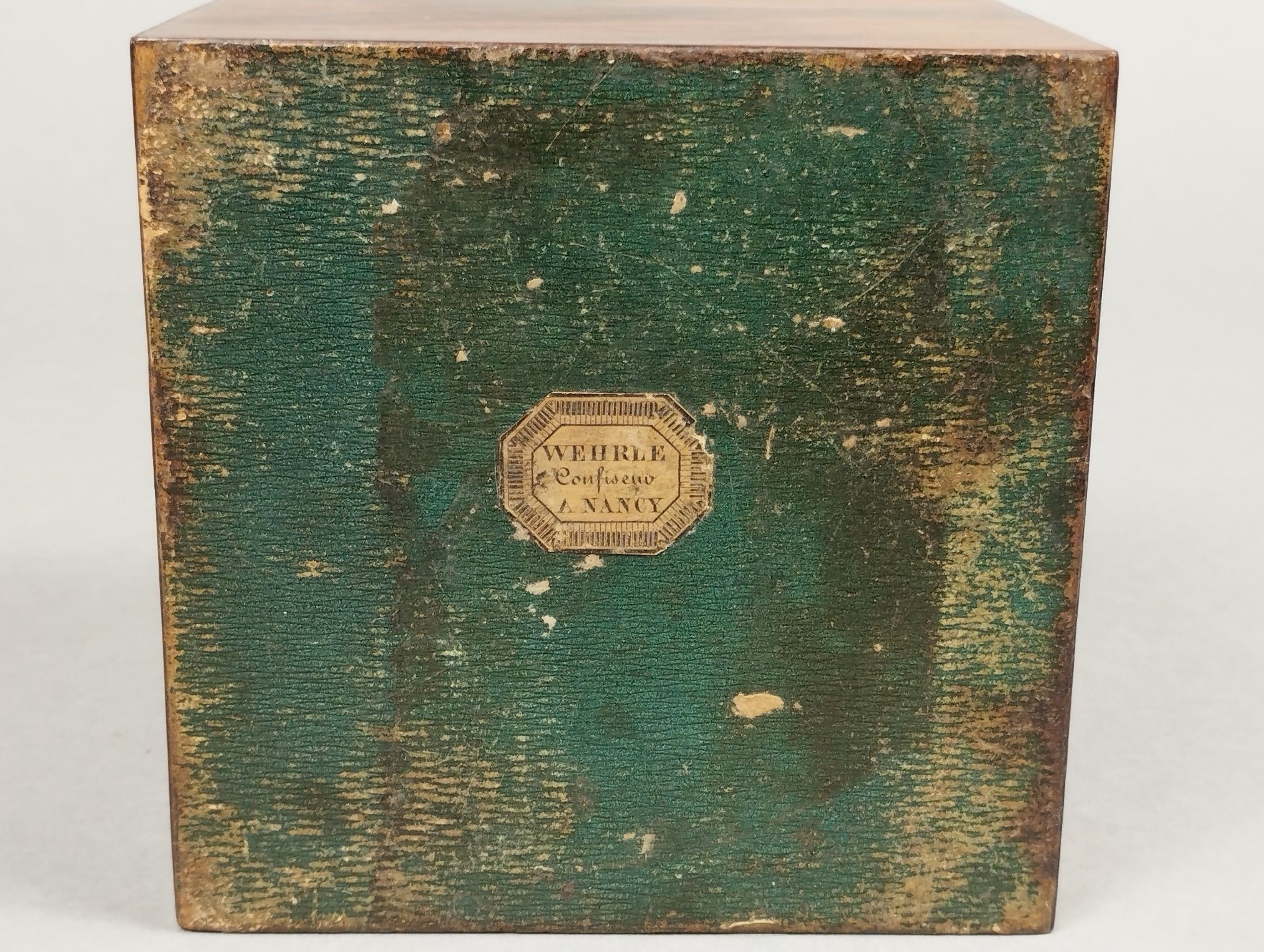 WEHRLE, confectioner in Nancy. Rosewood veneered tea caddy, complete with its two inner lids. Mid 19th century. 12 x 12 x 12 cm.