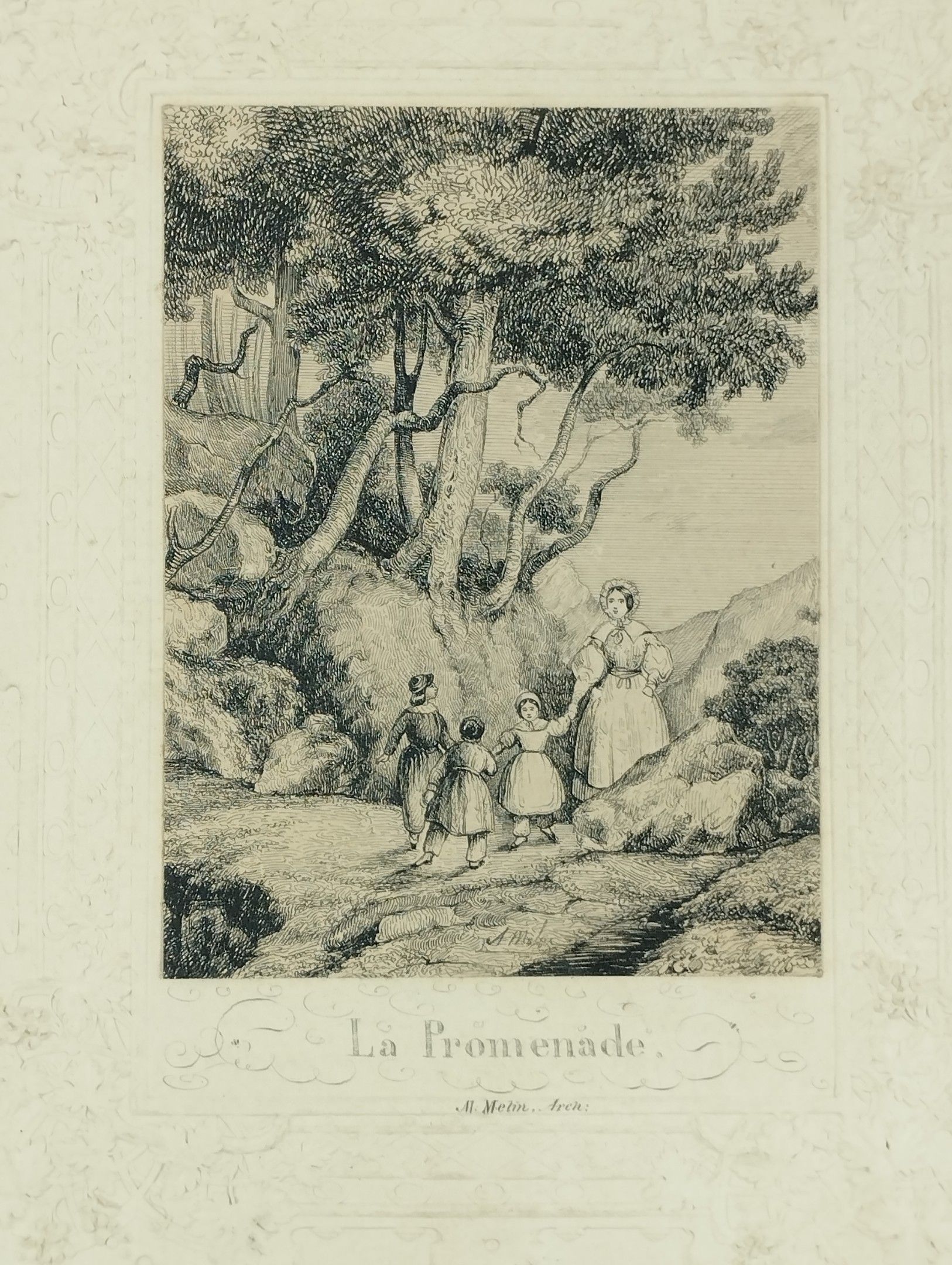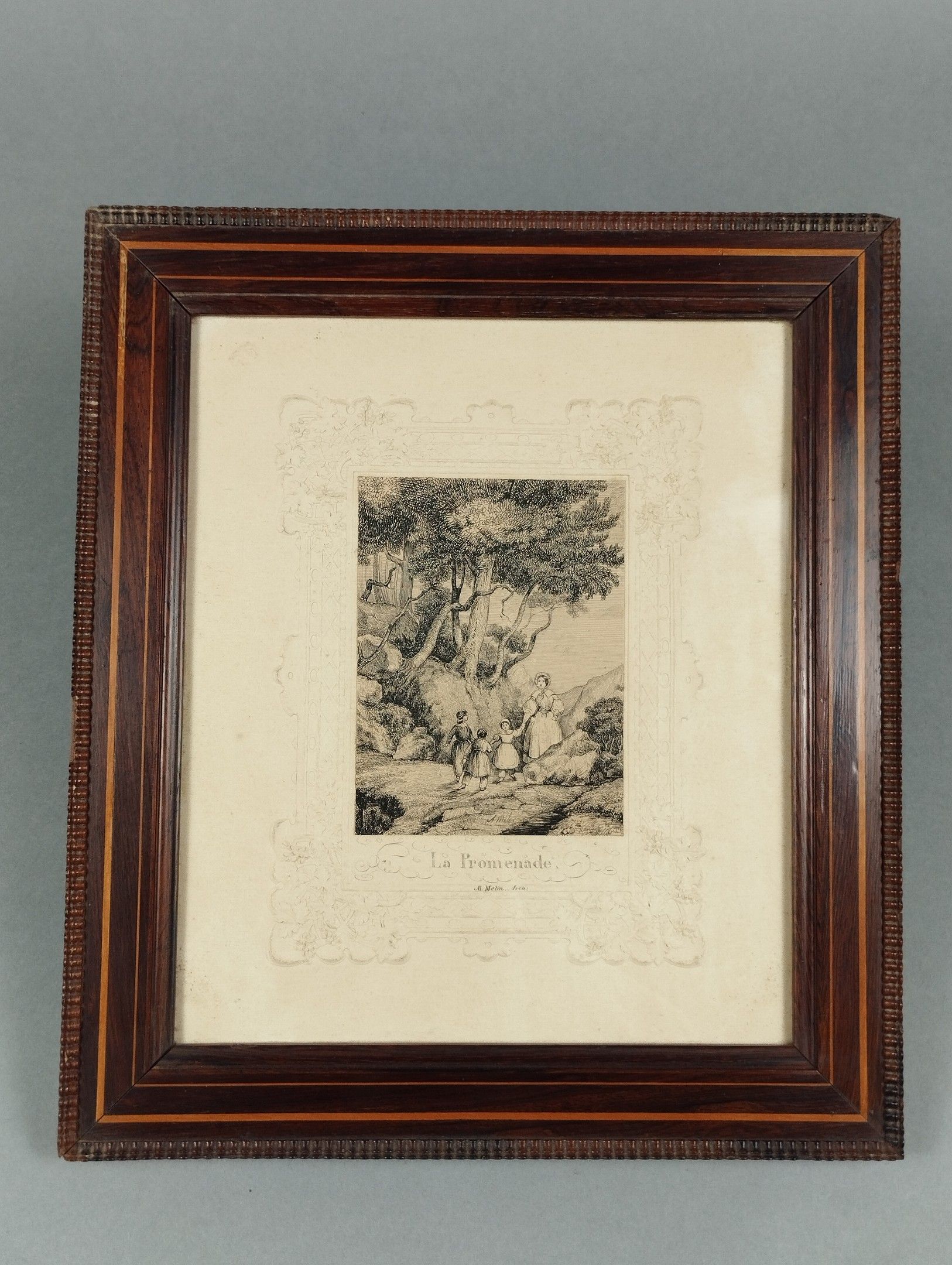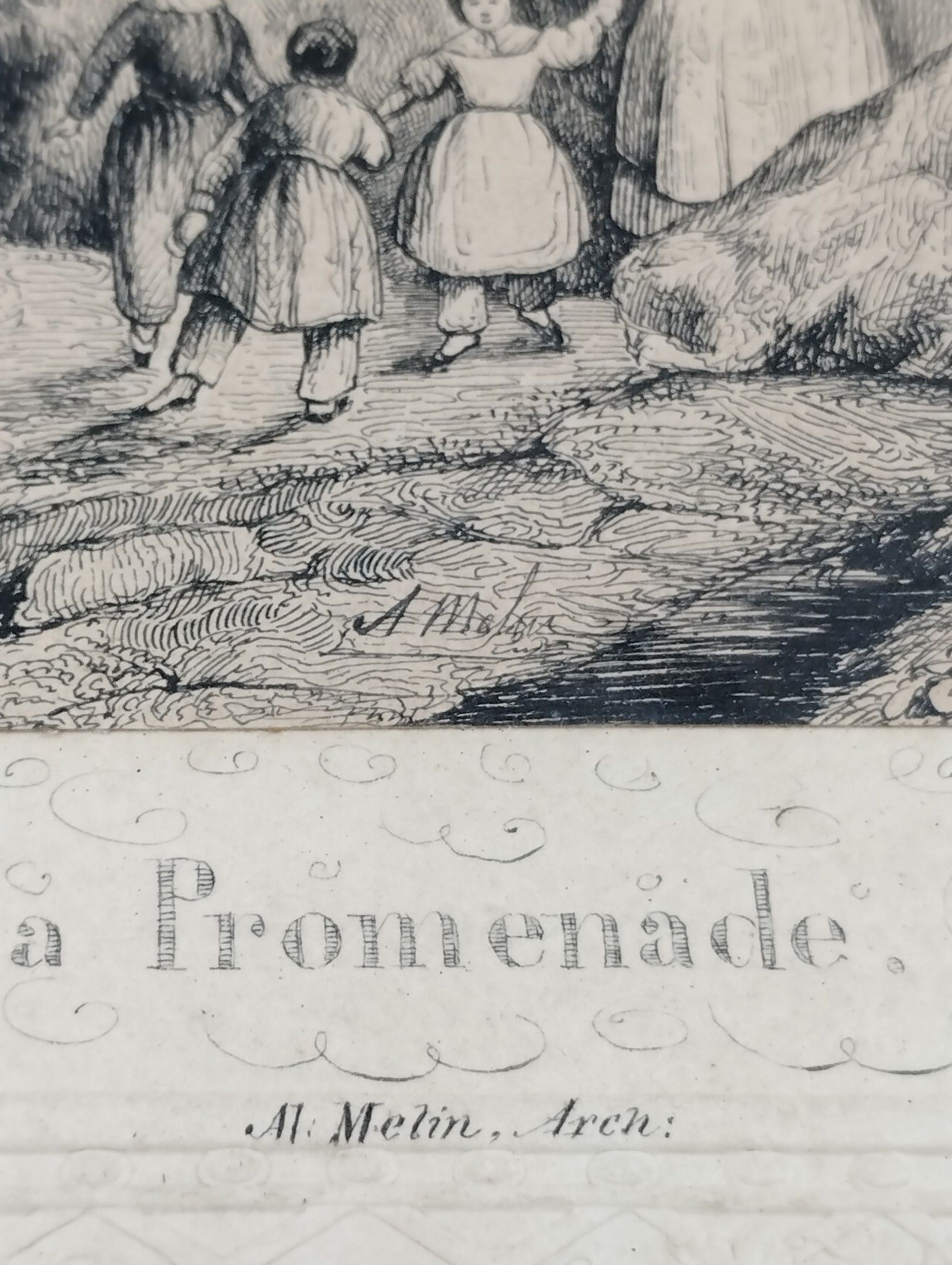 Alexandre-Claude MELIN (1818-1876). The Promenade. Pen drawing on paper, in its original embossed paper and rosewood frame. Signed. About 1840-1850. 34.5 x 30.5 cm (frame).