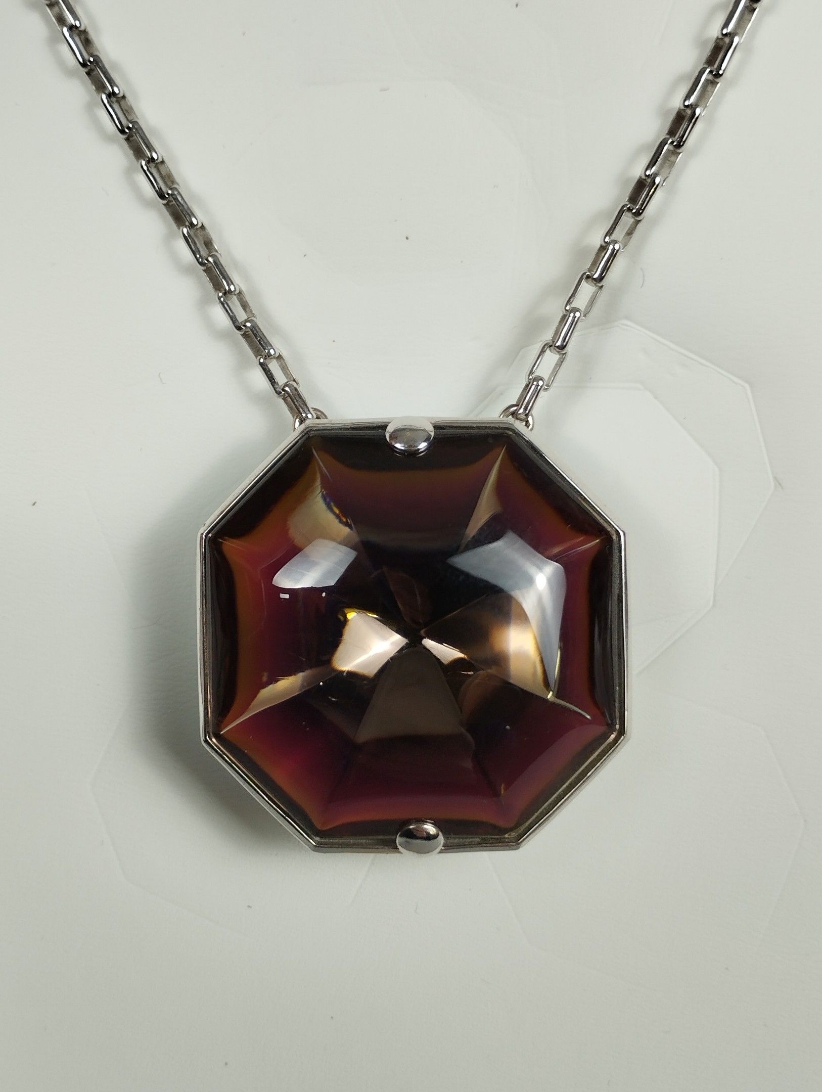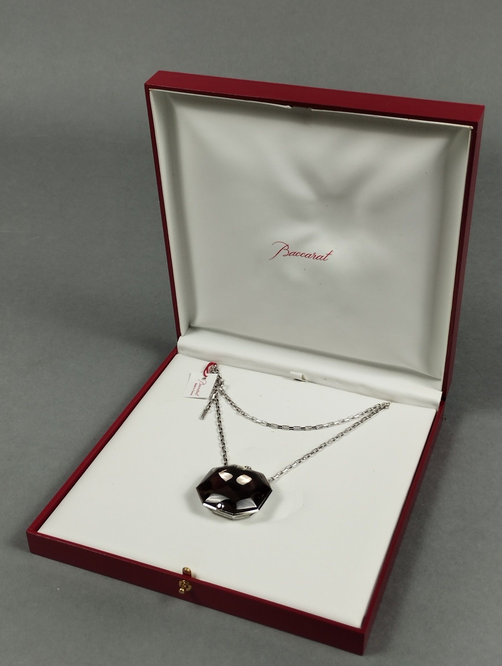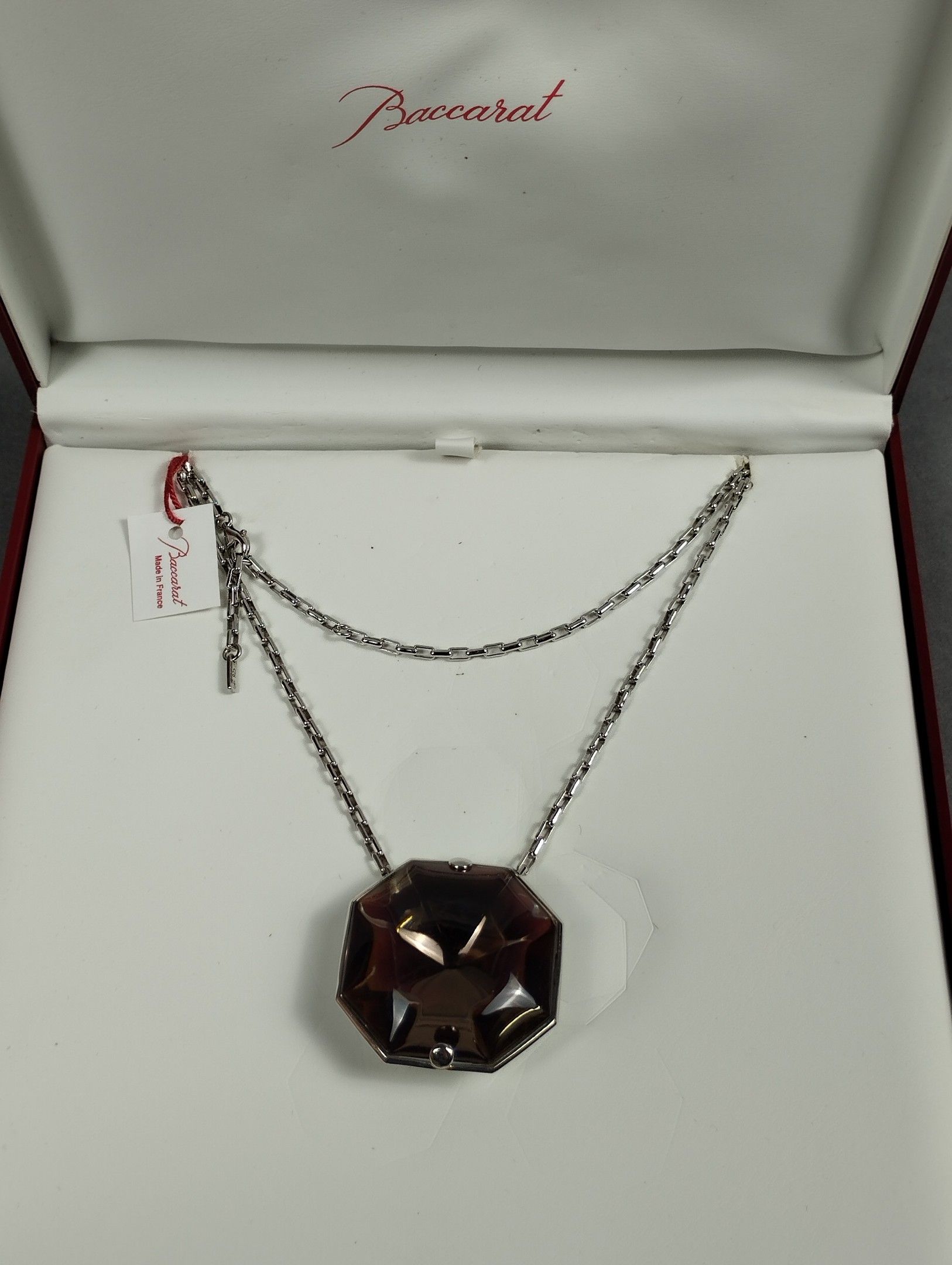 BACCARAT. Silver sautoir necklace (925/00 - British made for Baccarat, London hallmark and letter-date for 2013) holding a large octagonal cognac-coloured crystal. Perfect condition and with its original case.