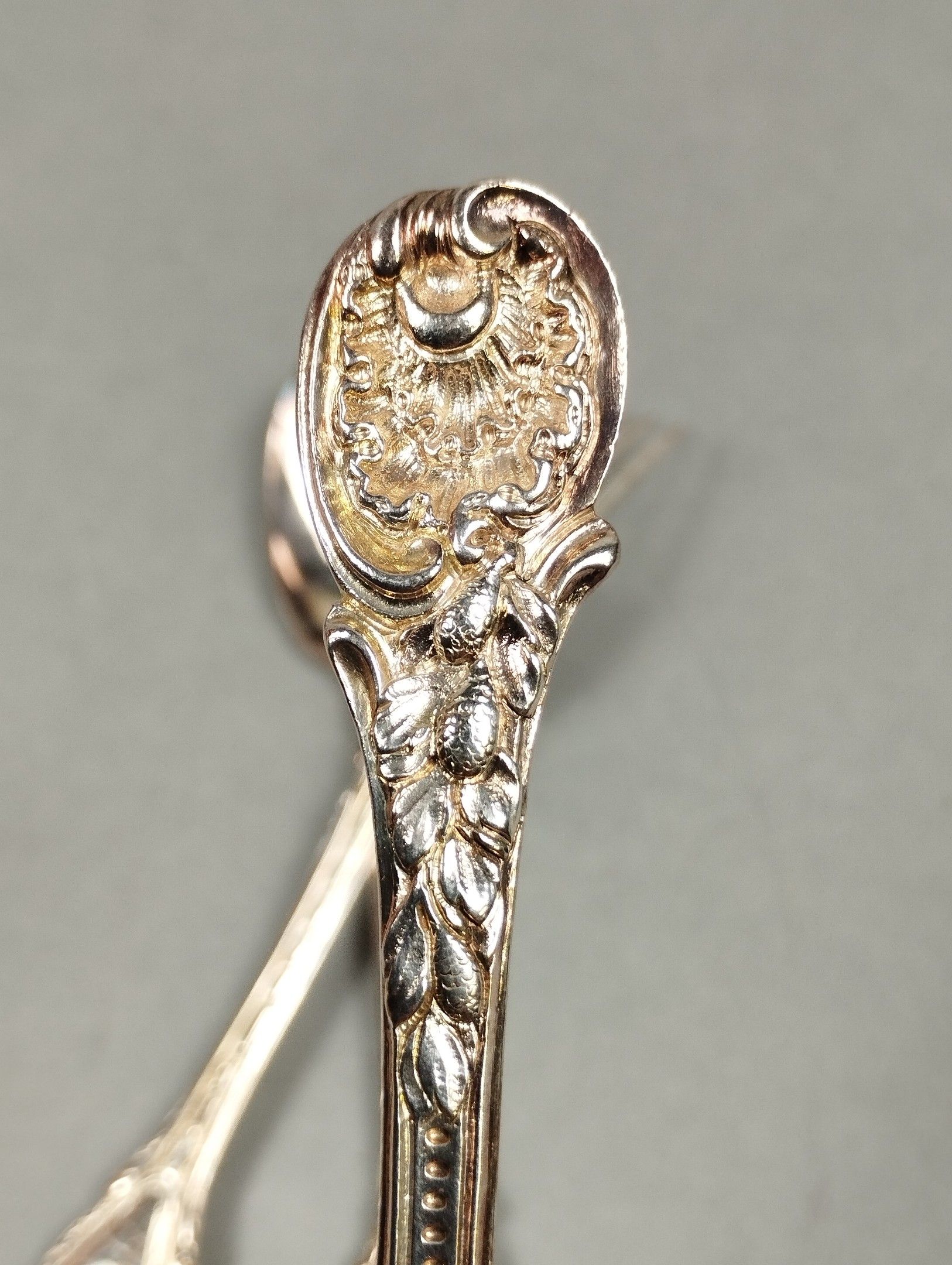 ANCIEN REGIME, Paris, AJC goldsmith. Set of two silver flatware, with rich rocaille shell and foliage decoration. Hallmarks of charge (flowers: small, 1768-1774), of discharge (helmeted head: medium, 1768-1774), of the common house (F crowned: 1769) and of goldsmith. Weight: 310 g.