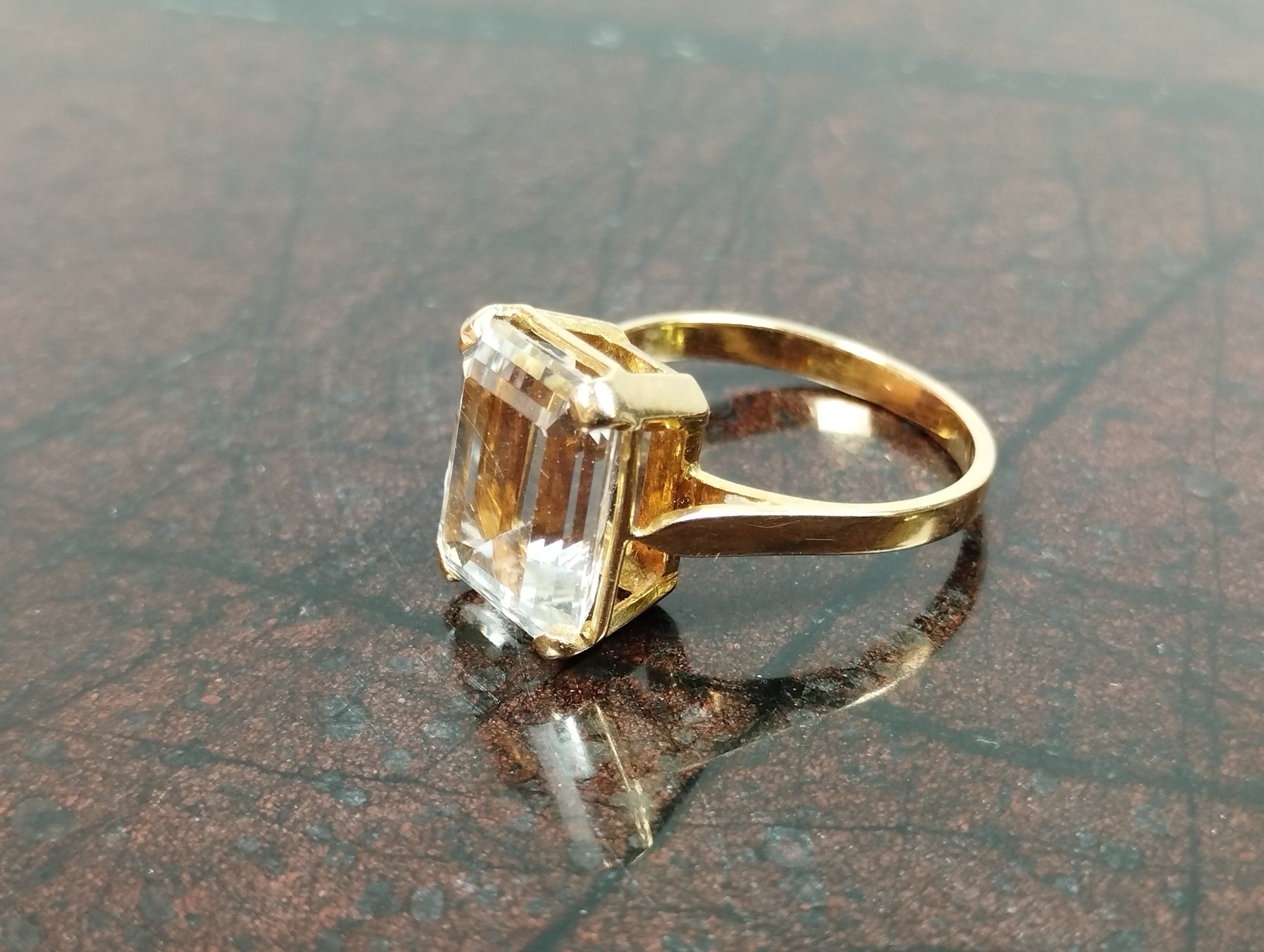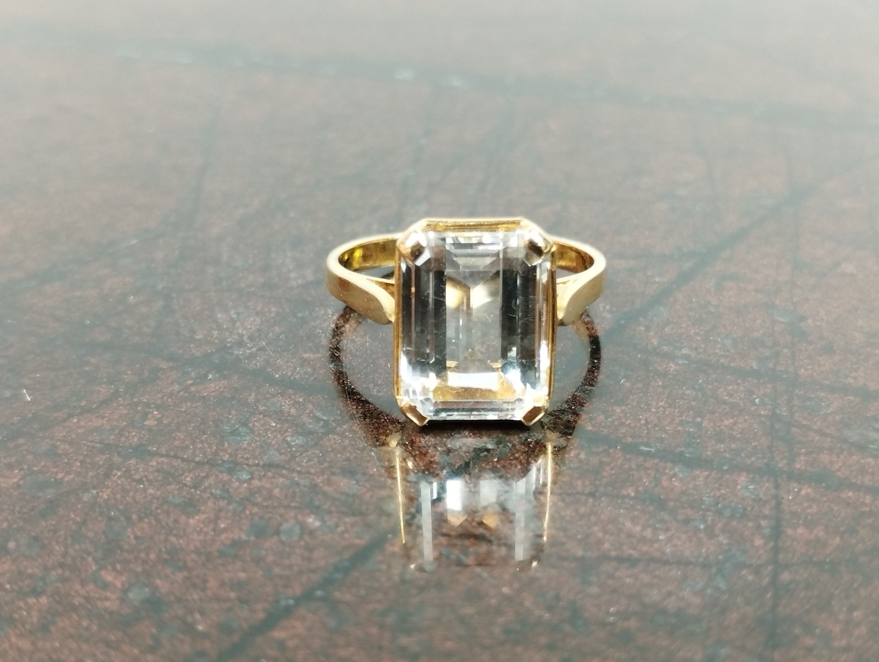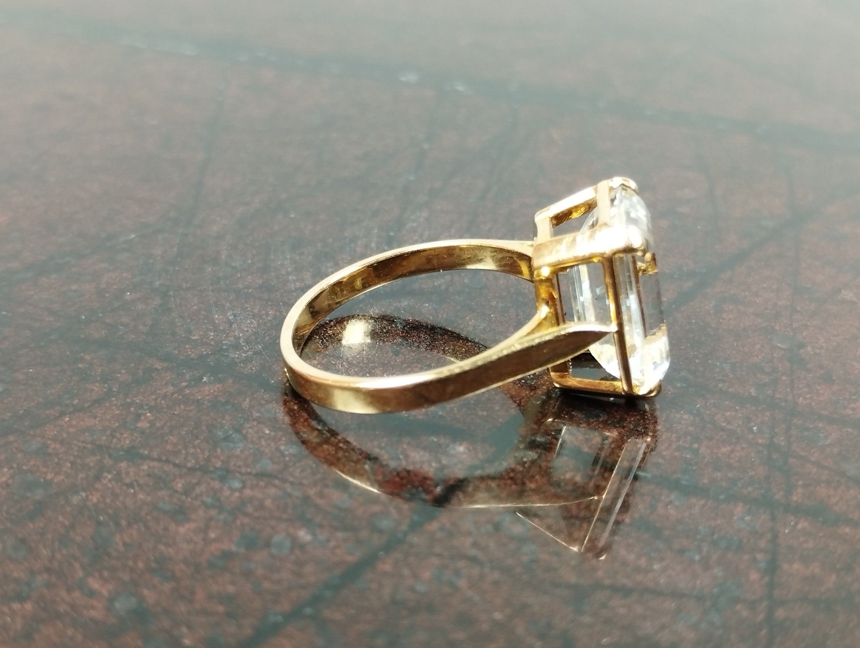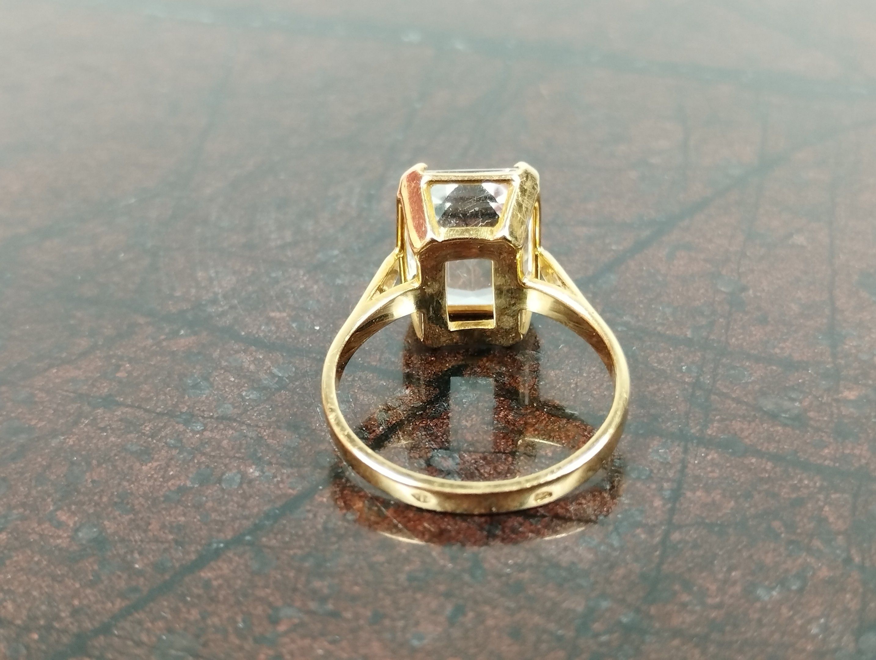 Ring, set with a rectangular aquamarine (9 x 12 mm.) in yellow gold (750/00). Gross weight: 4.93 g. TDD: 54.
