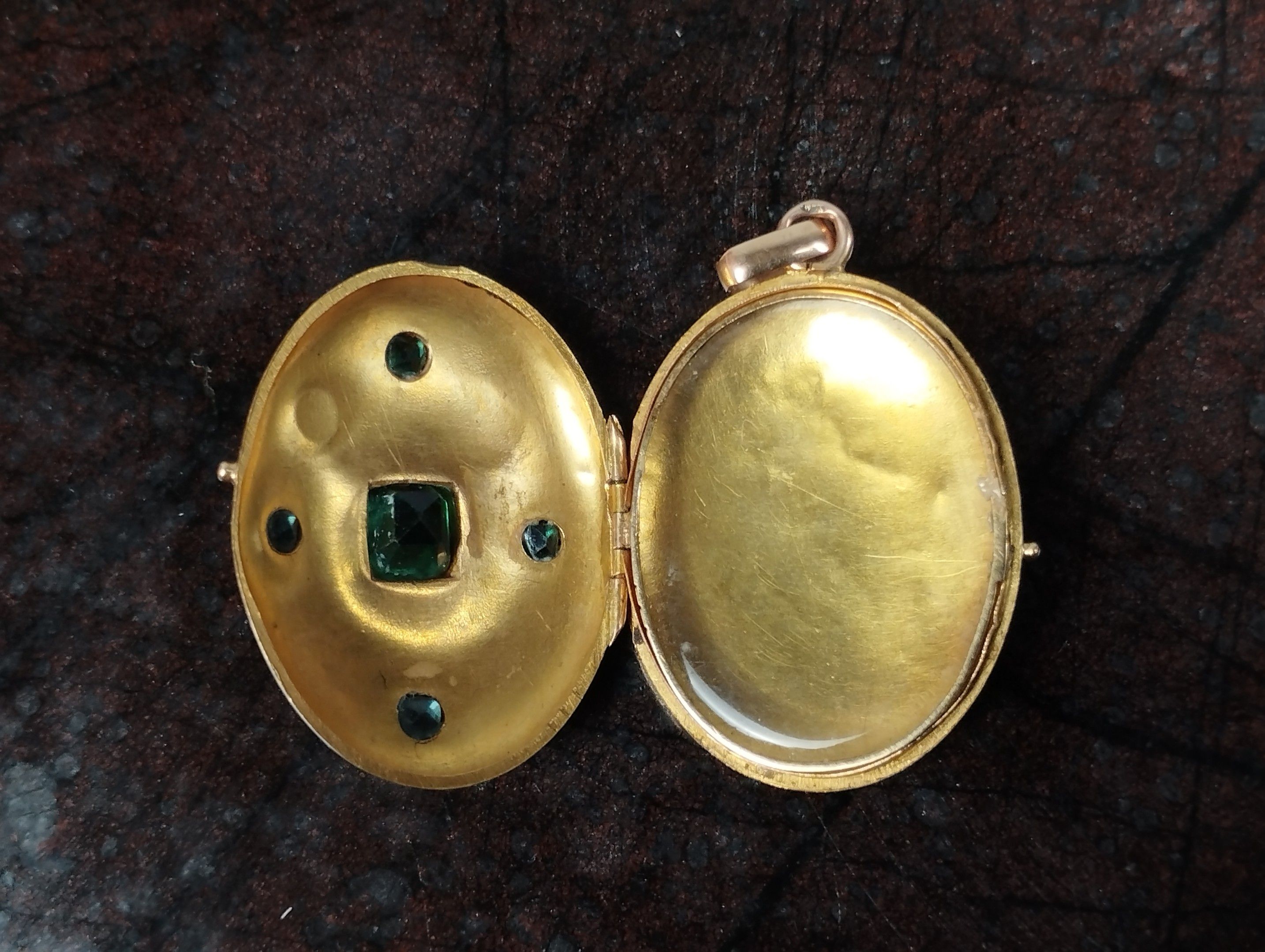 Oval photo pendant in yellow gold (750/00), delicately chased, set with imitation green stones and half pearls. Late 19th century. Gross weight (with glass): 7.20 g; H. = 30 mm.