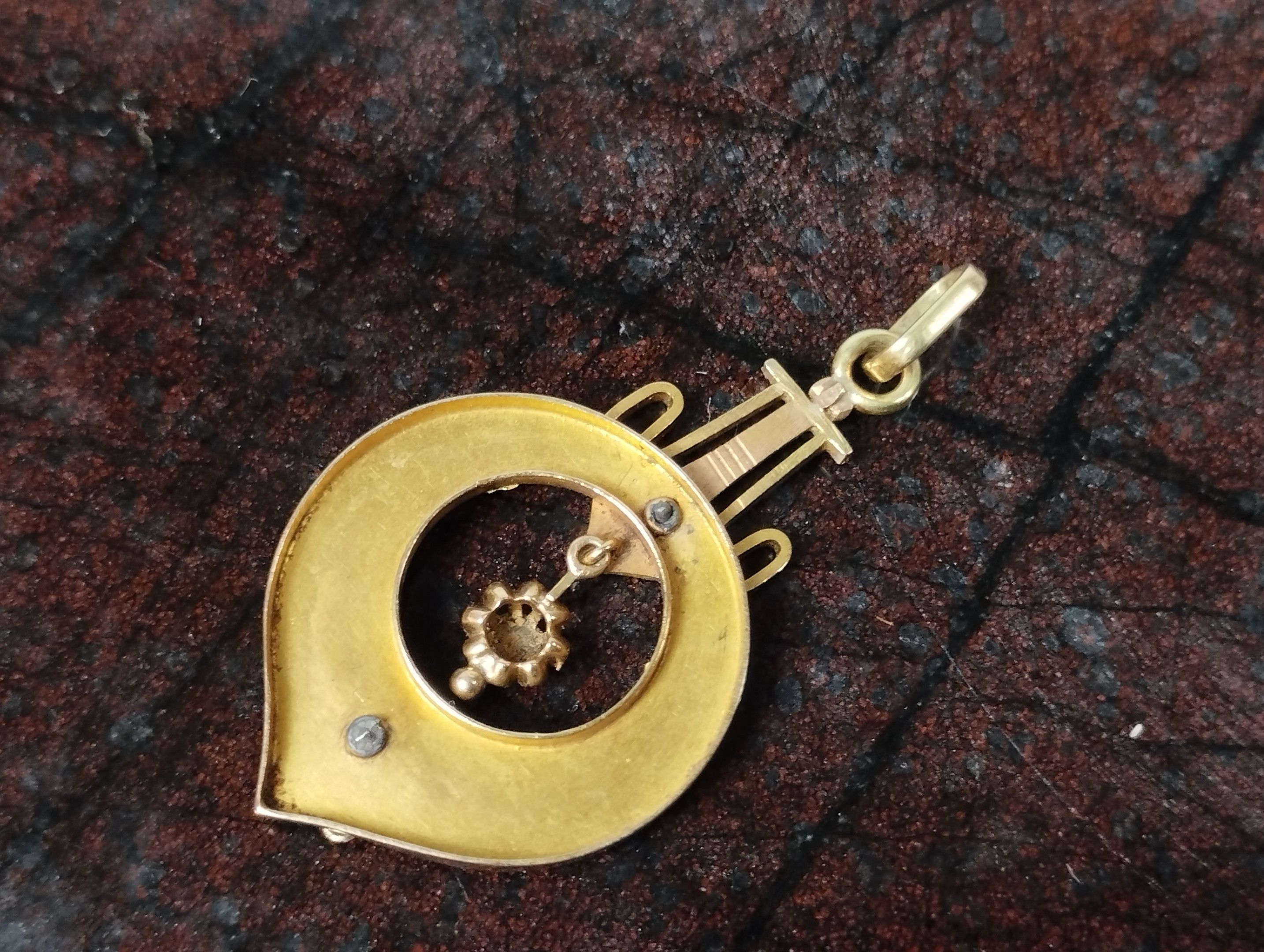Lyre-shaped pendant in three-tone (750/00) chased gold, decorated with a garland of flowers and set with a half-pearl pendant in the centre. Late 19th-early 20th century. D. = 3.03 g.; H. (without setting): 35 mm.